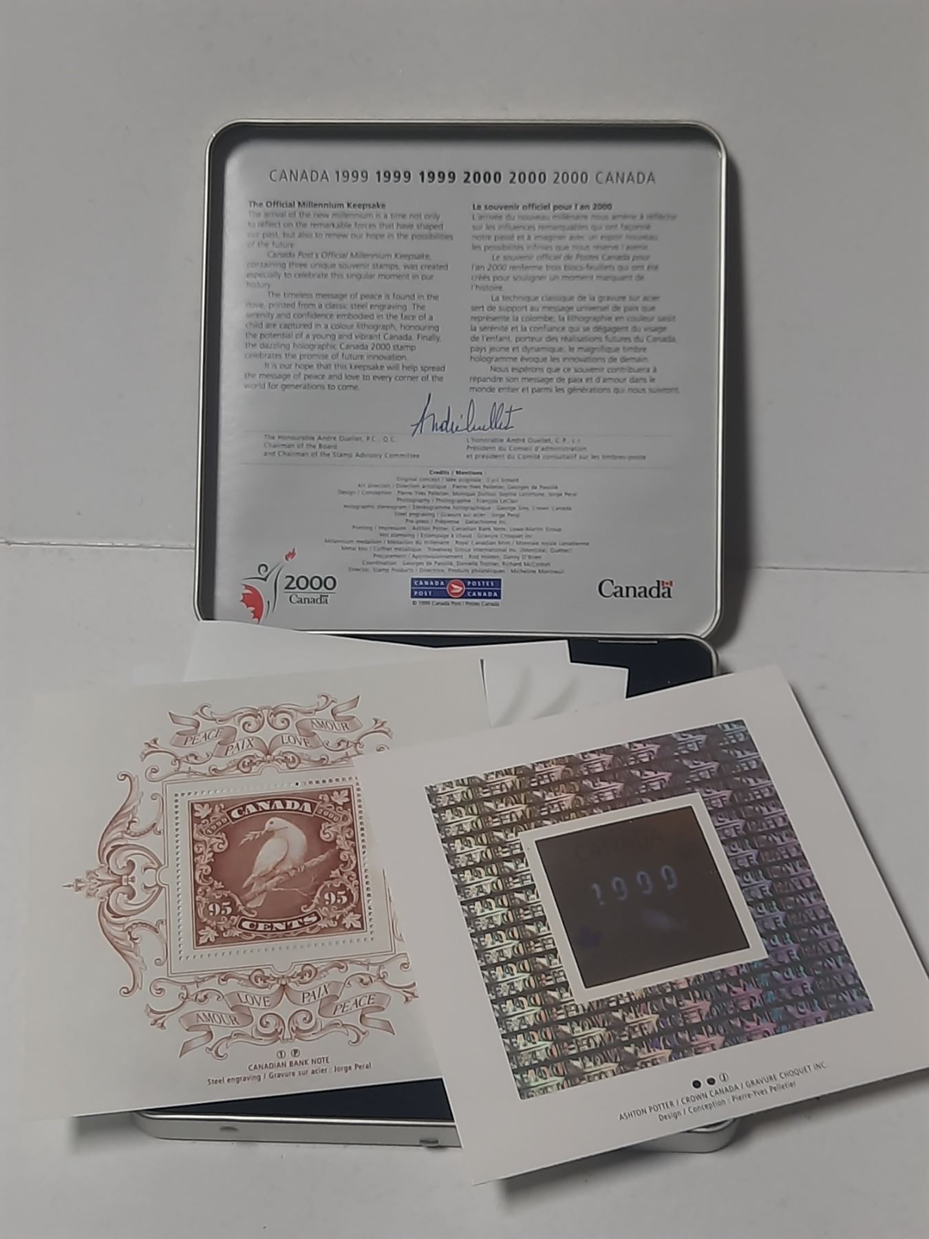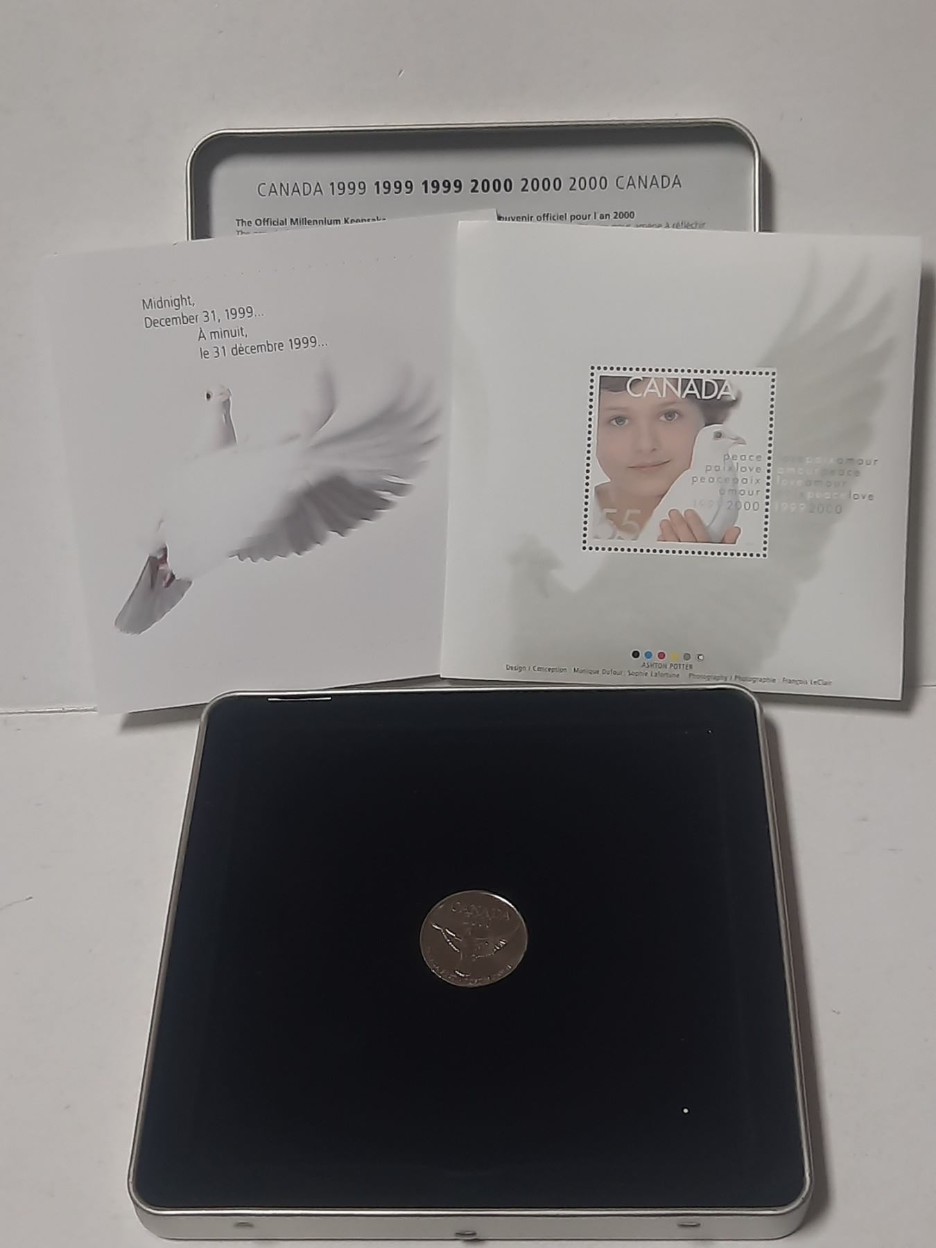 1999 – 2000 Official Millennium Keepsake issued by Canada Post. Contains 3 stamps plus a Dove Medal.