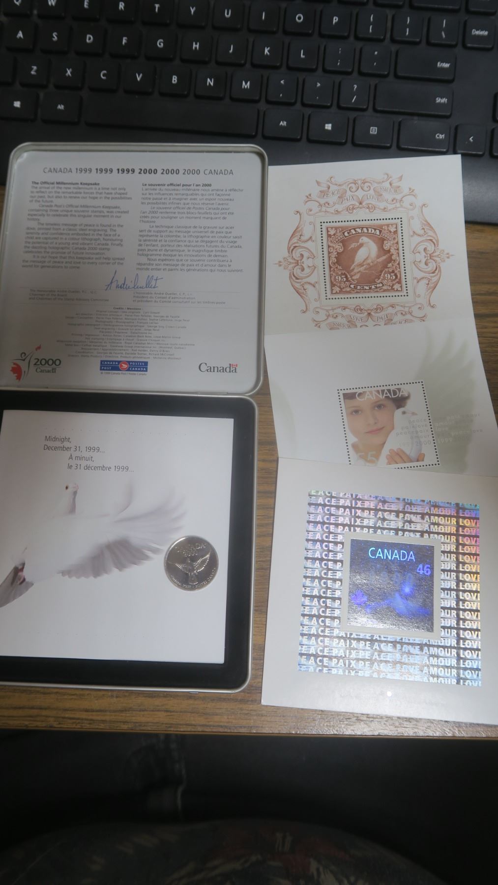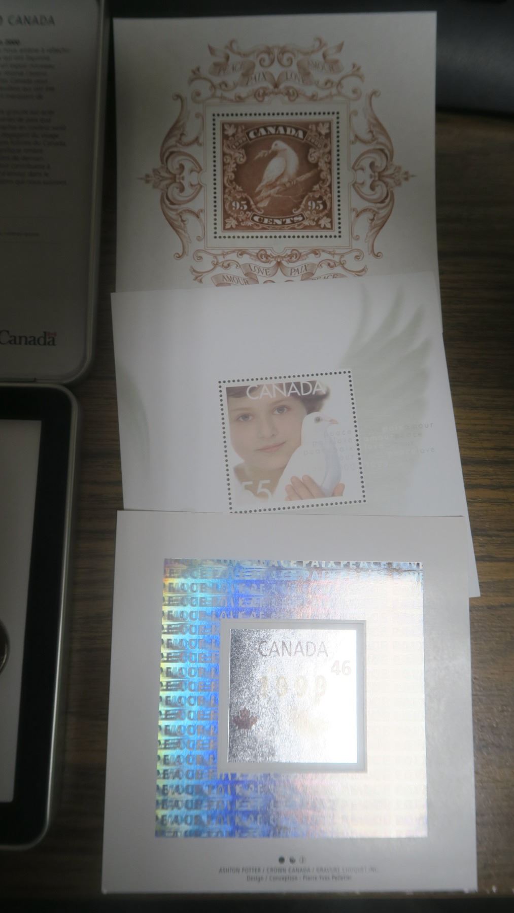 1999 Official Millennium Keepsake. Issued by Canada Post. Contains 3 Stamps and 1 Canada Post Dove Medal. Housed in its original case of issue.