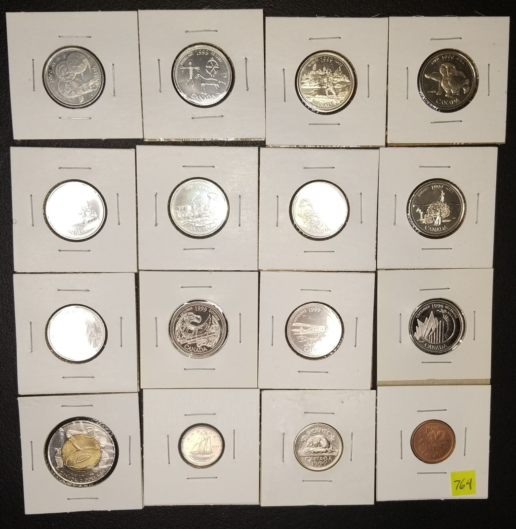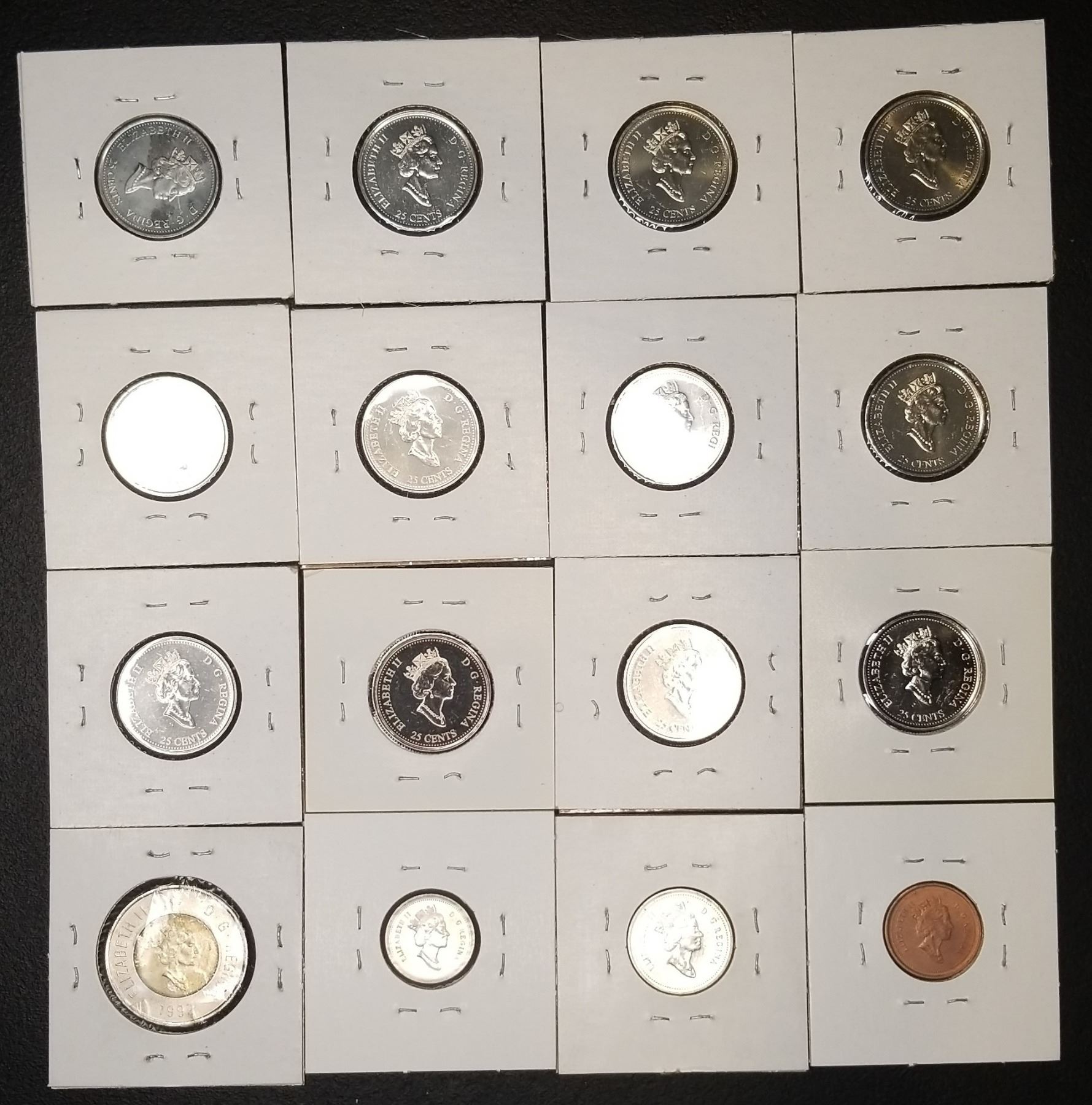 1999 Sixteen Coins Toonie, 12-Quarters, Dime, Nickel, Penny in Binder Page