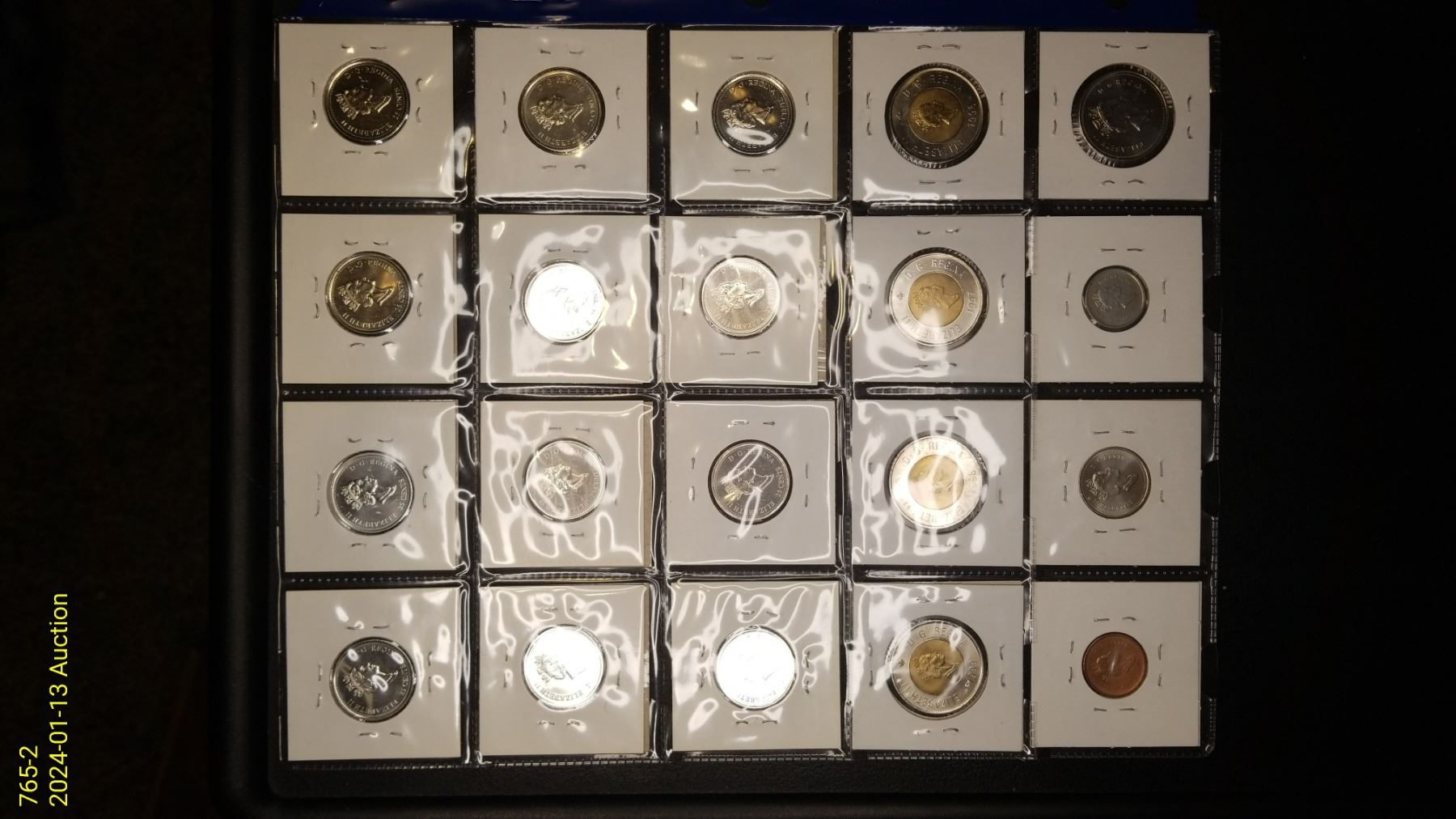 1999 Twenty Coins 4-Toonies, Fifty Cent Piece, 12 Monthly Quarters, Dime, Nickel, Penny in Binder P
