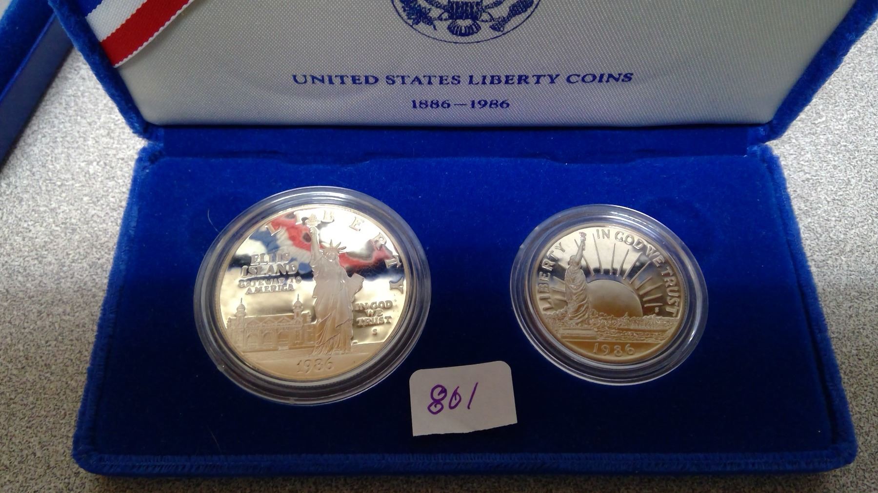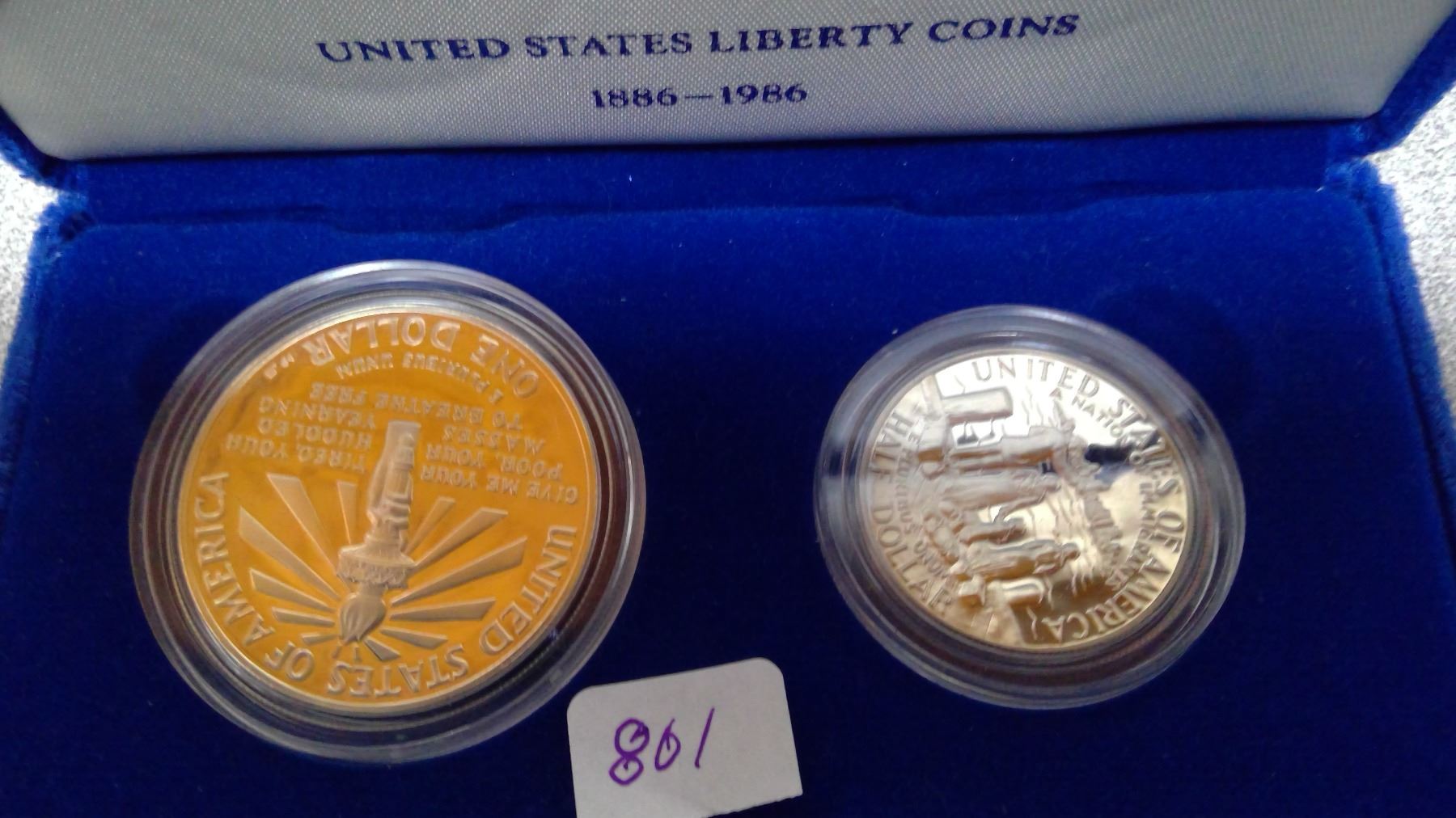 2 $1 and 50 cent US" Liberty coins" 1886-1986 Silver Original Case and box Uncirc.