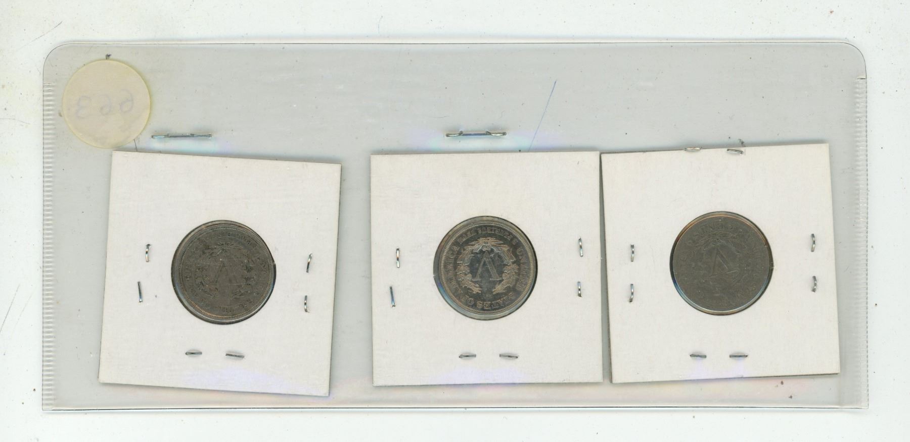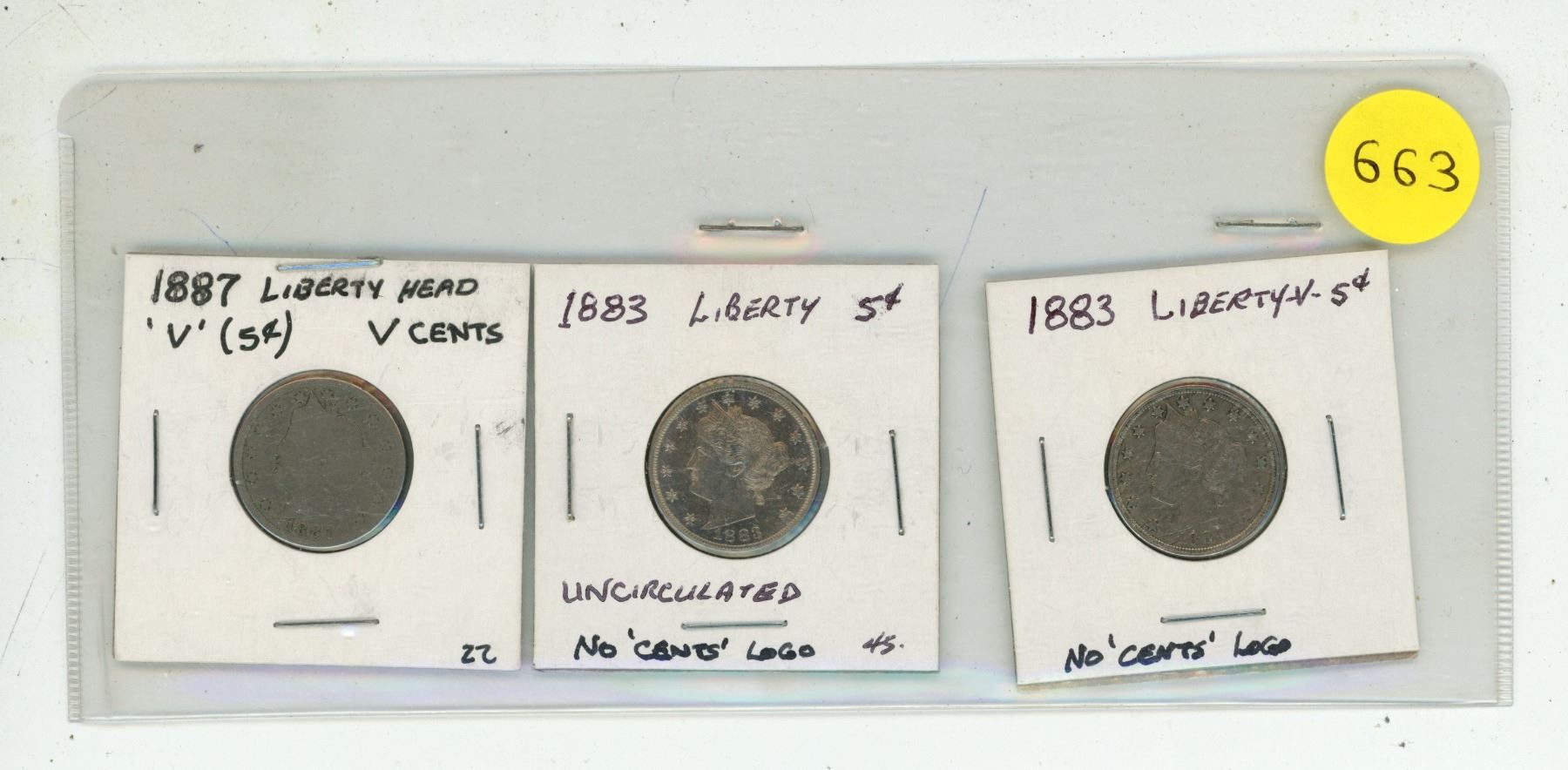 (2) 1883 U.S.A. "No Cents Logo" Liberty Head V Nickels and 1887 U.S.A. Libertu Head V Nickel.