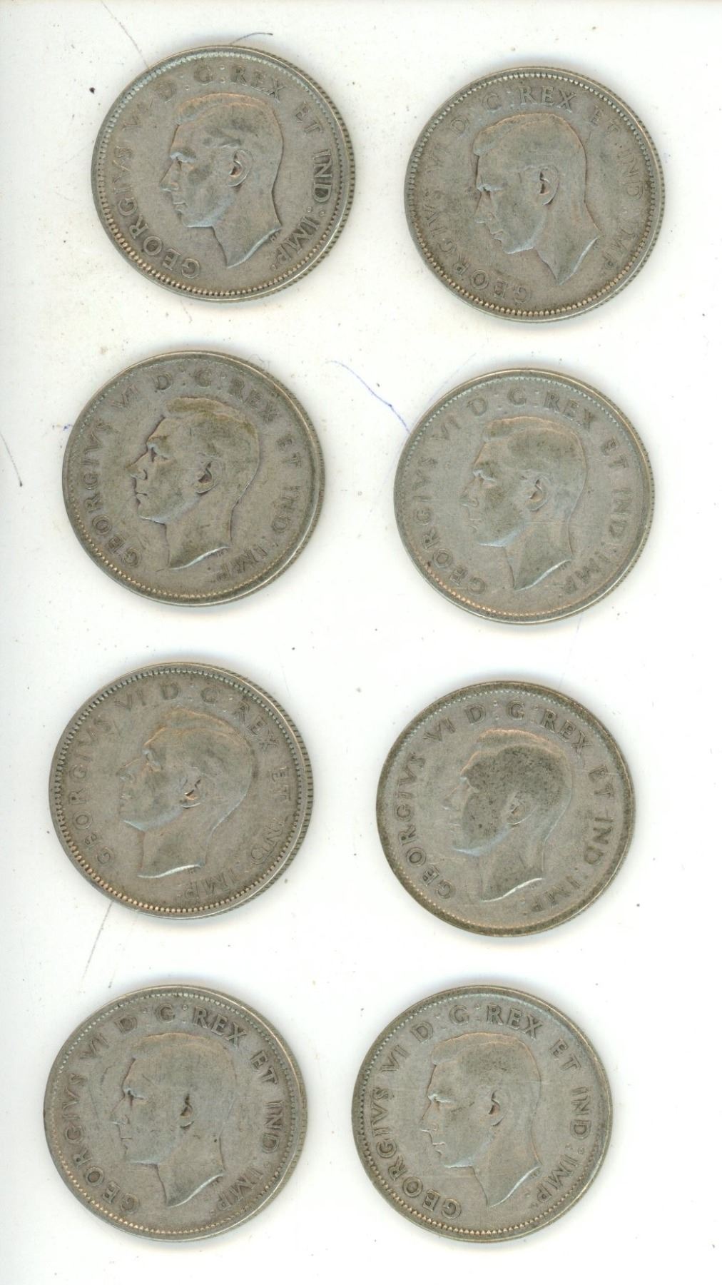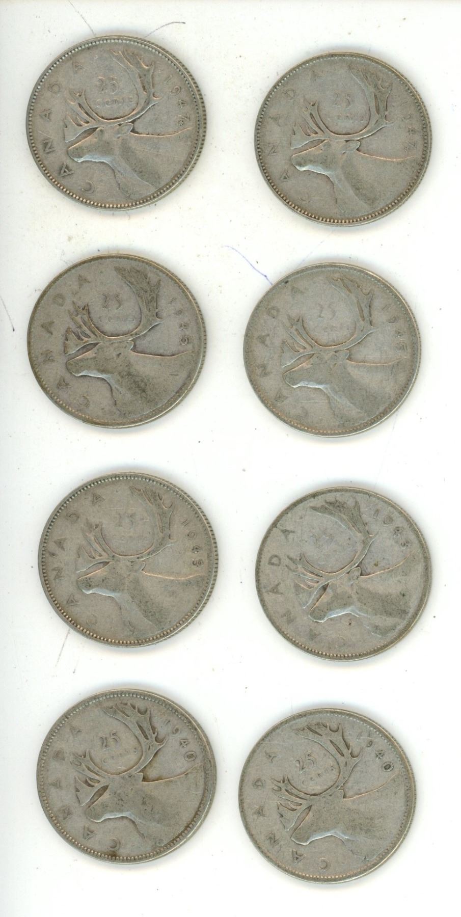 (2) 1940, (2) 1943, (2) 1945, (2) 1947 Canadian Silver 25 Cents Coin.
