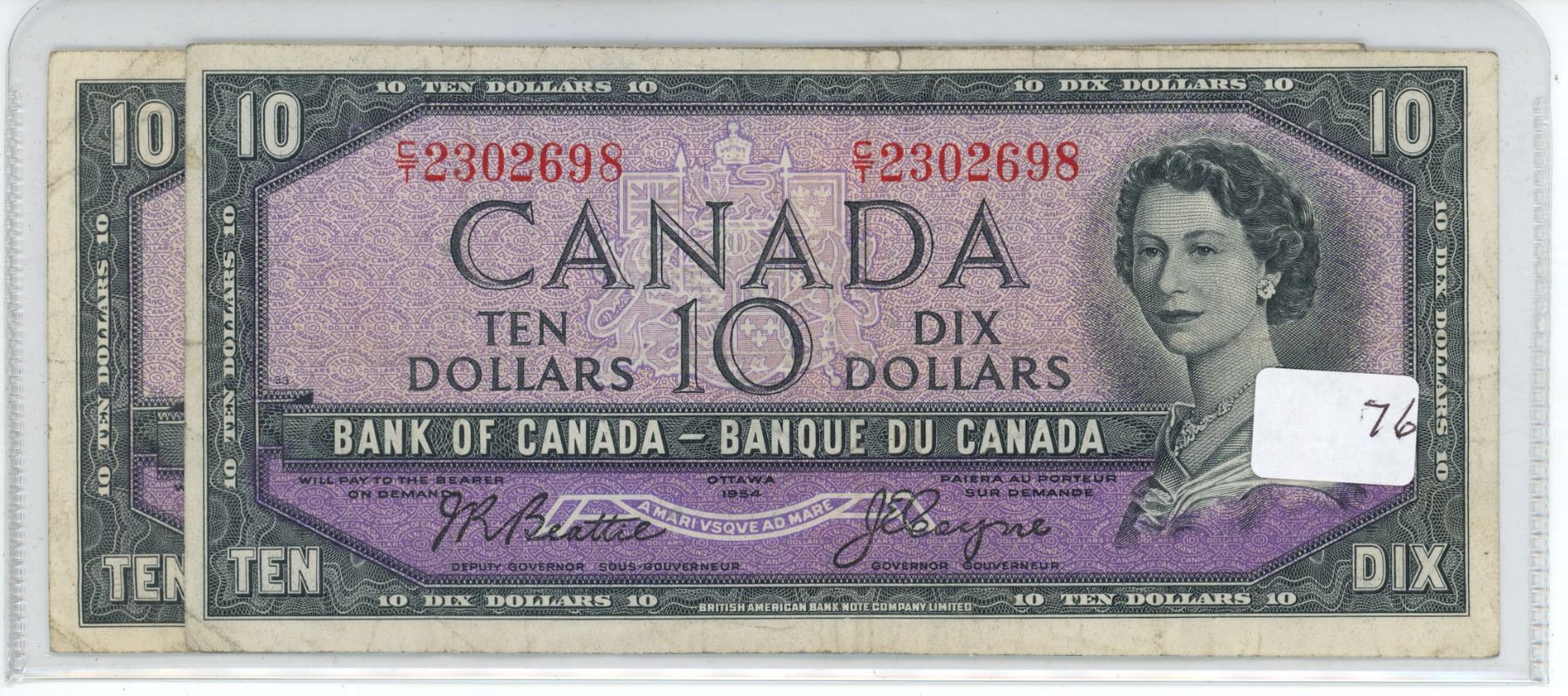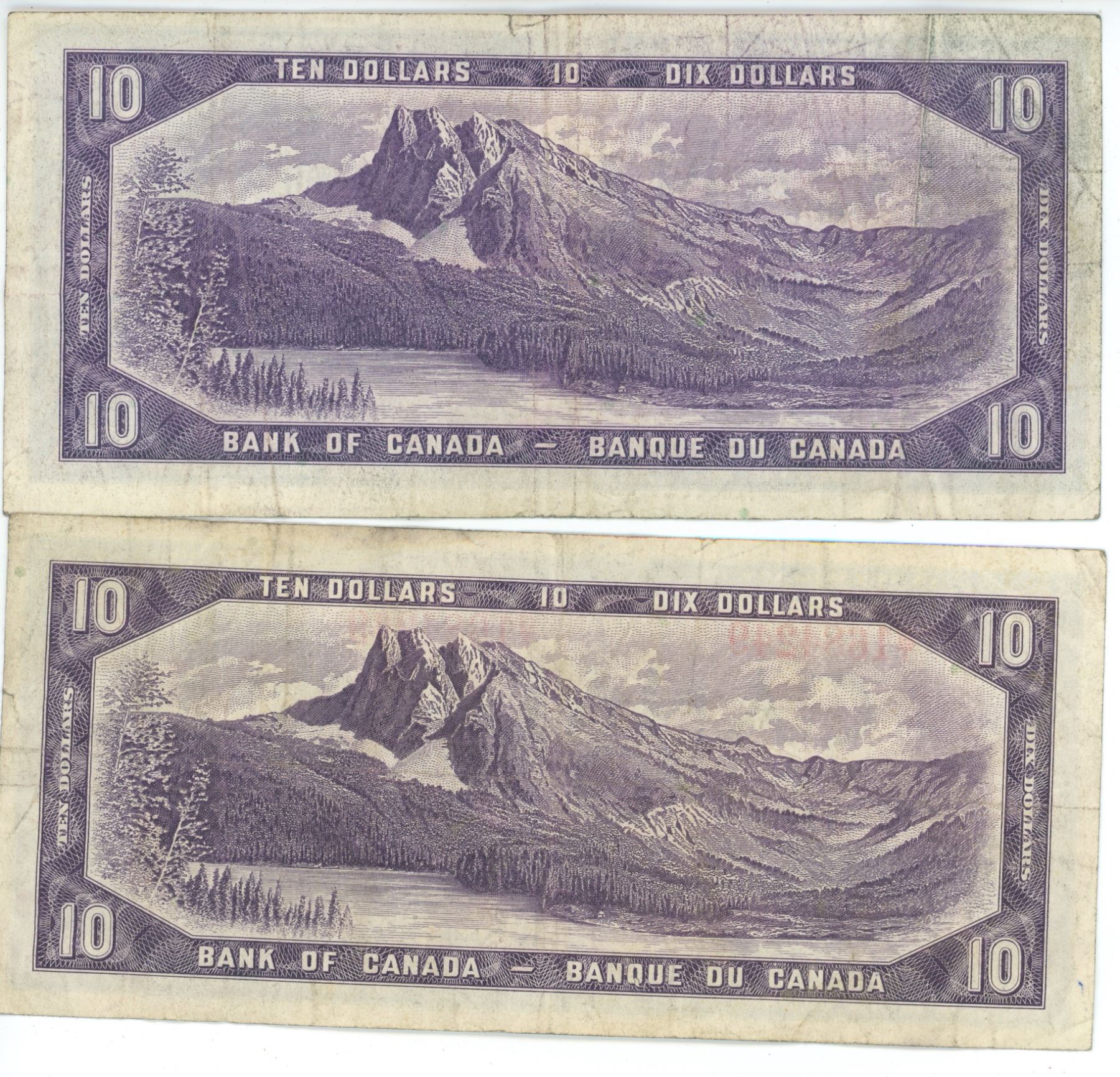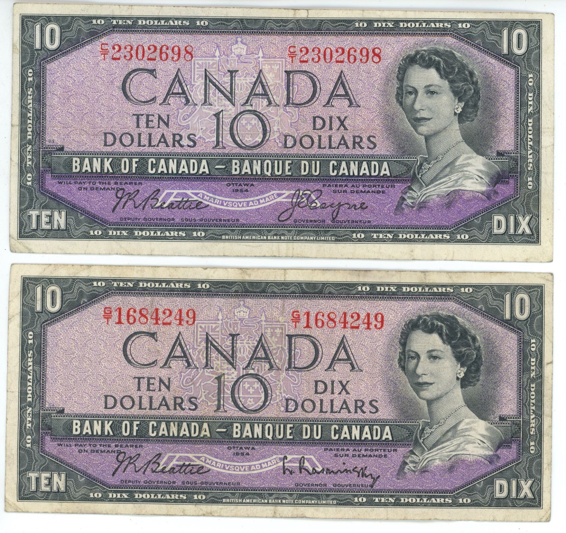 2 - 1954 Canadian 10 dollar bills