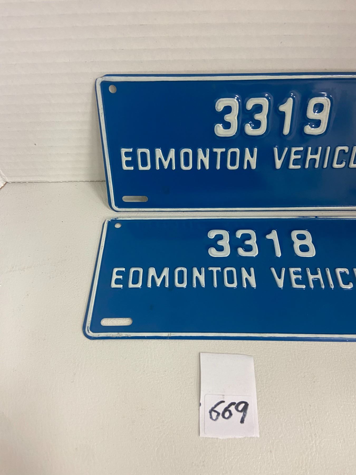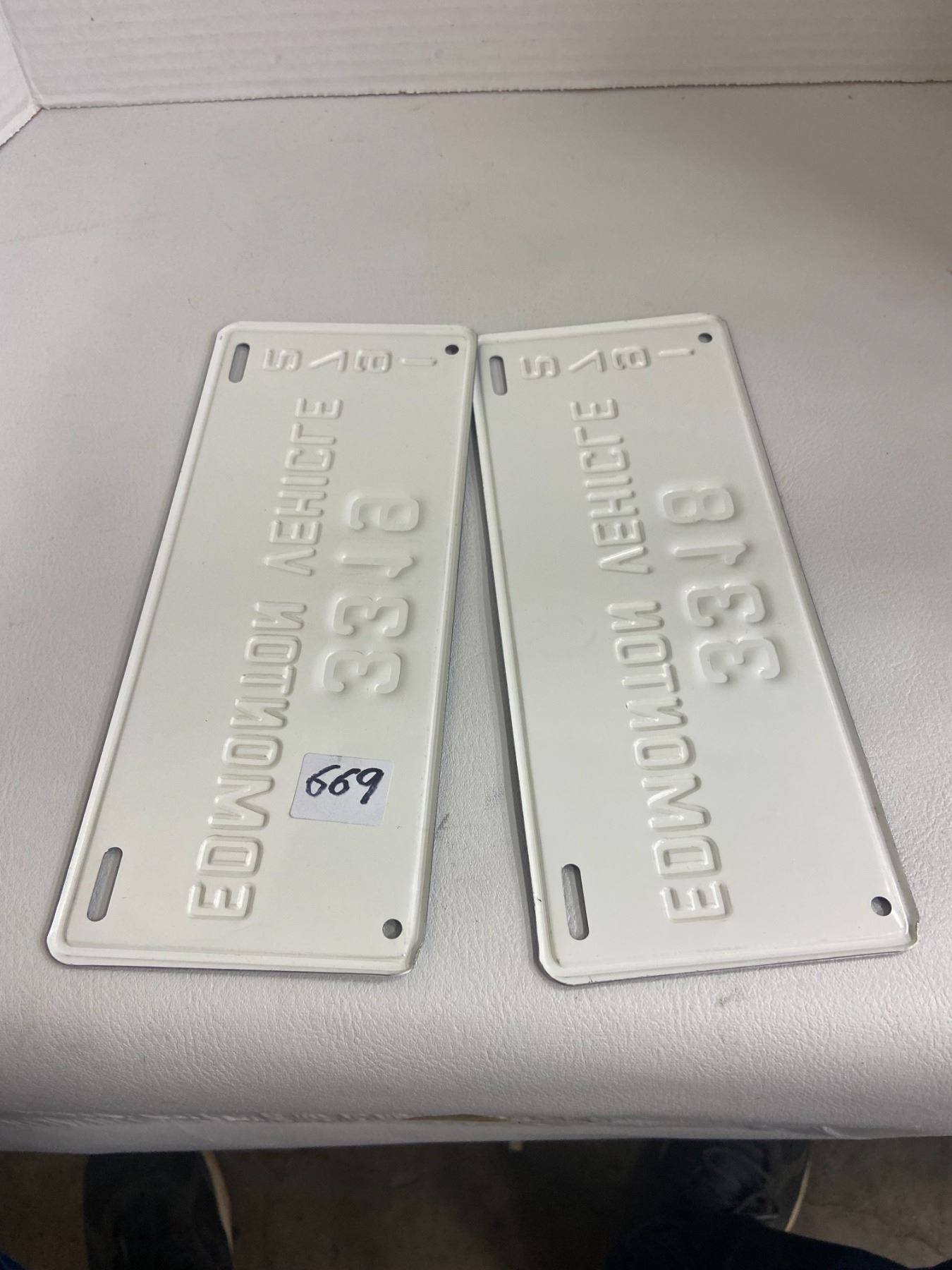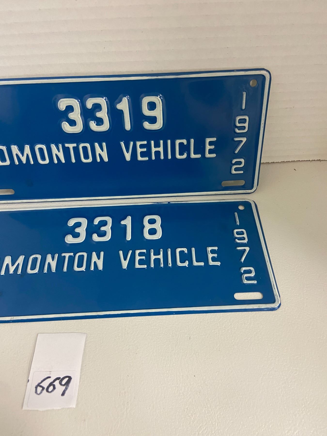 2 1972 Edmonton Vehicle plates 3318 & 3319 9" x 3 1/2"