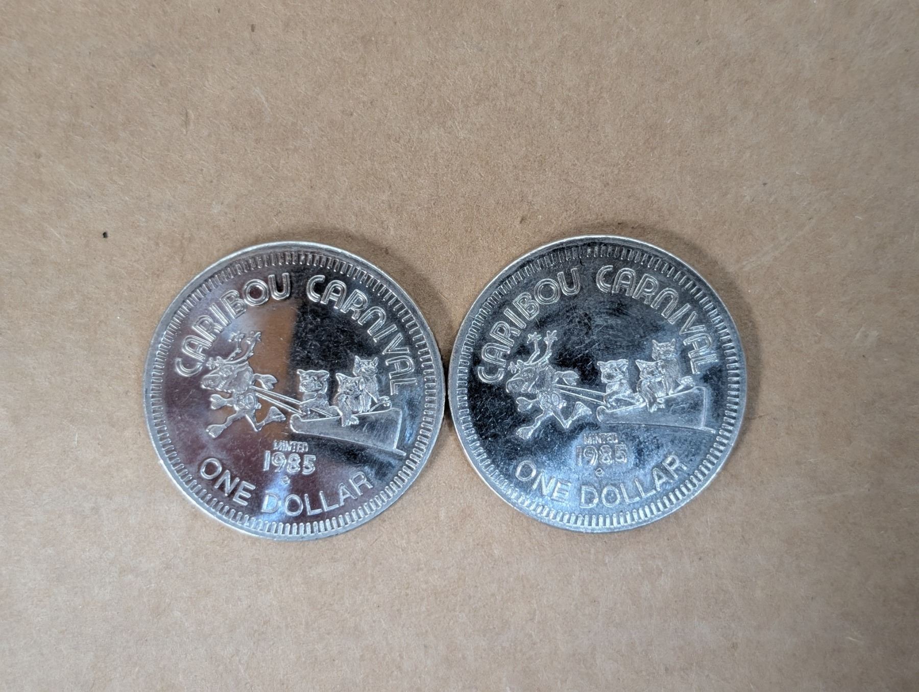 (2) 1985 Caribou Carnival One Dollar Coins Yellow Knife N.W.T Canada