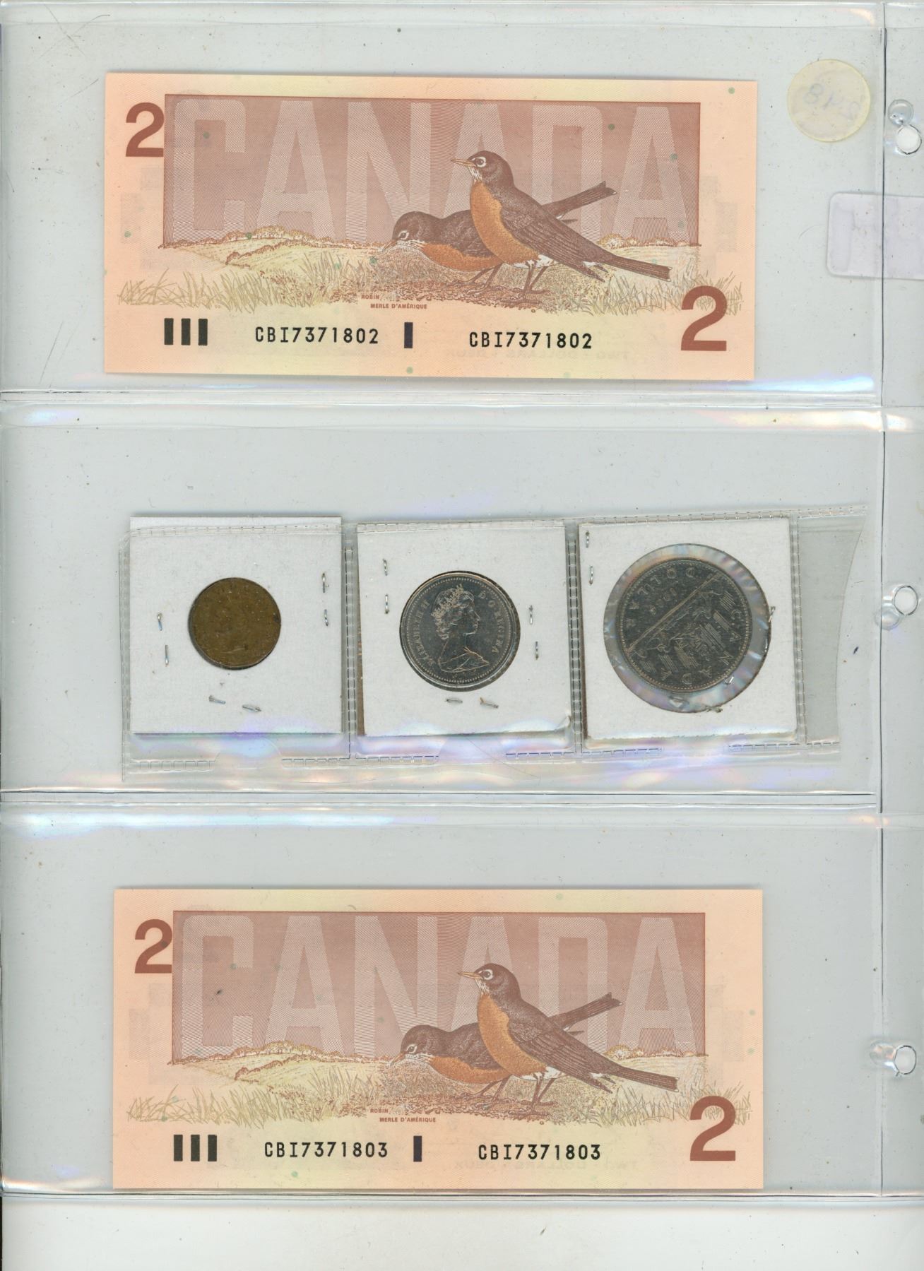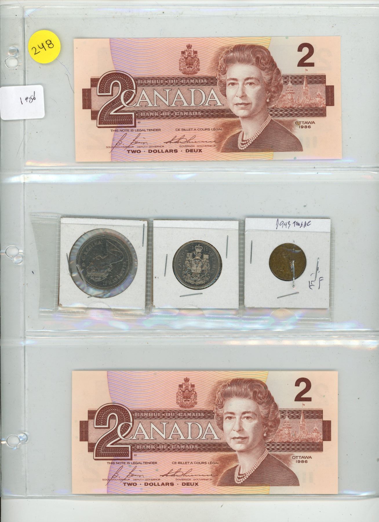 (2) 1986 Canadian Two Dollar, 1986 Canadian 50 Cents, 1986 Canadian One Dollar, 1943 Canadian 5 Cent