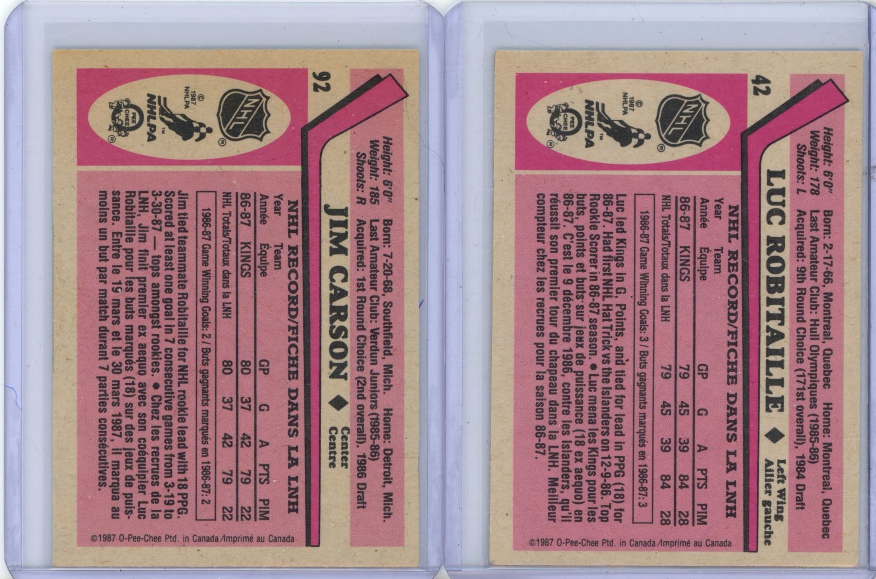 2 1987-88 kings rookie cards Robitaille #42 and Carson #92