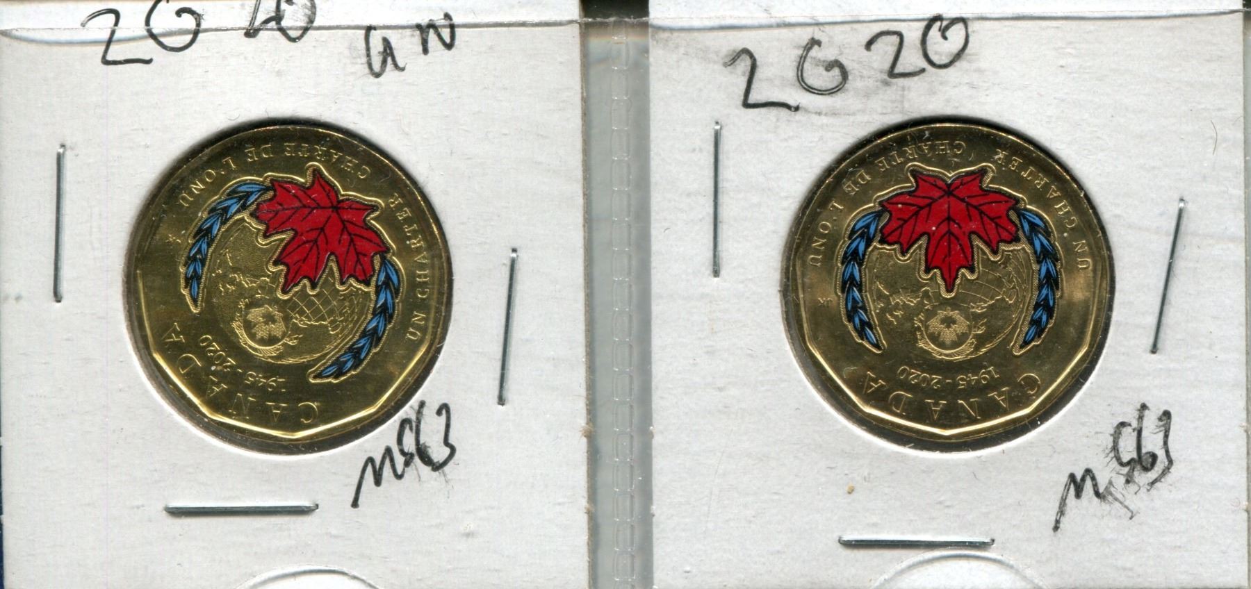 (2) 2020 Canada 75th Anniversary Of "Un Charter" Loonies (Colorized)