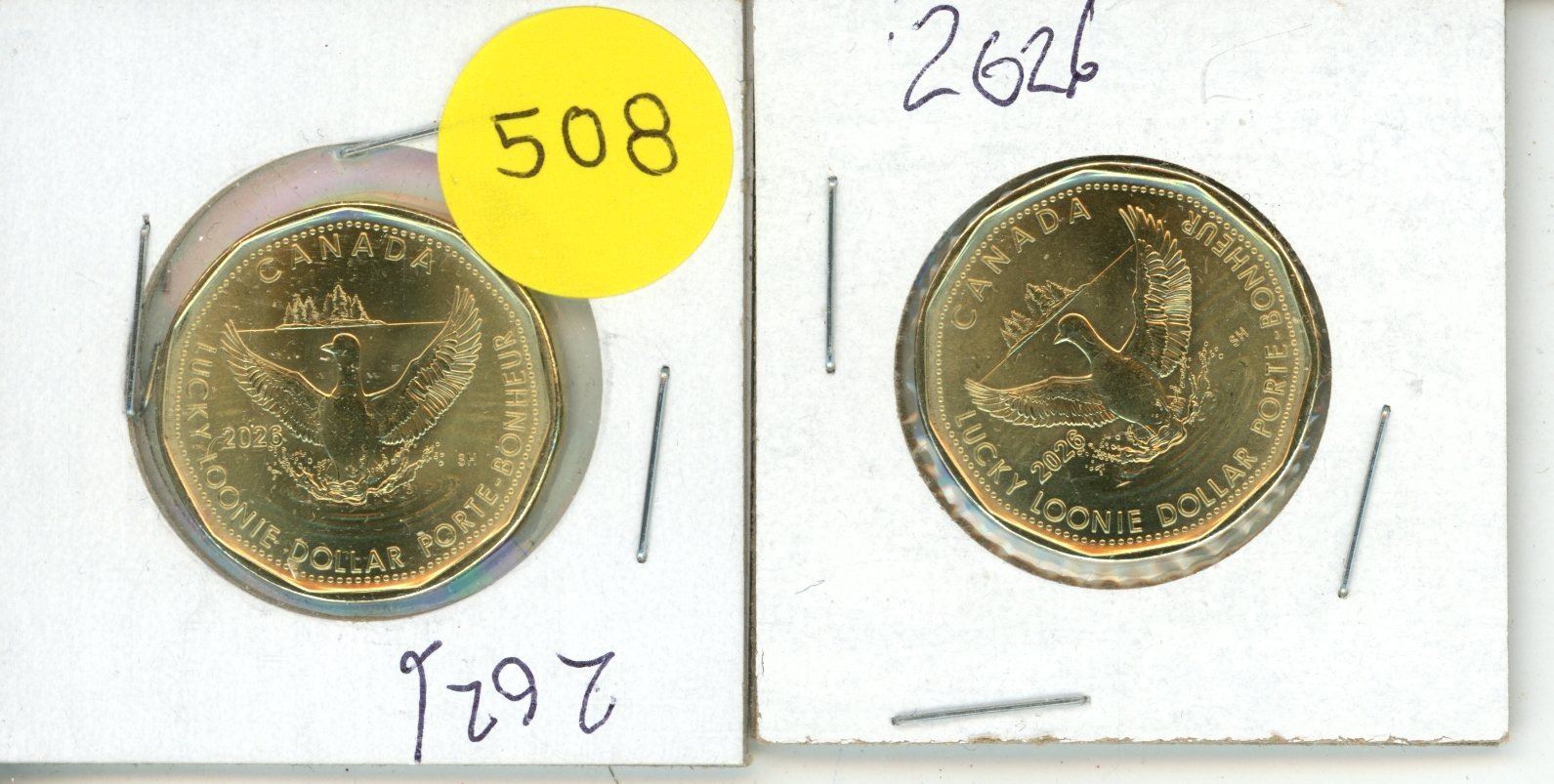 (2) 2026 Canadian "Lucky Loonie" 1-dollar coins produced by the Royal Canadian Mint.