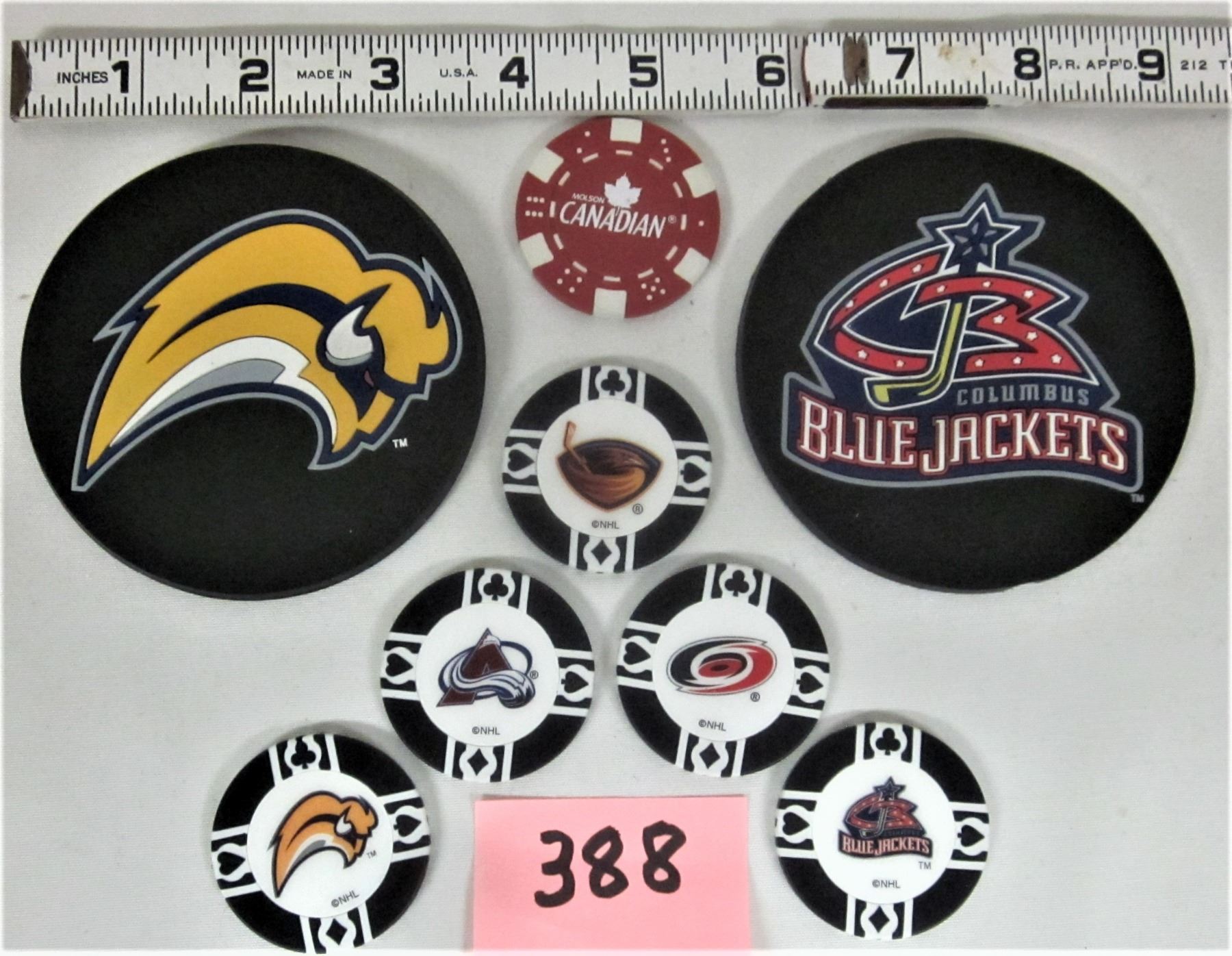 2 3?2 rubber NHL coaster buffalo sabves+Columbus blue jackets+ 5 NHL team poker tokens-Buf-col-Atl-Car4-Cbj Bonus Molson Canadian token