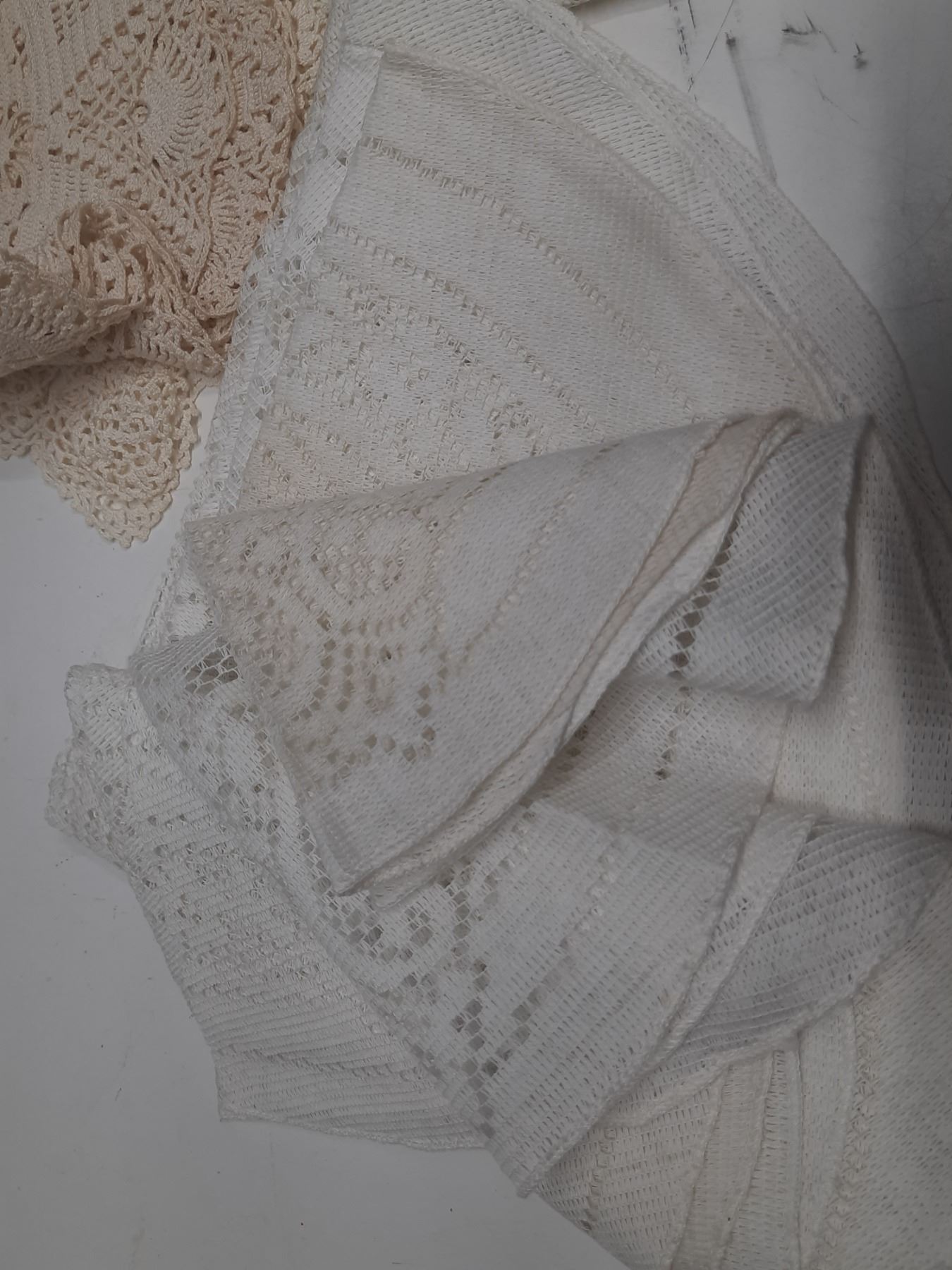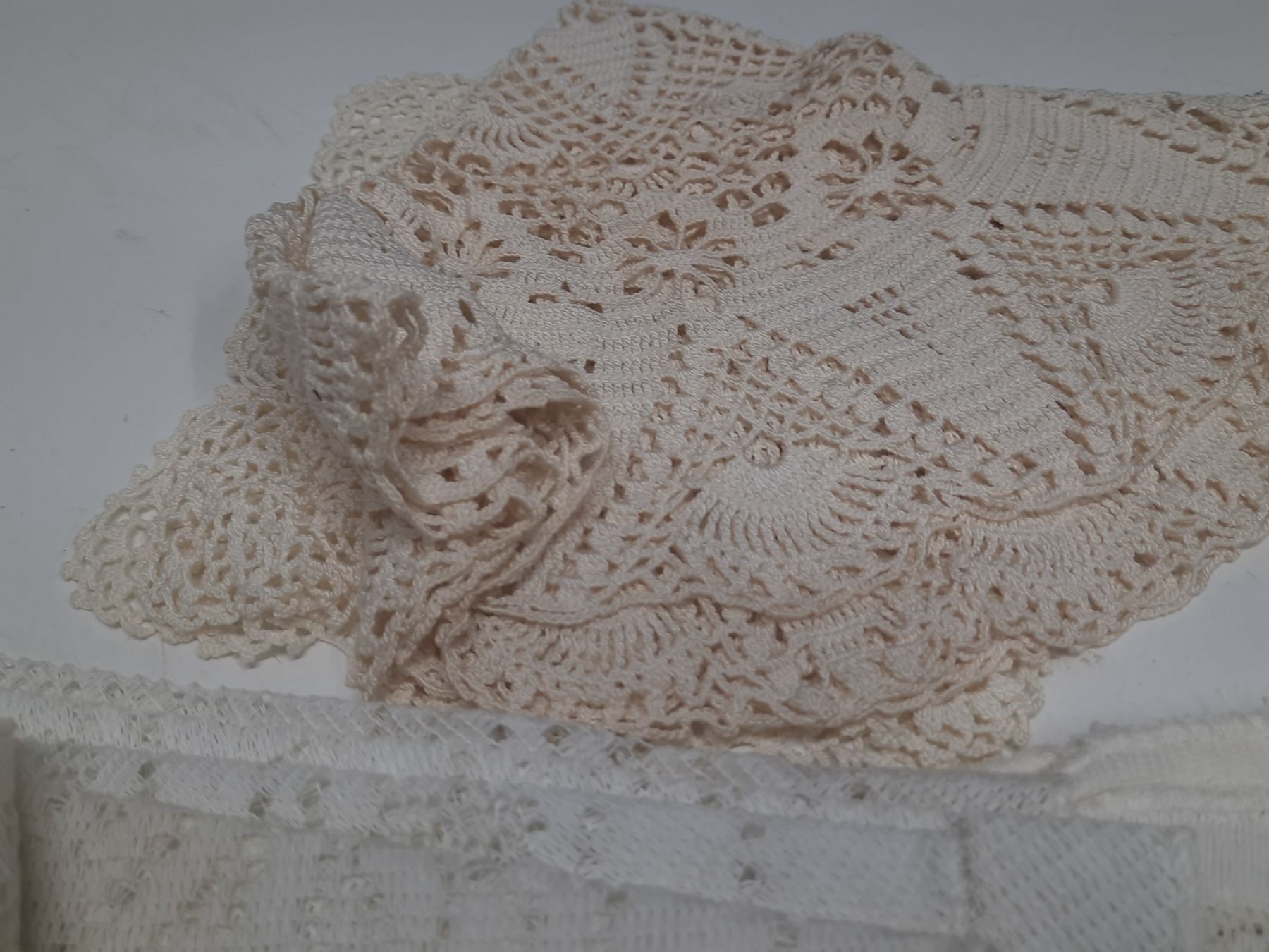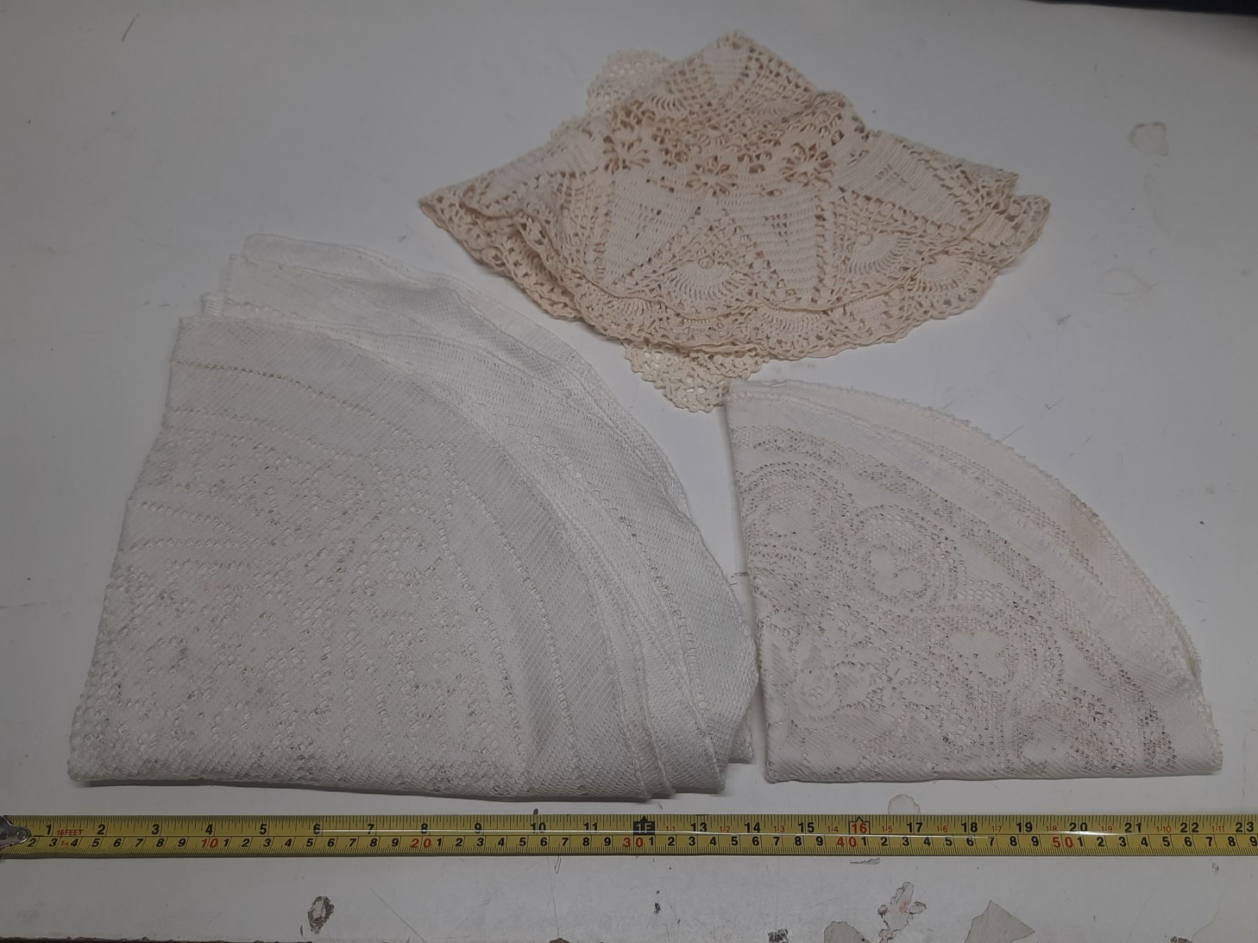 2- 8" square dollies,1 hand crotchet 30' dollies, 5-24' round dollies and 2- 18' round dollies