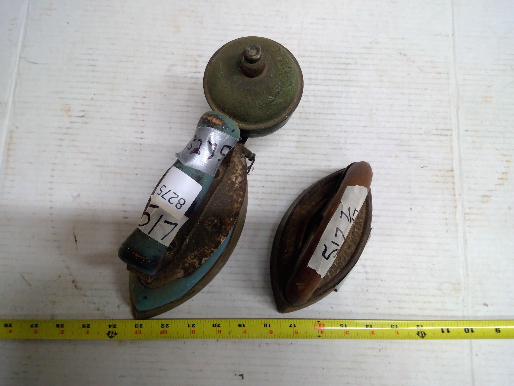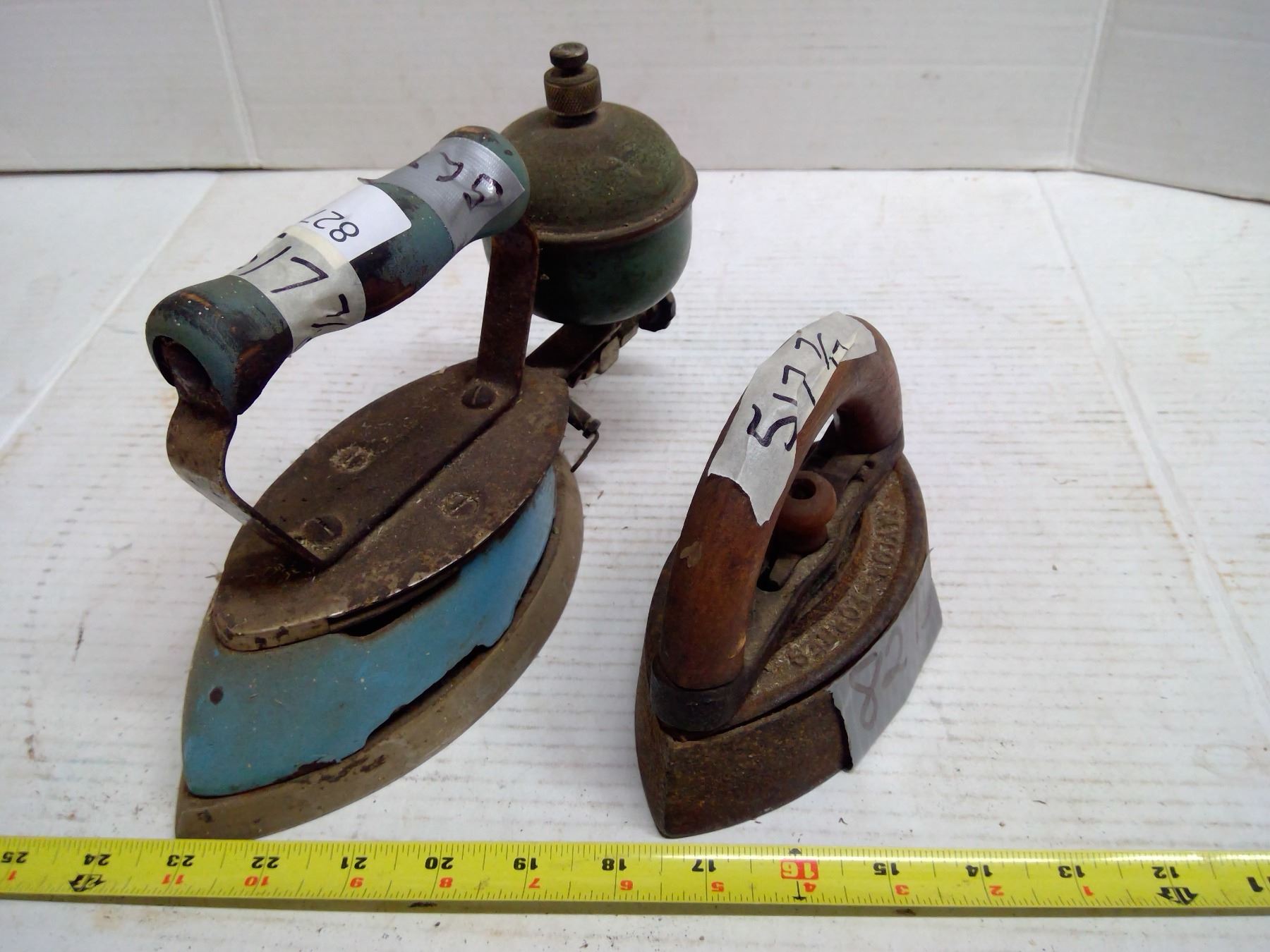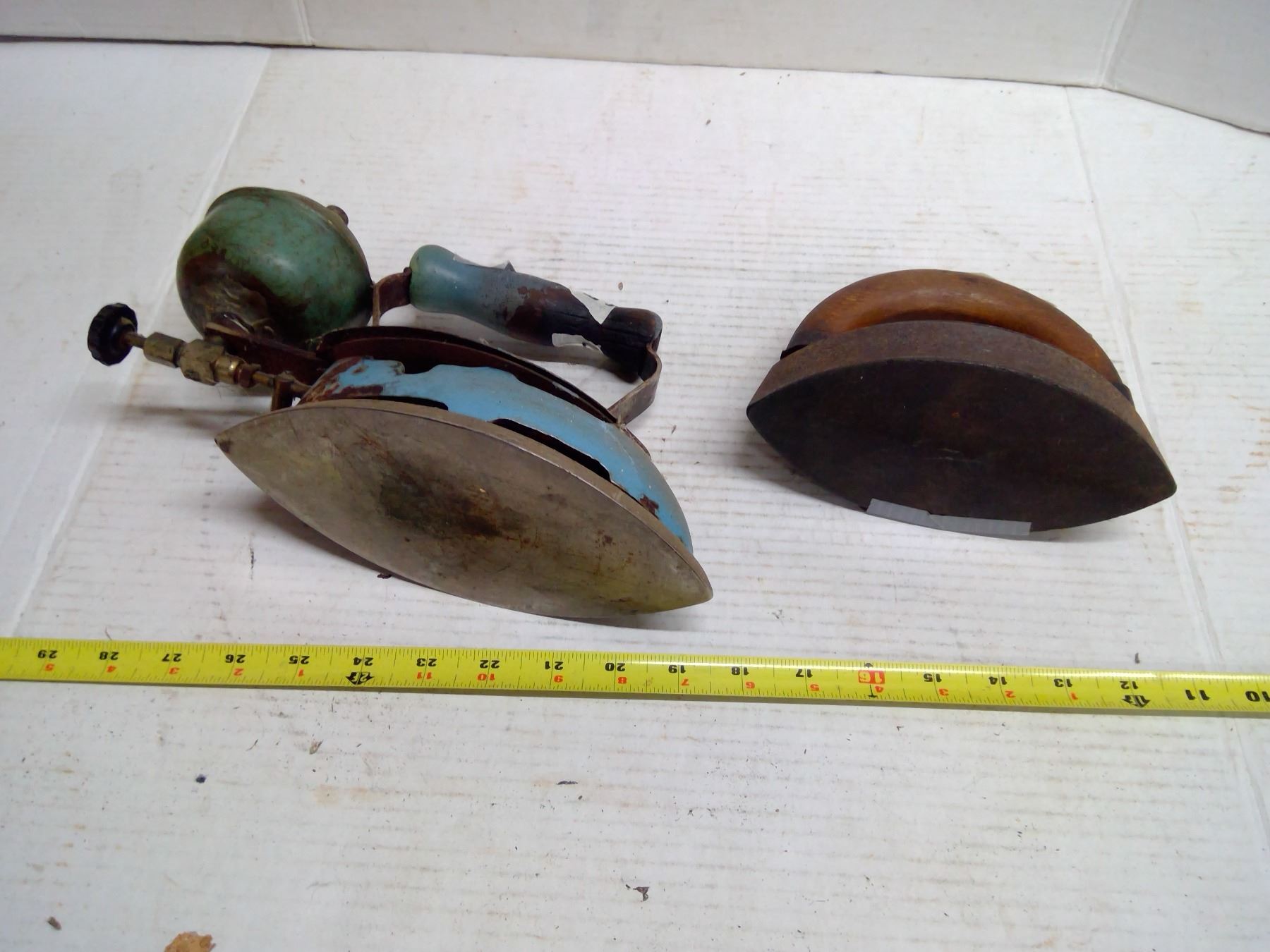 2 Antique Irons (1x Blue - Gas, 1 for Wood Stove w/ Handle)
