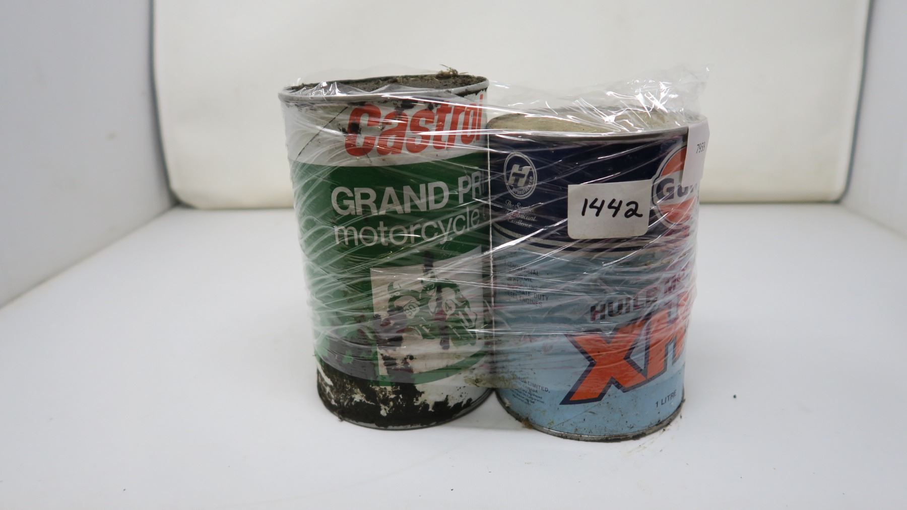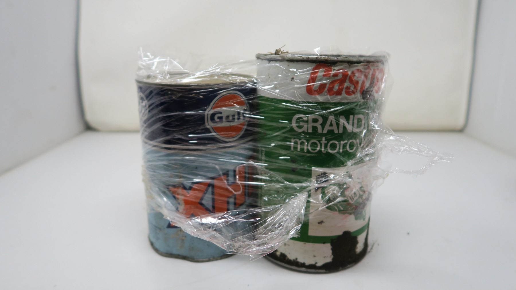 2 CARDBOARD OIL TIN -1 GULF, 1 CASTROL MOTORCYCLE