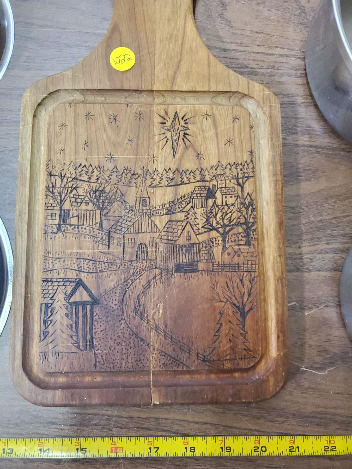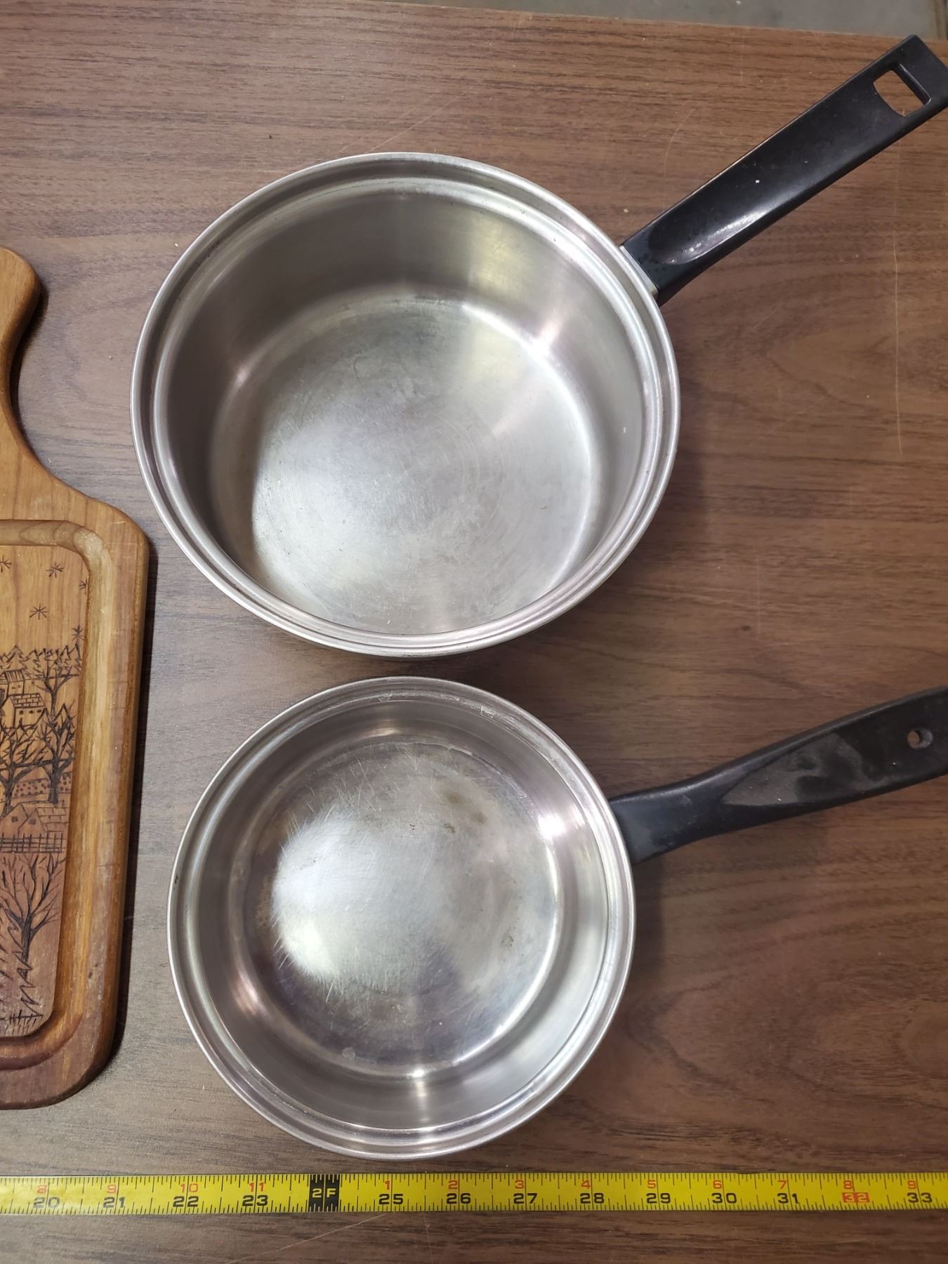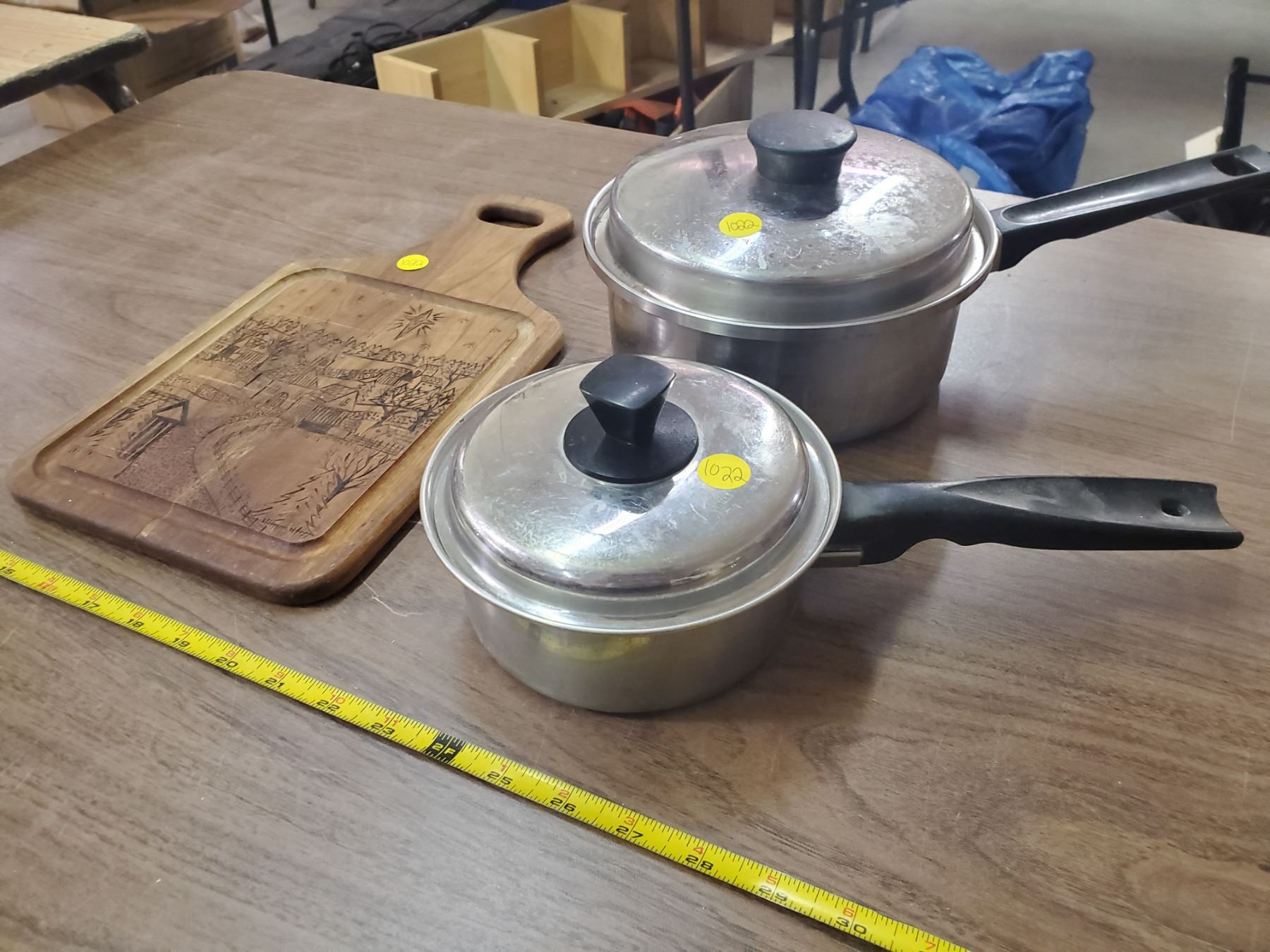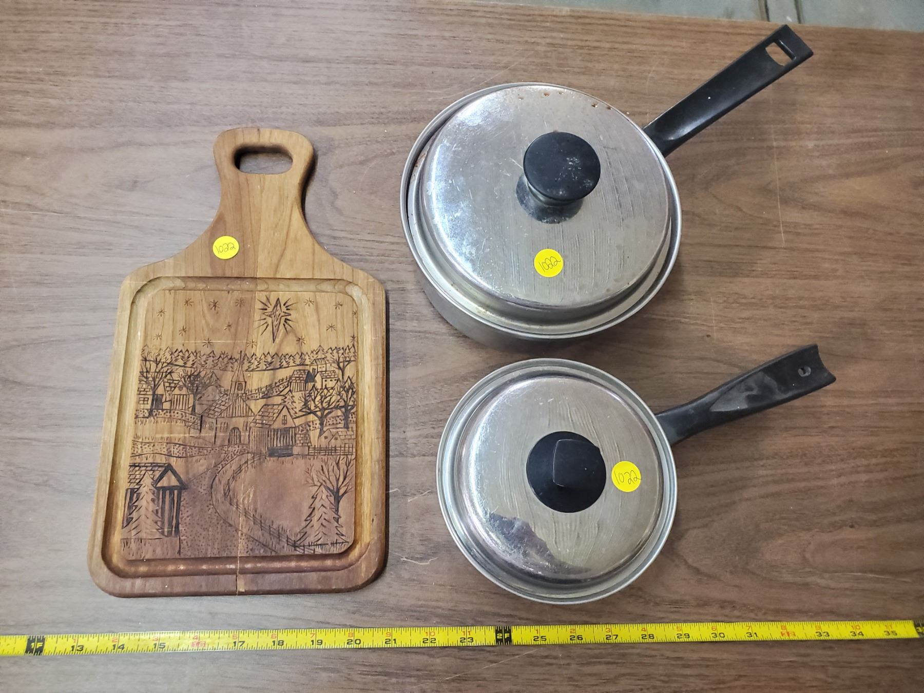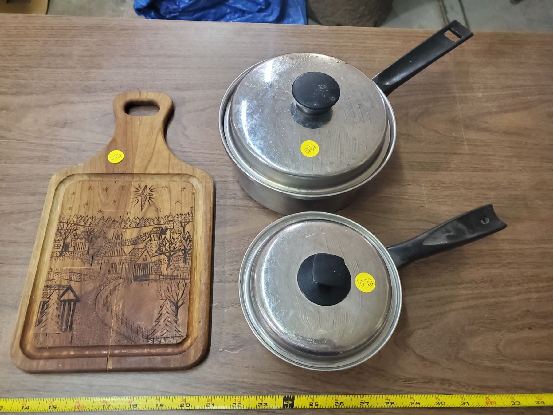 2 COOKING POTS WITH LIDS AND WOODEN CUTTING BOARD