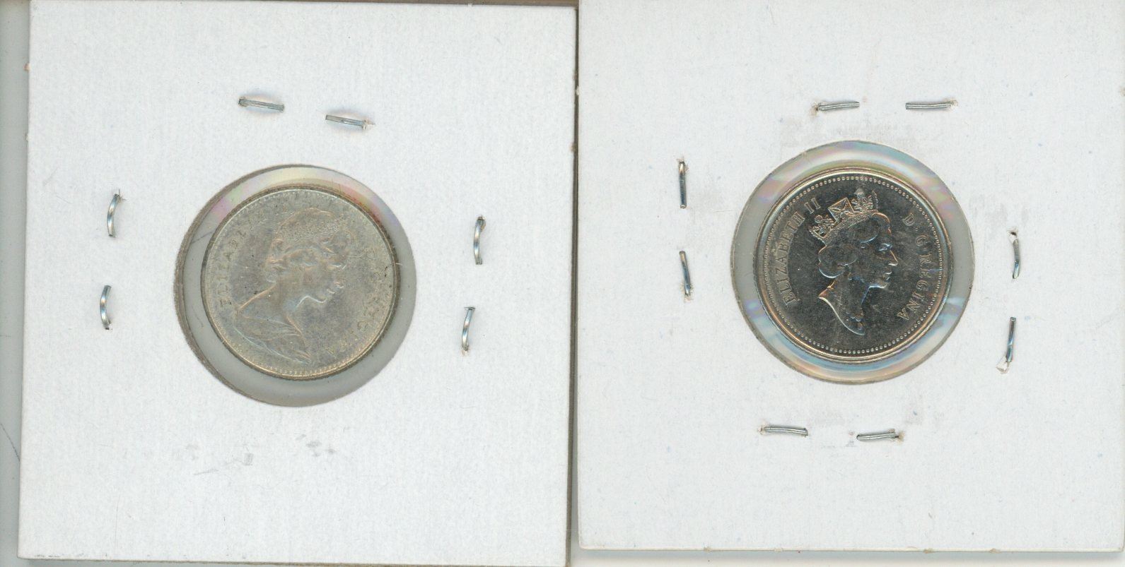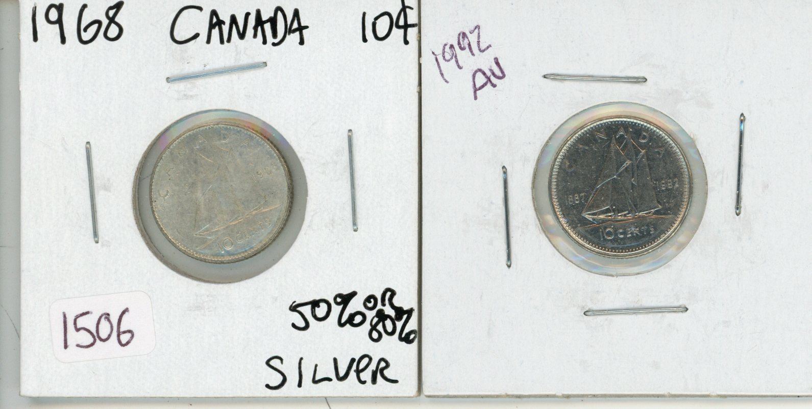 2 Canadian 10 cent coins - 1968 (silver) & 1992