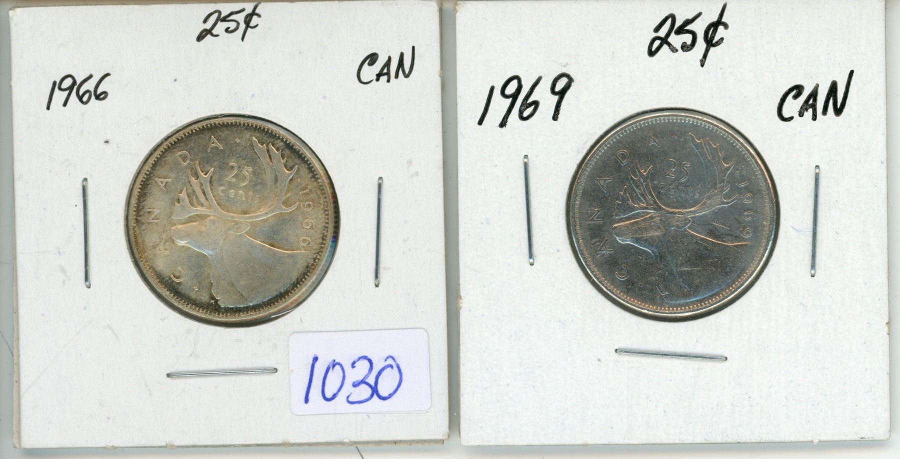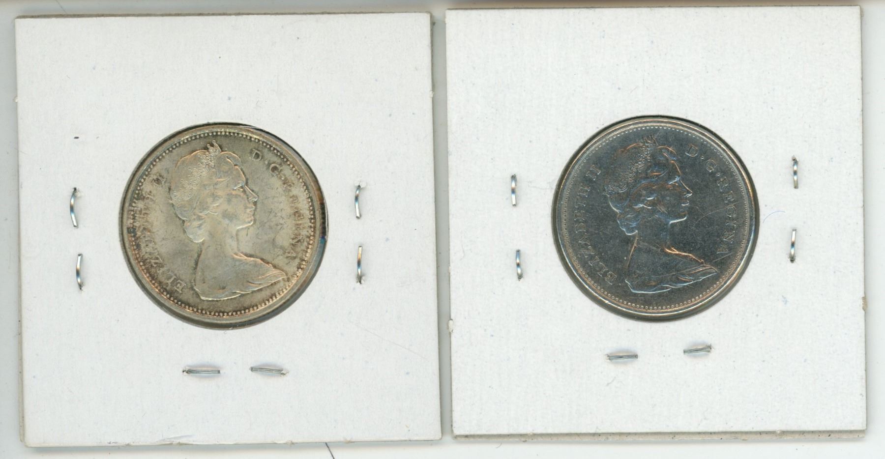 2 Canadian 25 cent coins - 1966 Silver & 1969