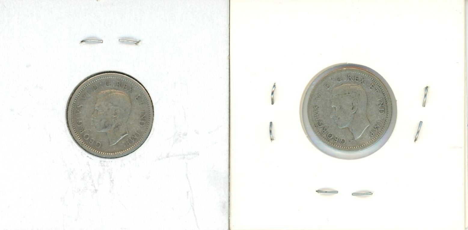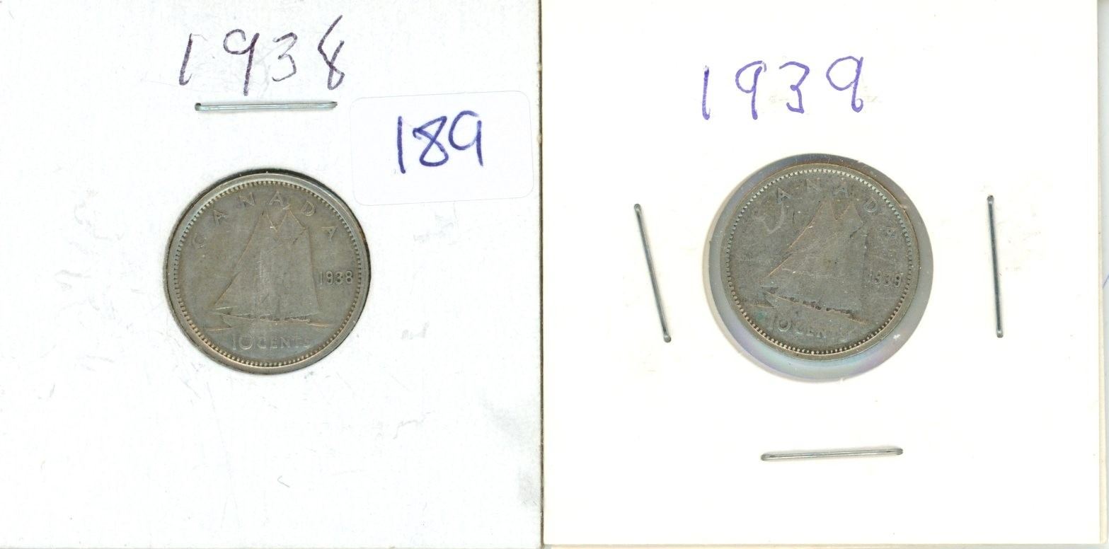 2 Canadian Silver 10 Cent Coins - 1938-1939
