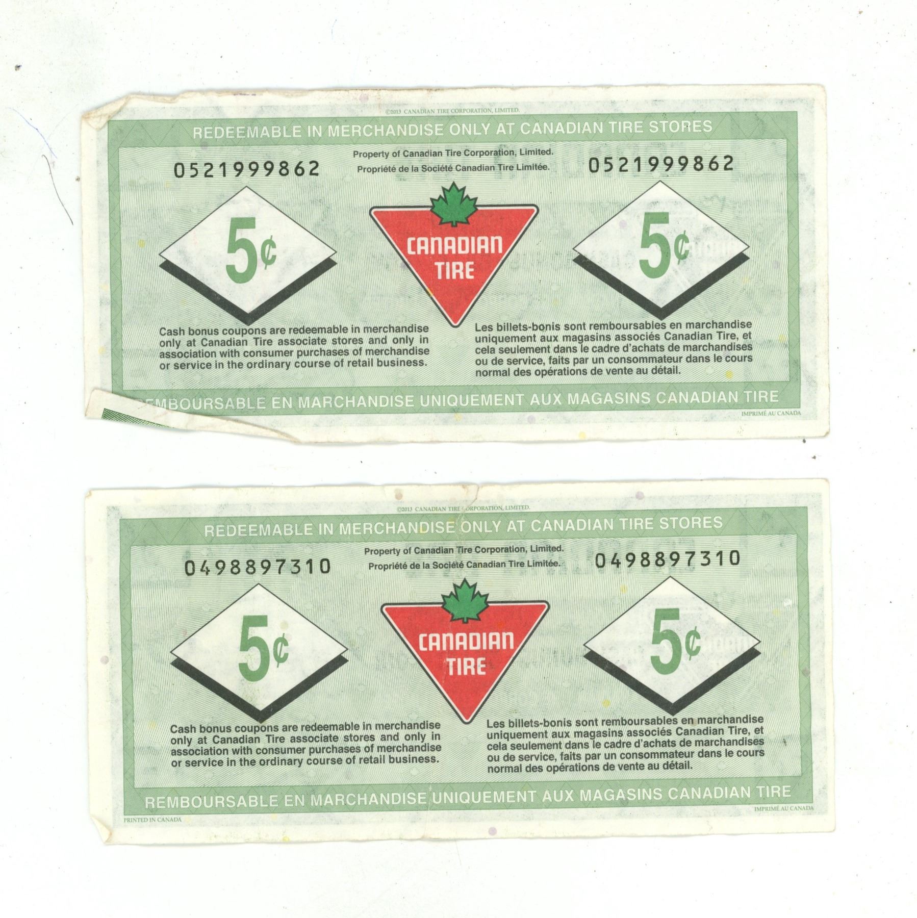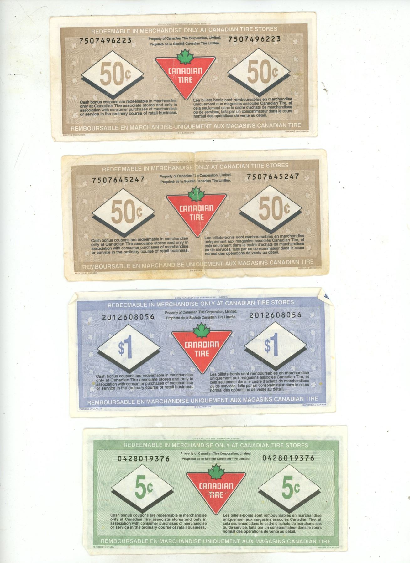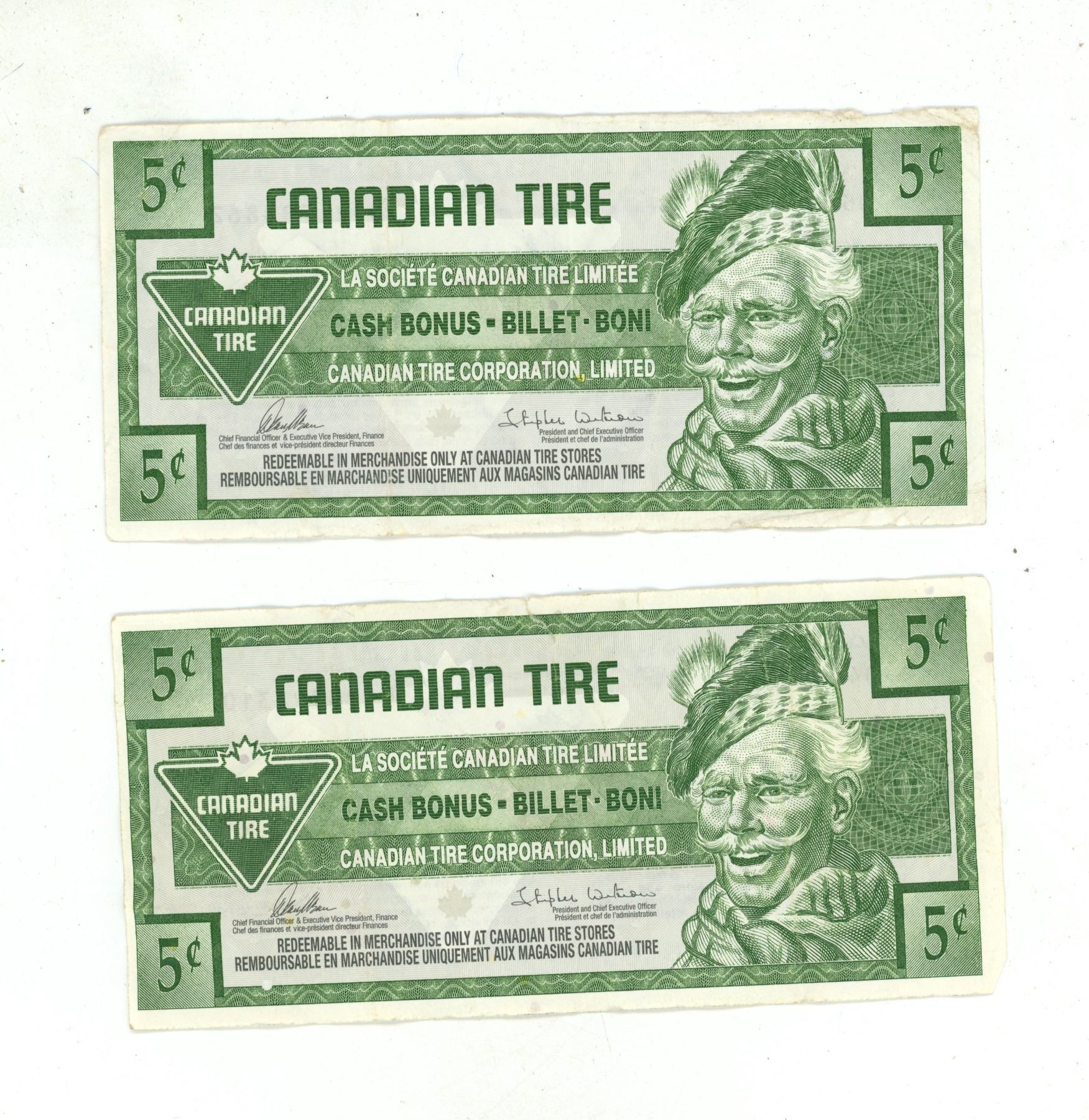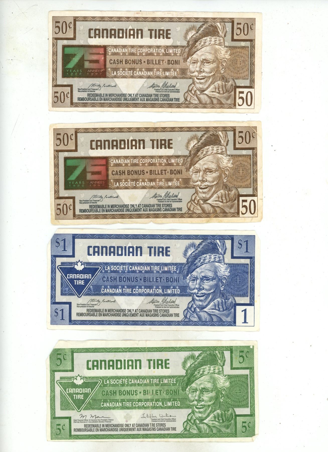 (2) Canadian Tire 50 Cents, (1) One Dollar, (3) Five Cents Paper Money.