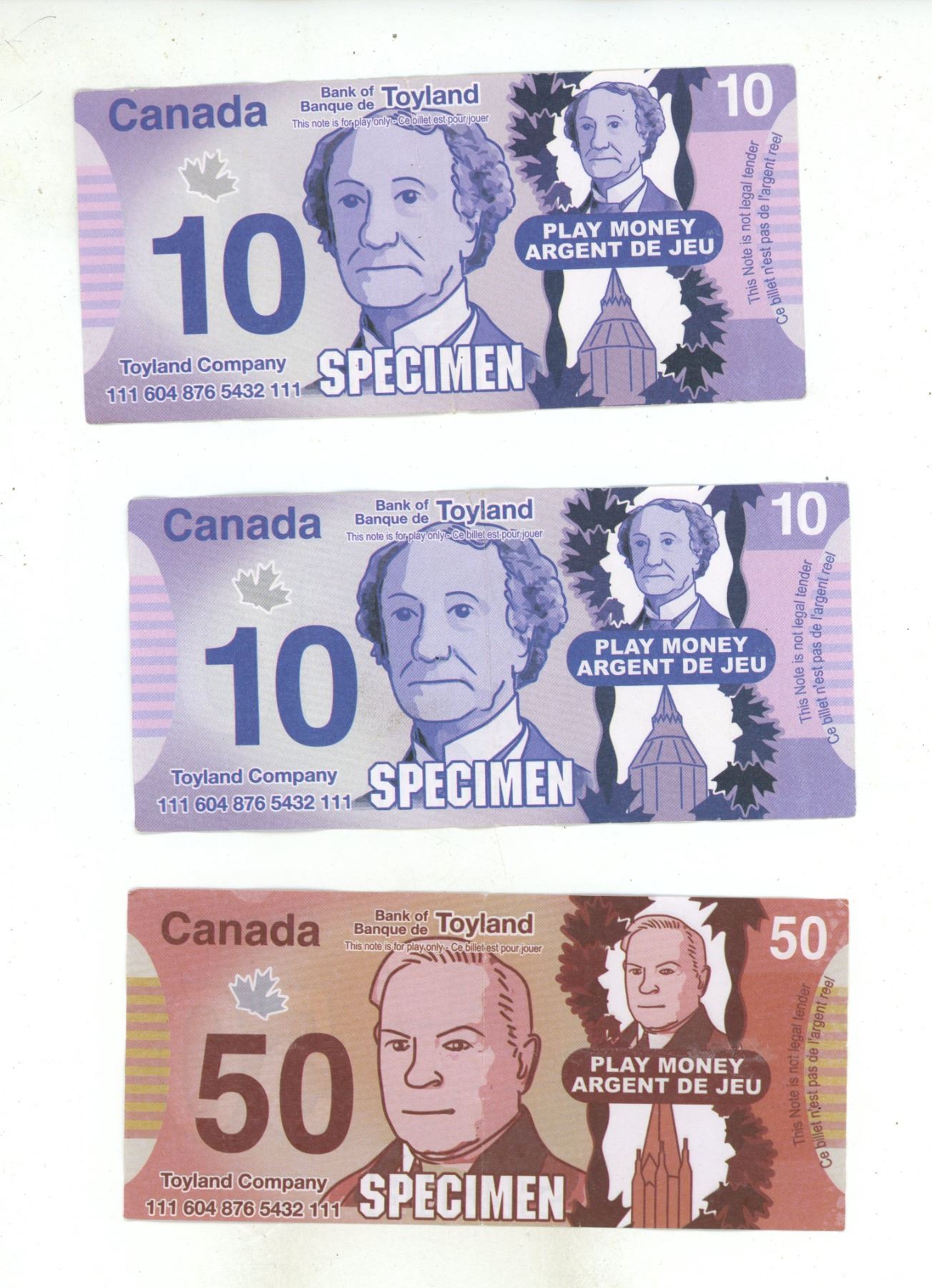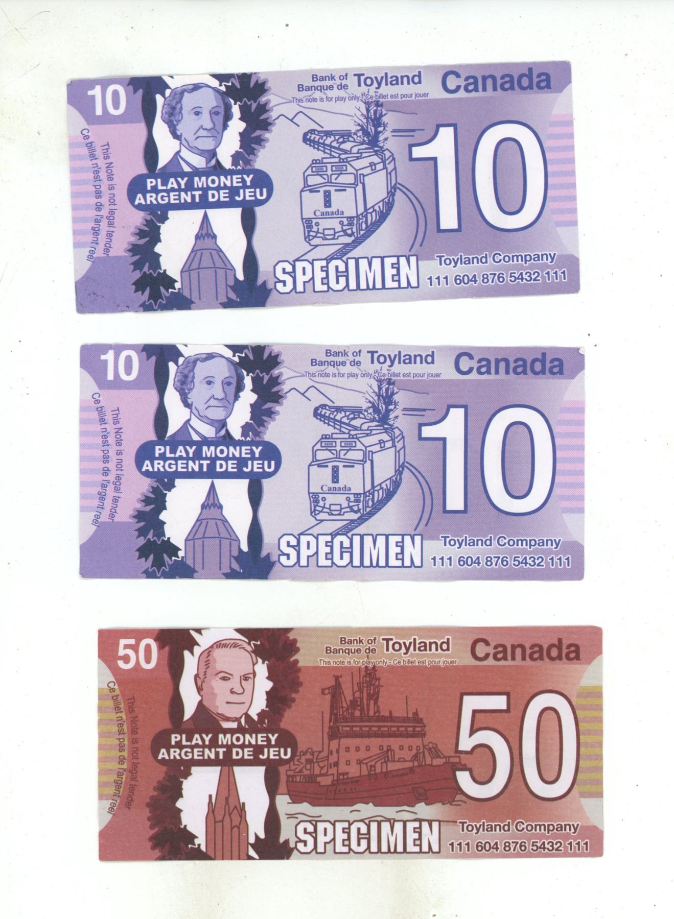 (2) Canadian Two Dollar and (1) 50 Dollar Toyland Play Money.