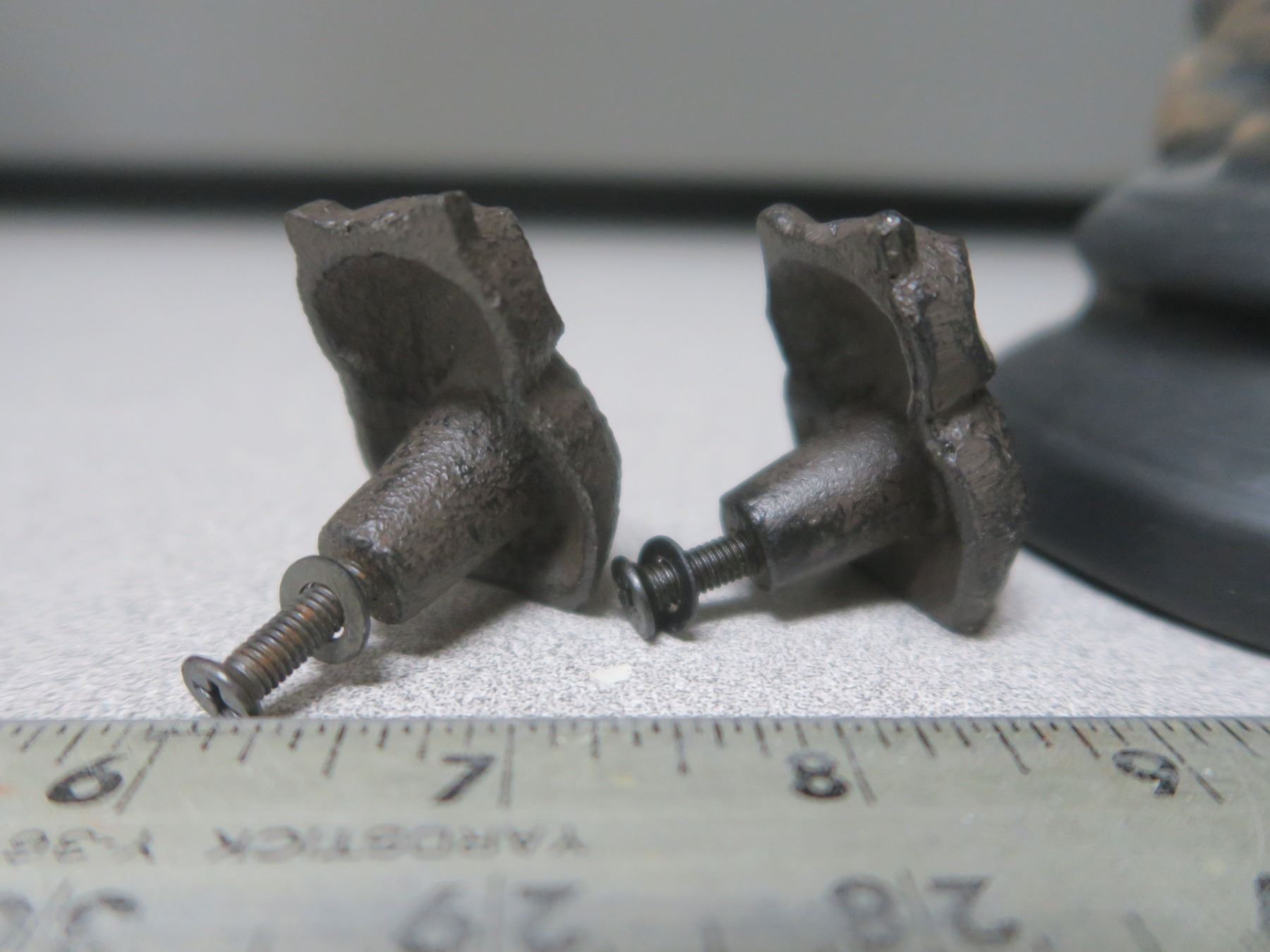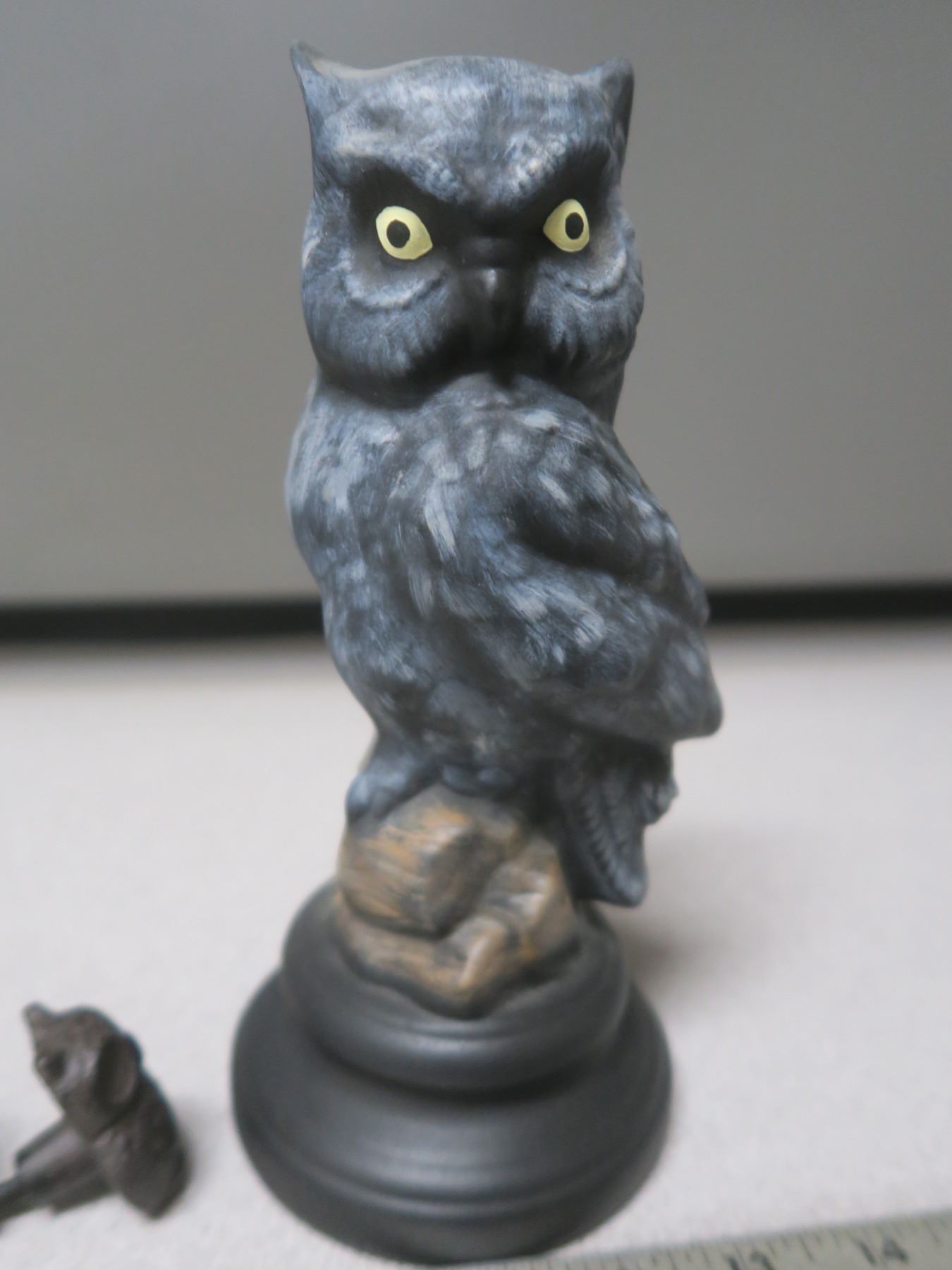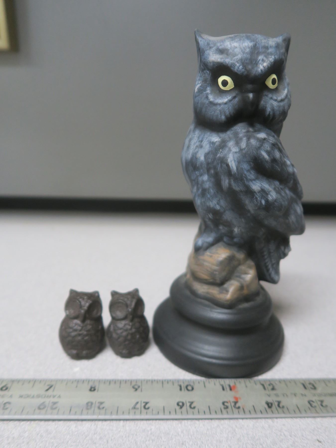 2 Cast Iron Owl Dresser Knobs and Ceramic Owl Sculpture
