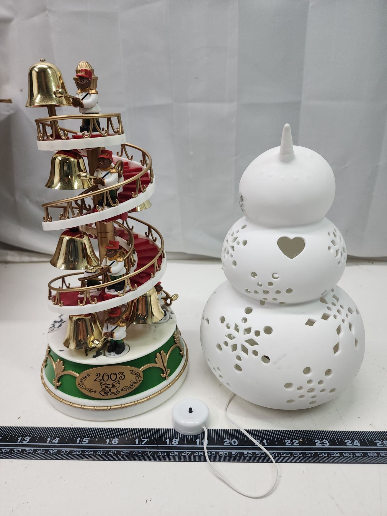 2 Christmas decorative items - Musical bear bell tower - works & light up snowman