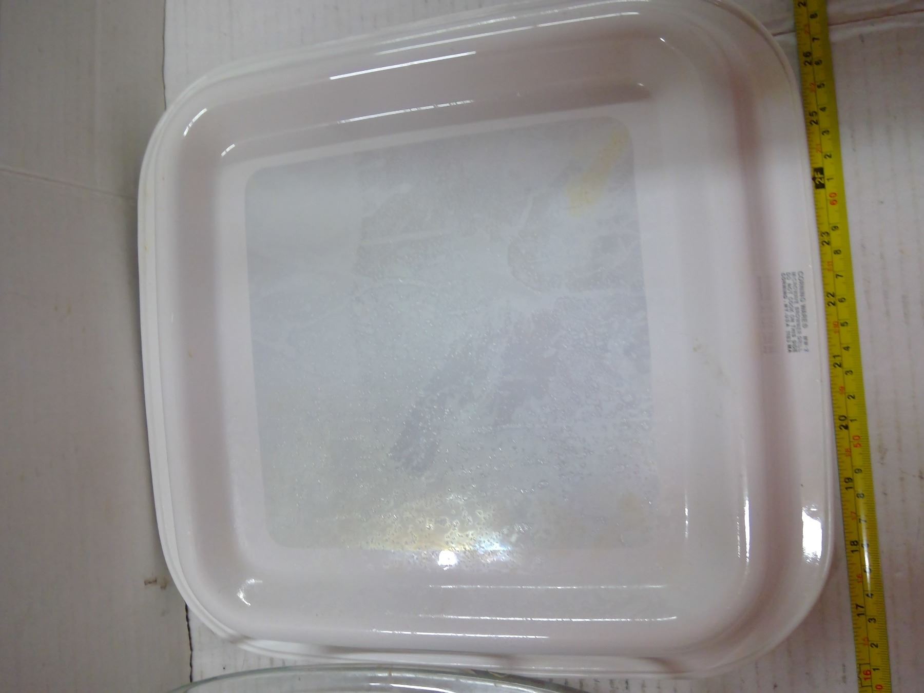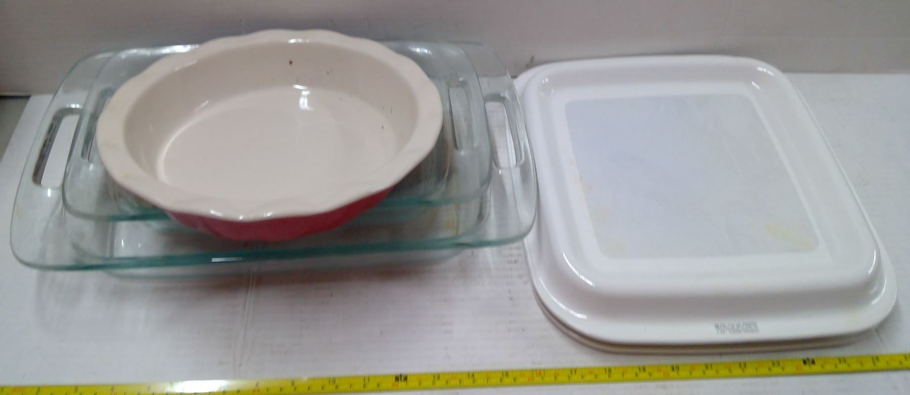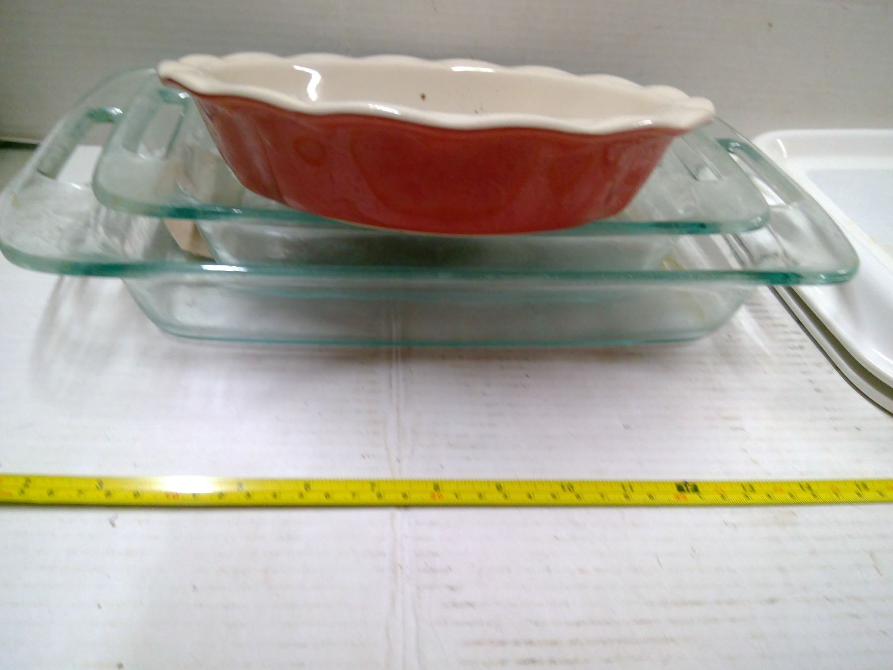 2 Corningware microwave browning grills, 2 glass pans, and Godcook stoneware dish