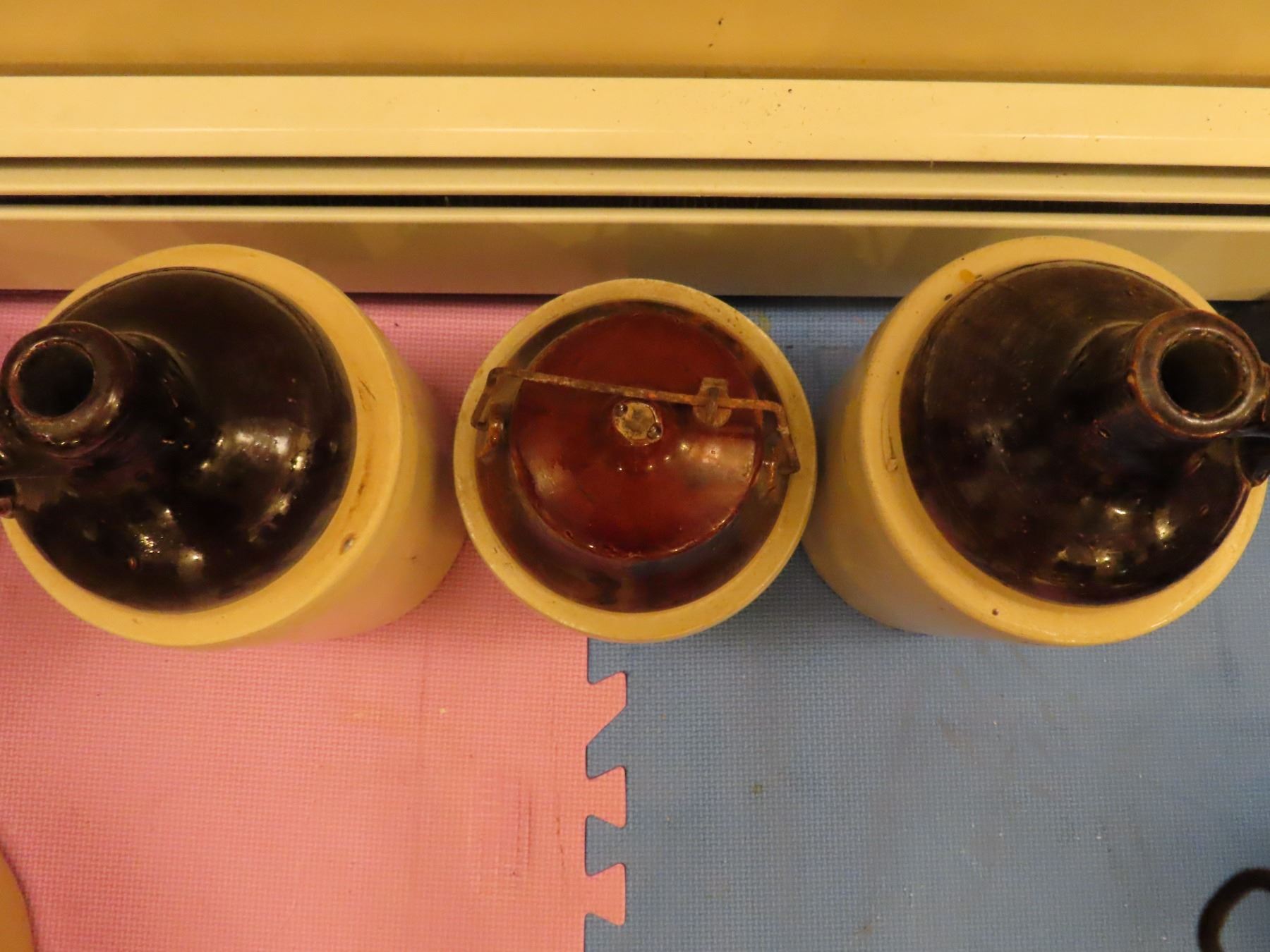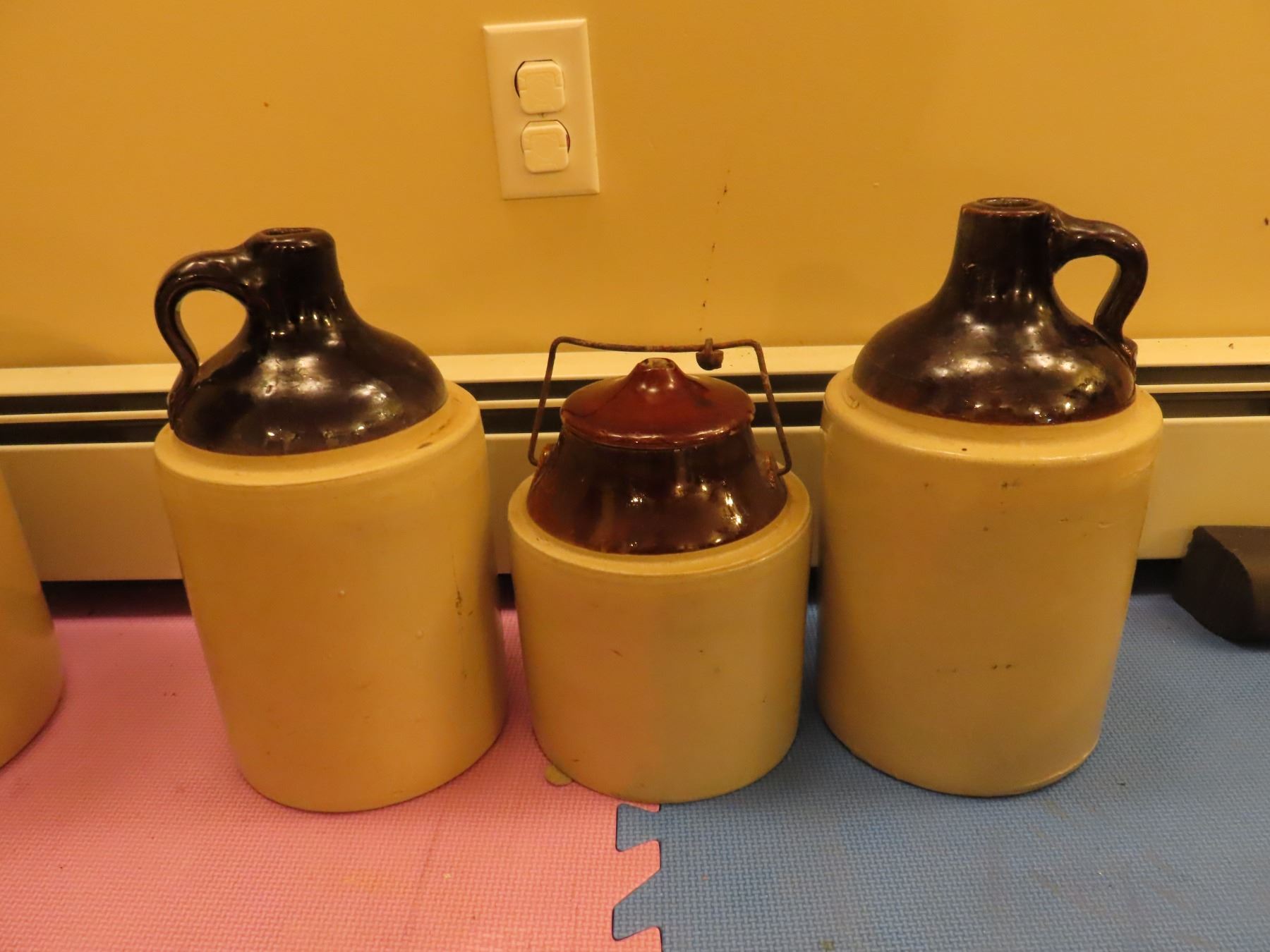 2 Crockery whiskey jugs and 1 Crockery Jar