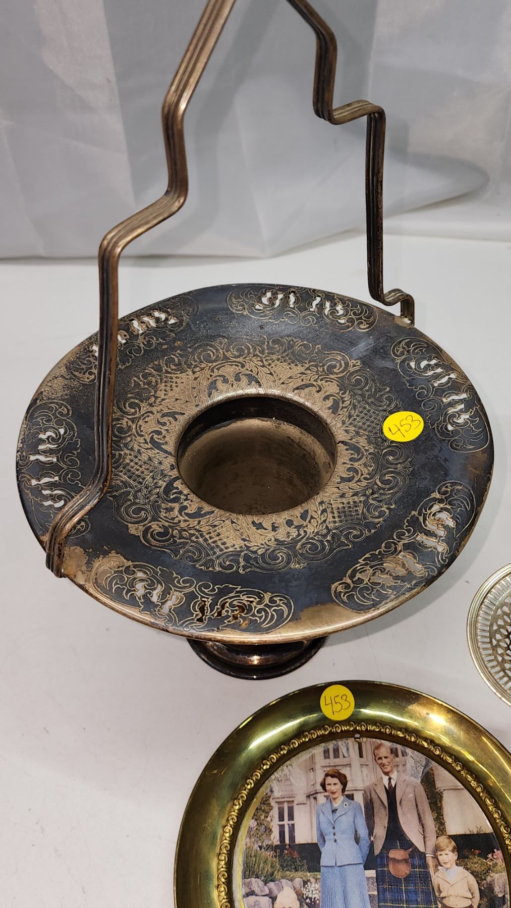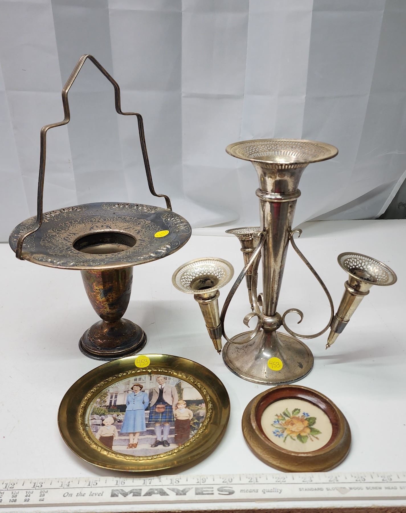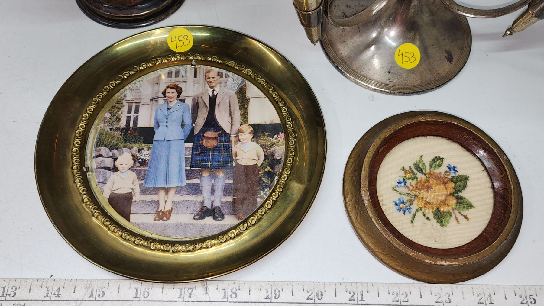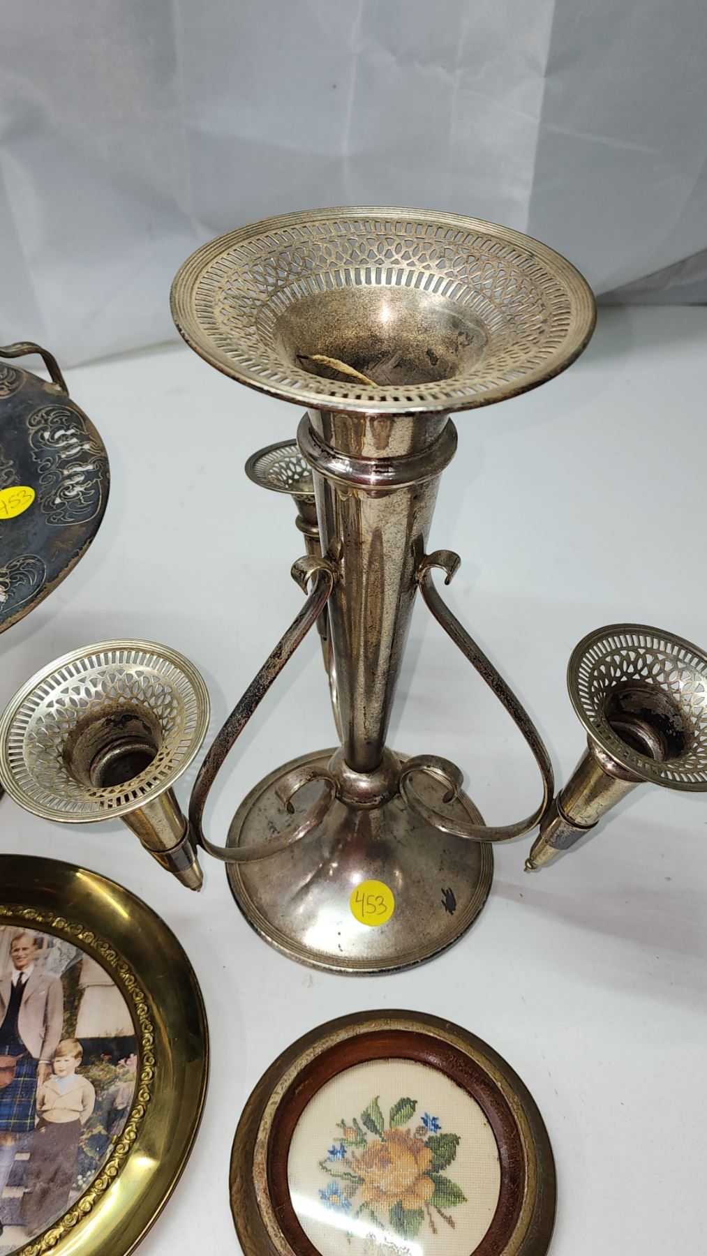 2 Electroplated candle holders & 2 small pictures, one embroidered flower
