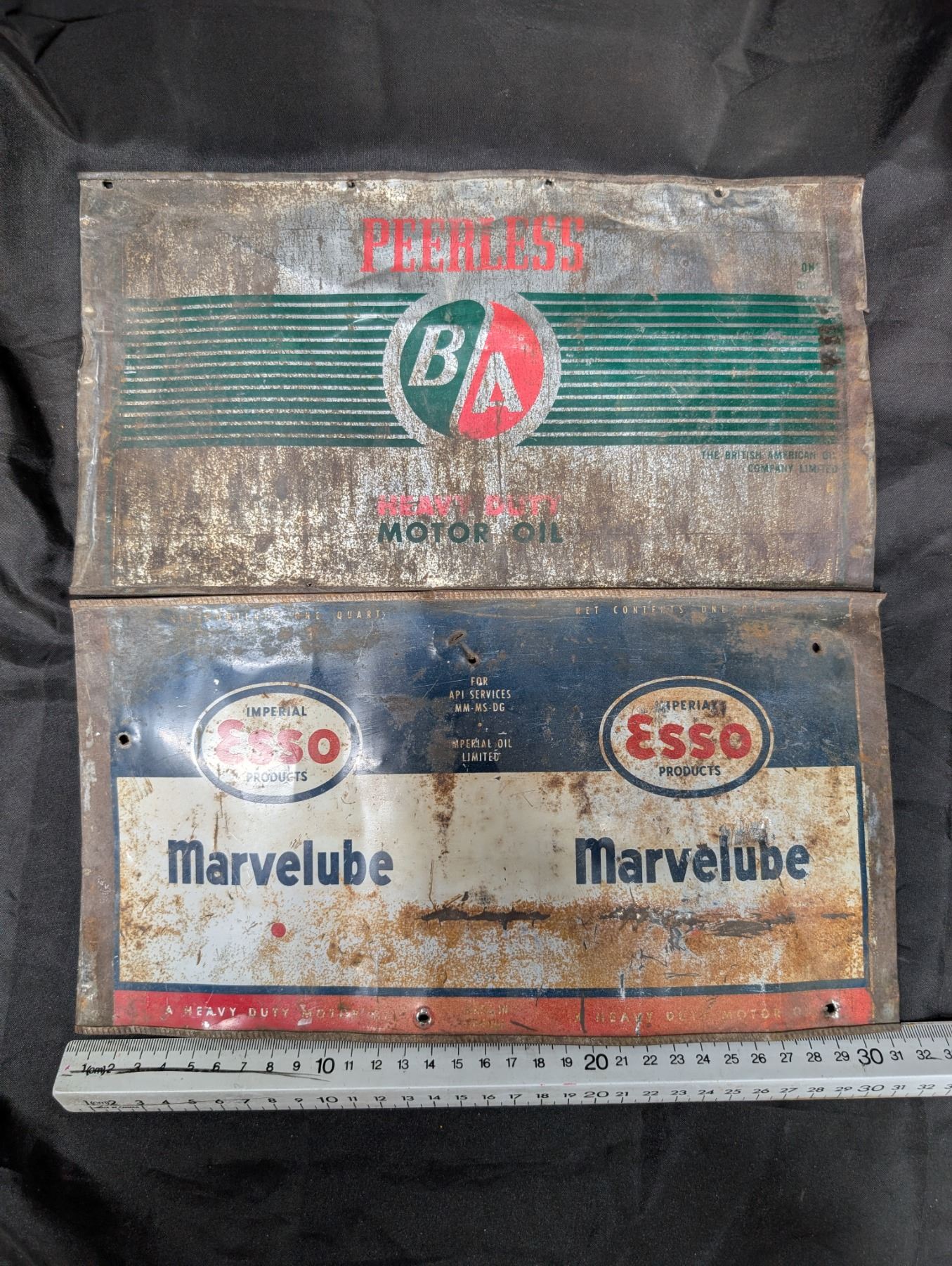 (2) Flatten oil Tin Can Esso Marvelube and Peerless Motor Oil