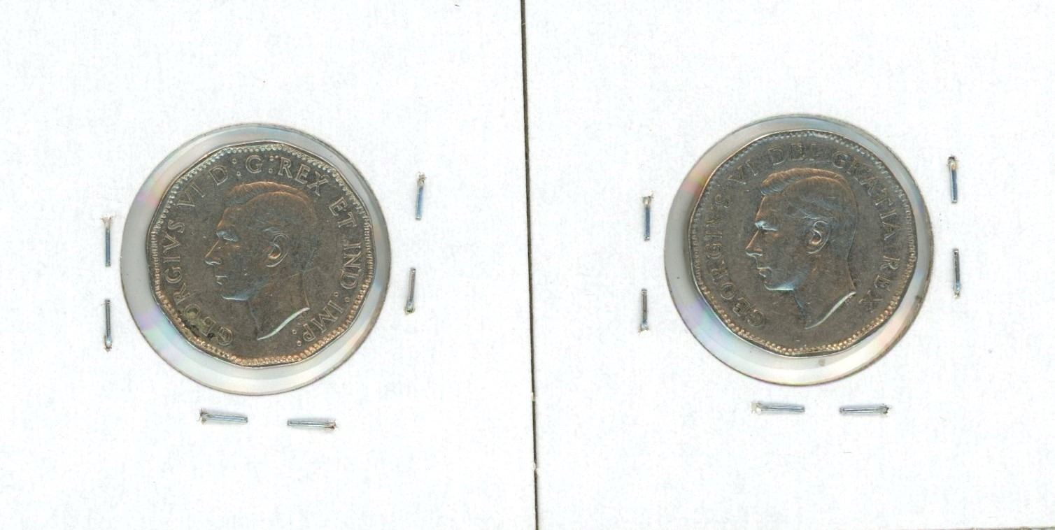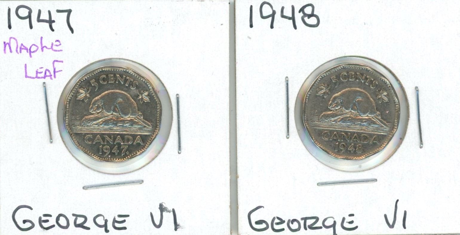 (2) George VI Five Cent Coin 1947 + 1948 (Maple Leaf)