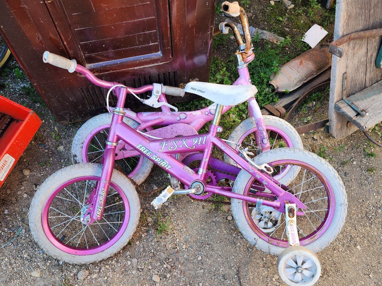2 Girls Children's Bikes, 14" with training wheels, 12" missing seat.