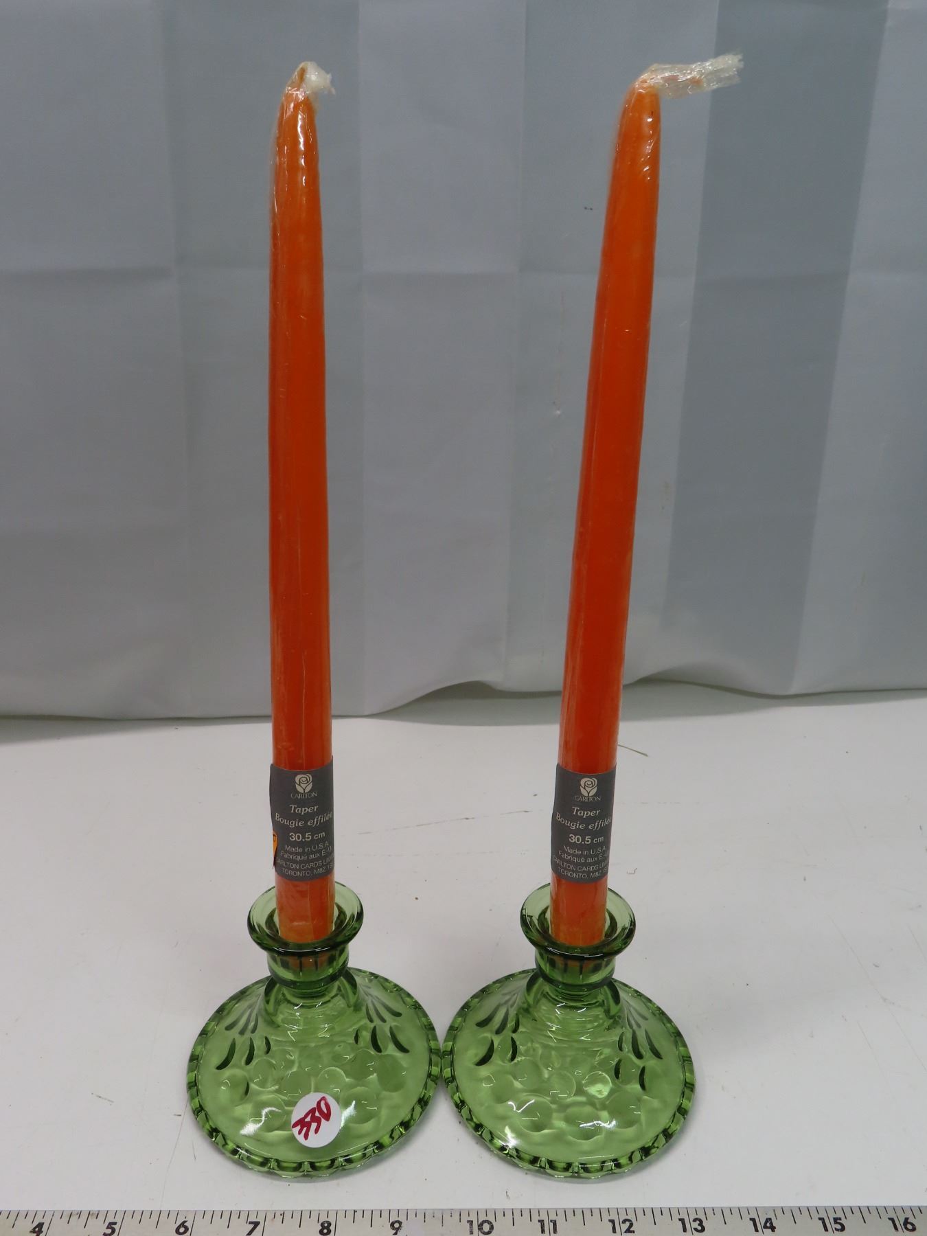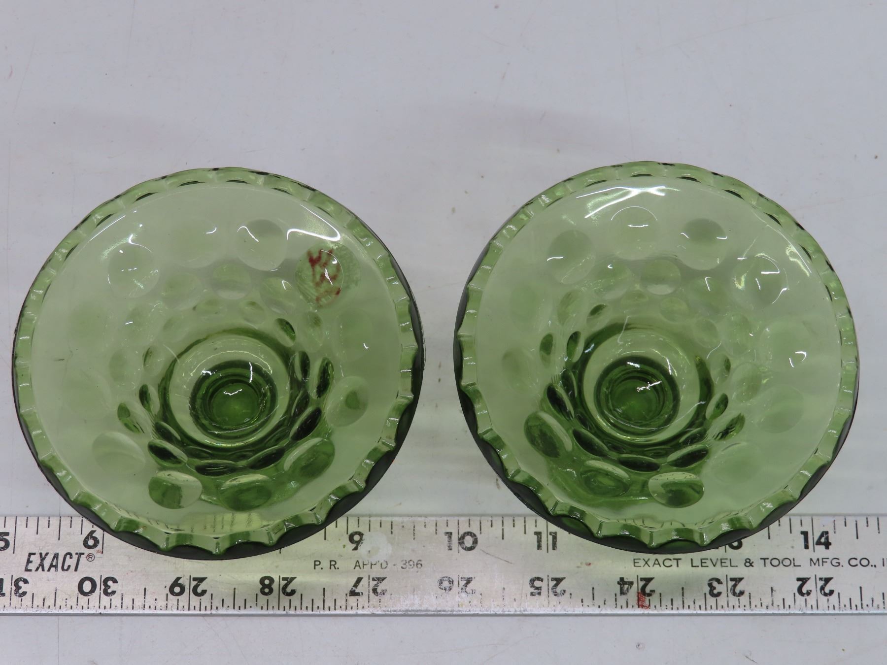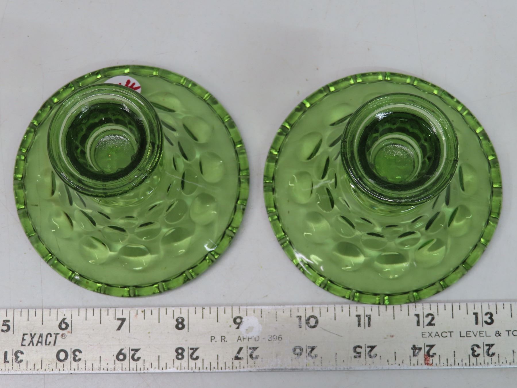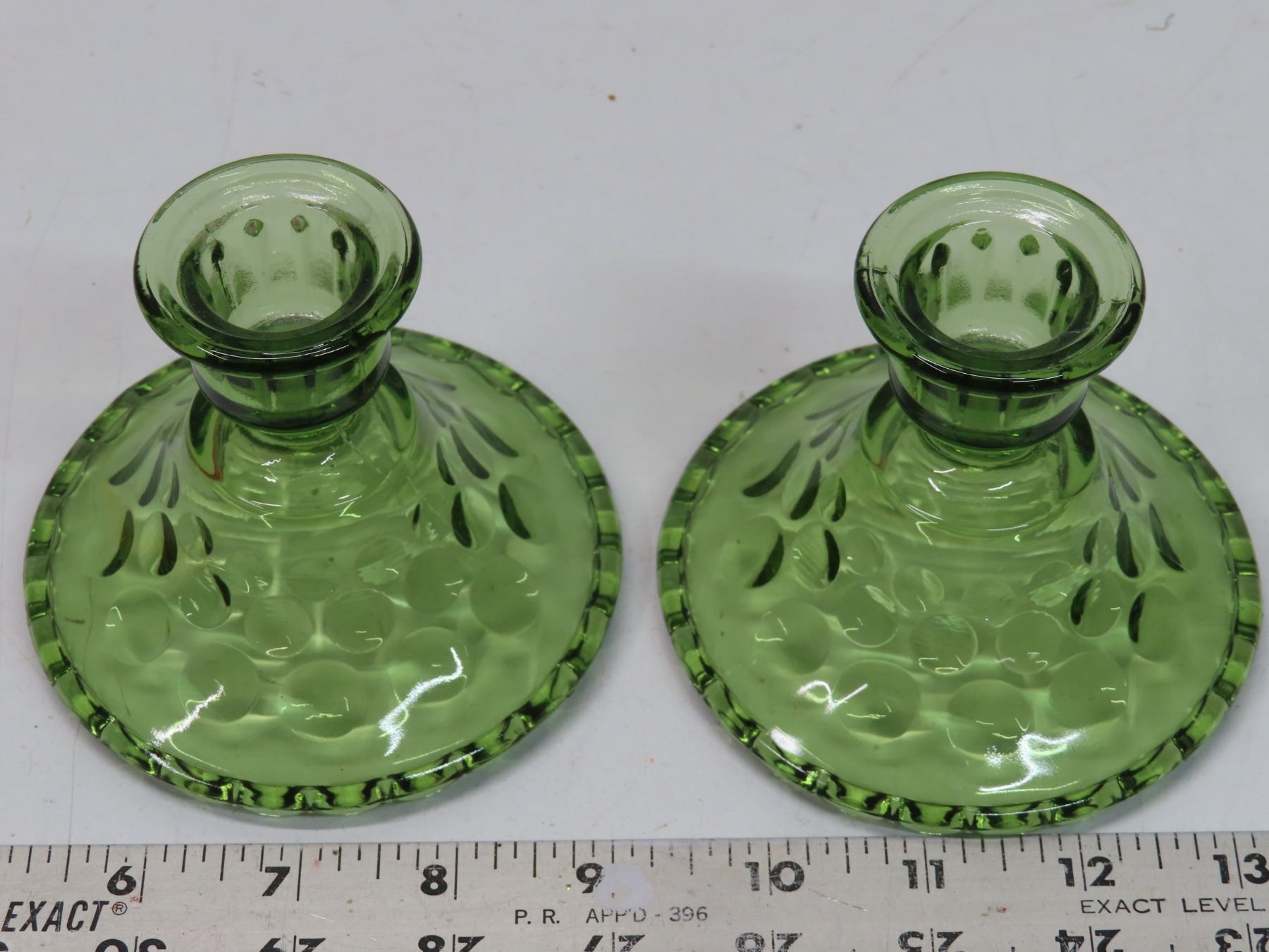 2 Green Depression glass candle holders + 2 taper candle sticks