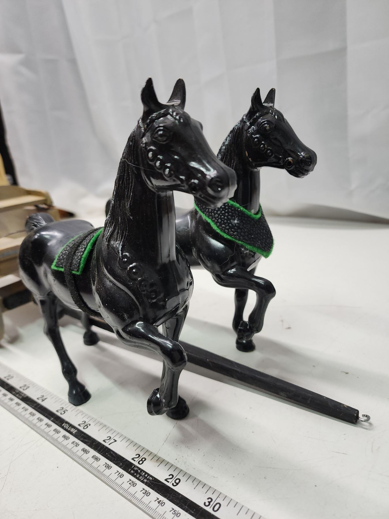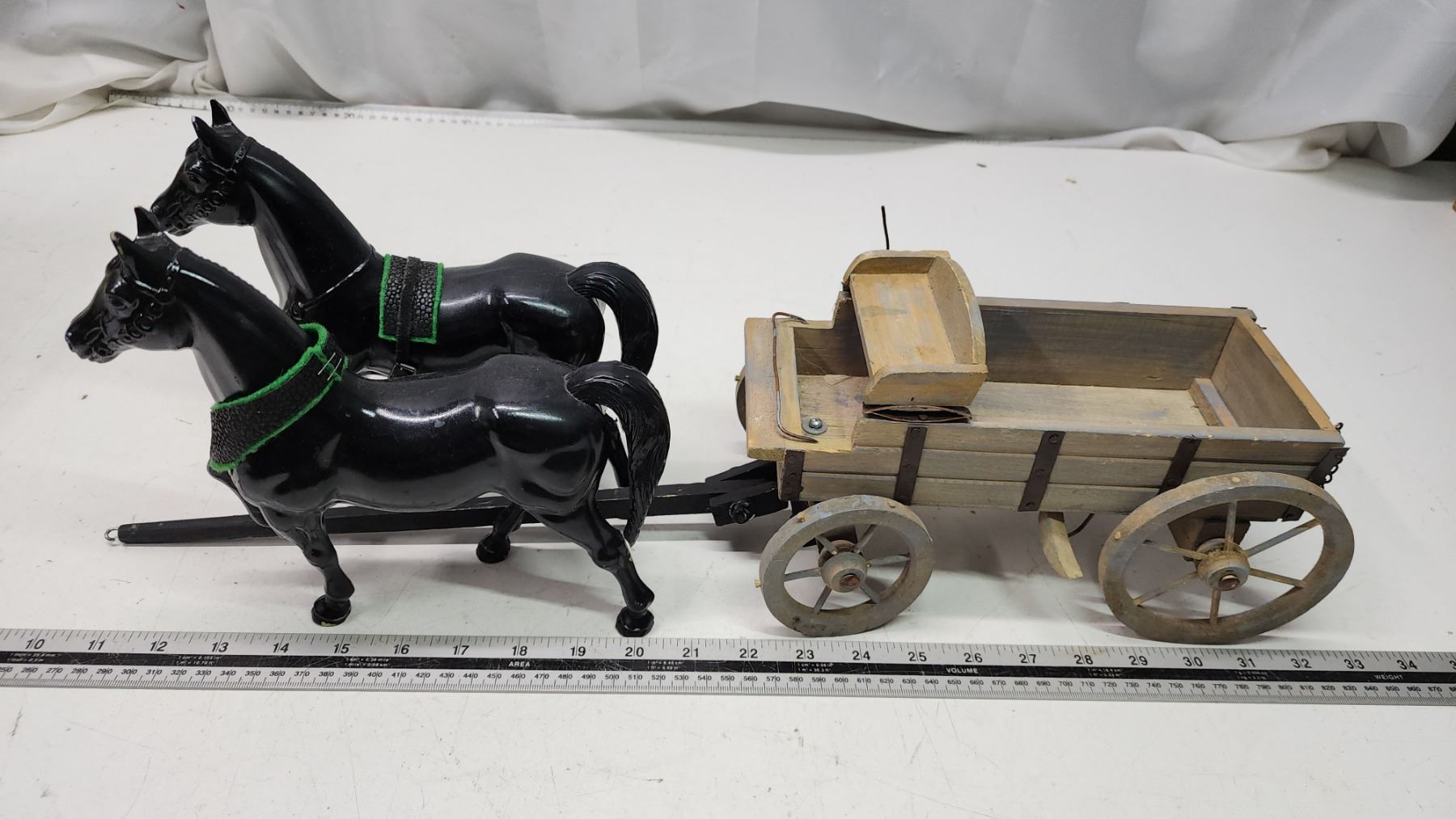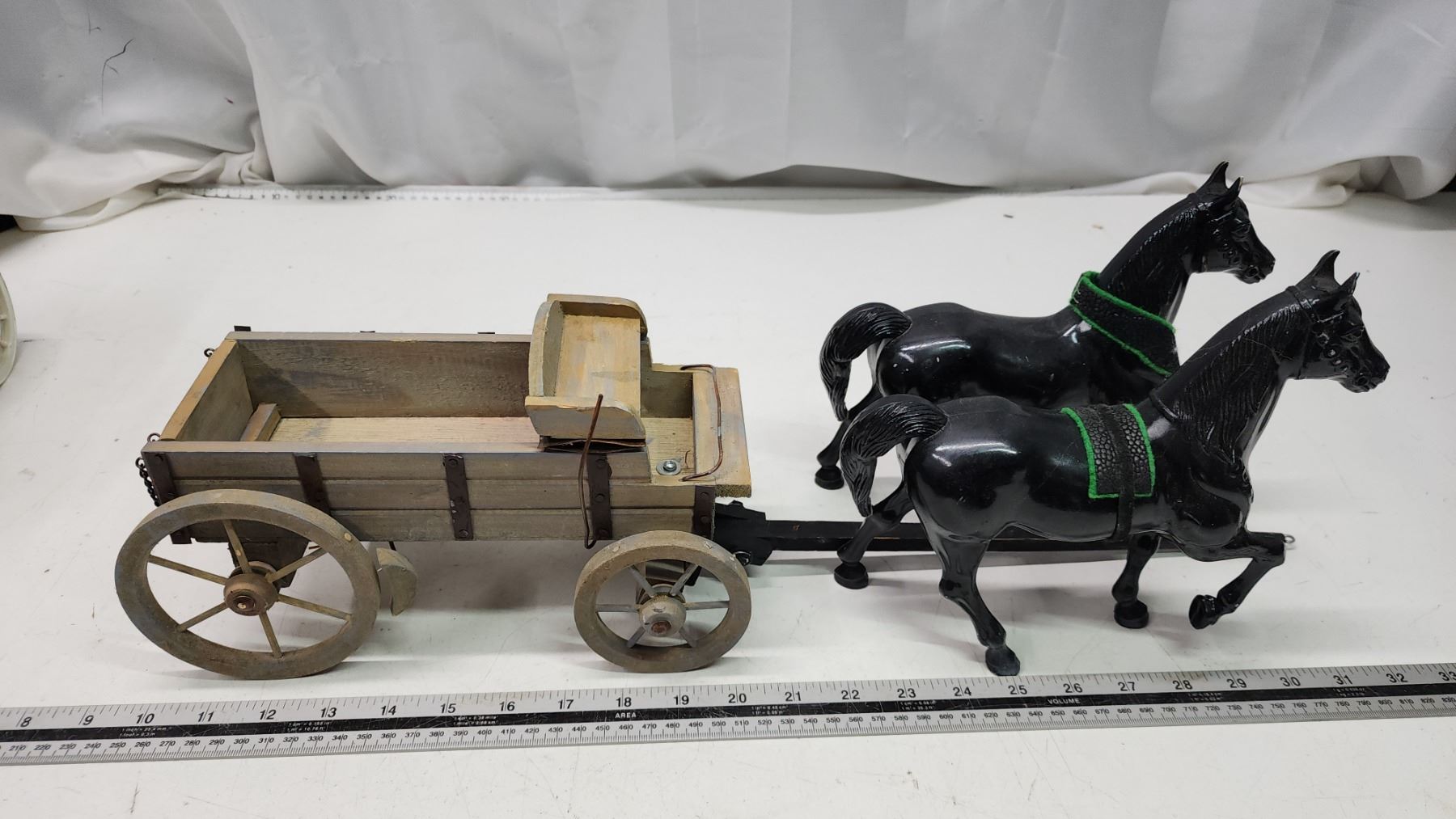 2 Horse figurines & wooden wagon