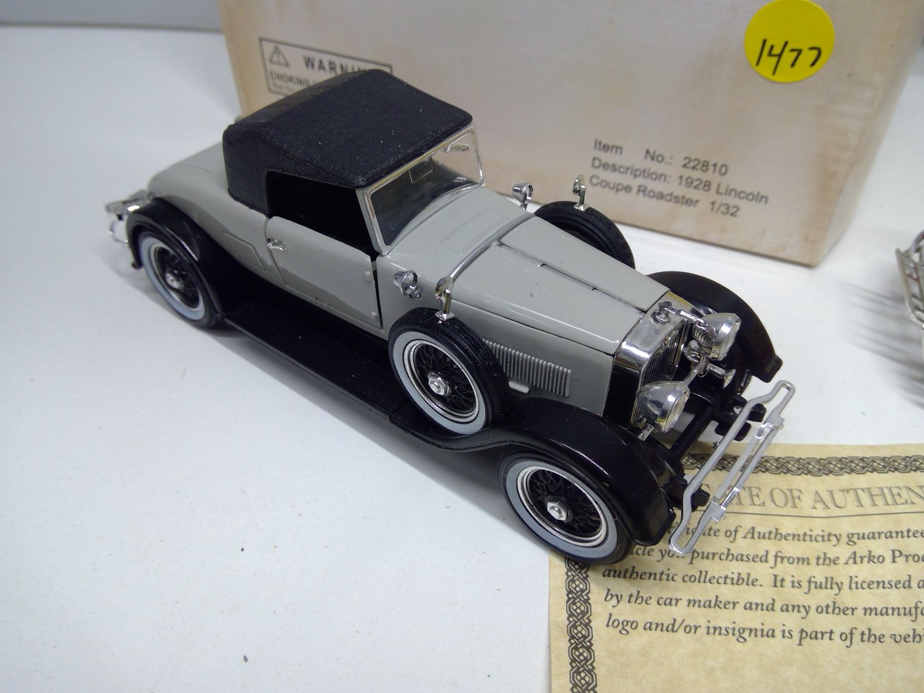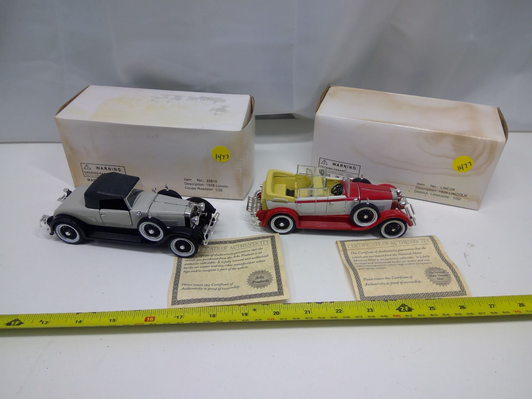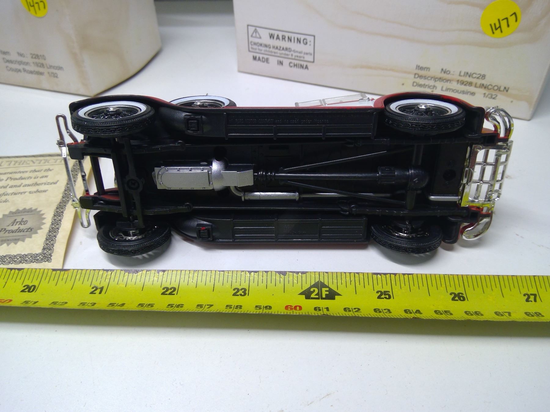 2 Model Lincoln Cars - 1928 Lincoln Coupe Roadster (1:32) and 1928 Lincoln Dietrich Limousine (1:32)