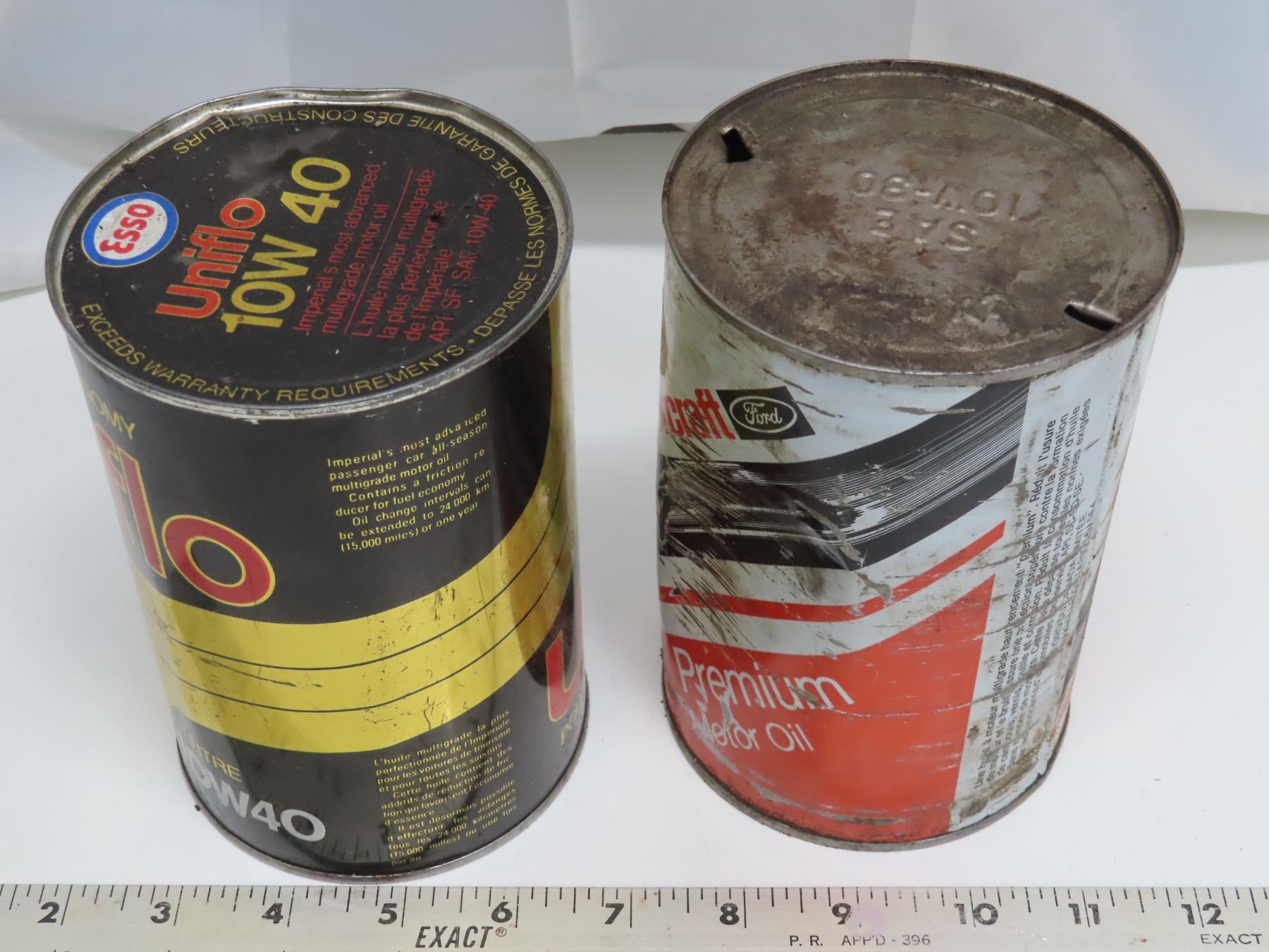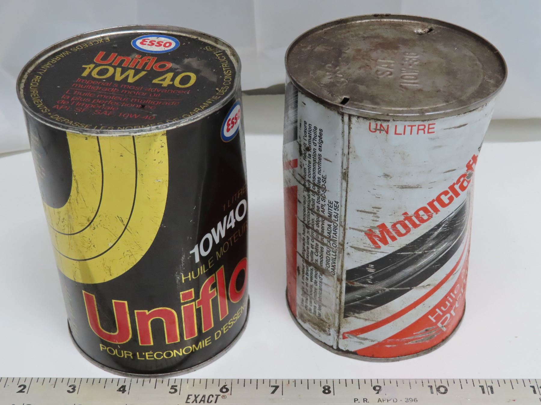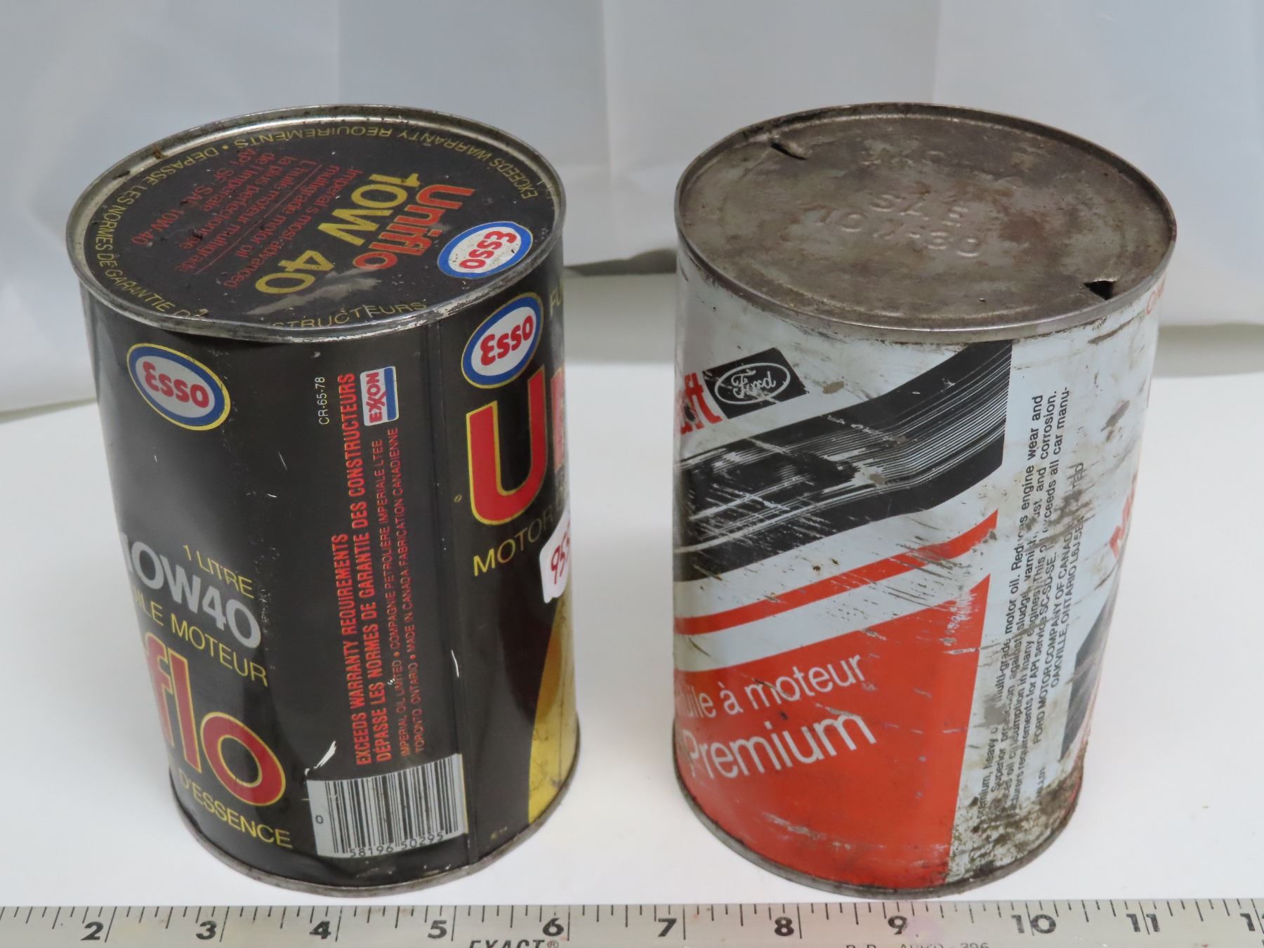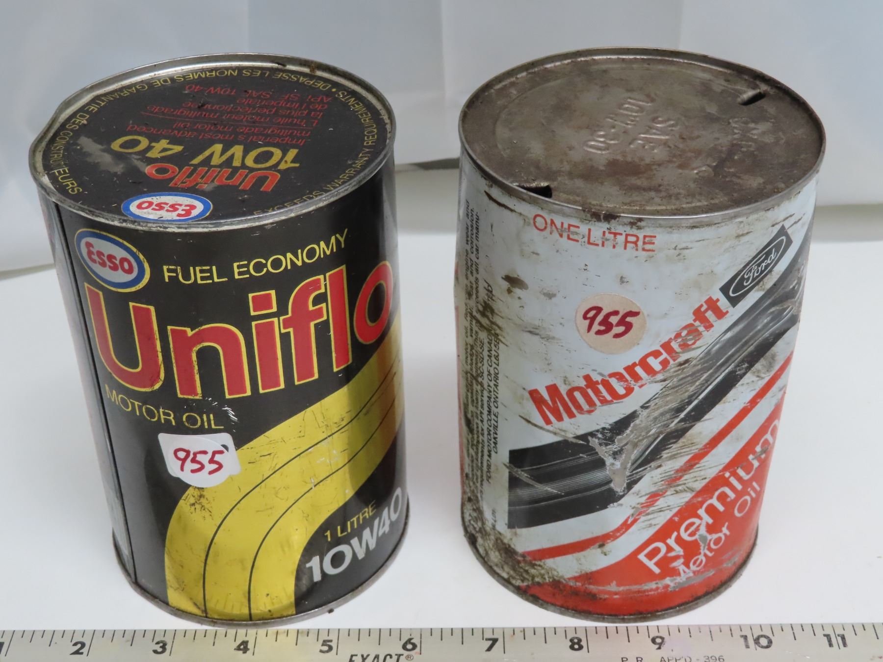 2 Motor oil 1 litre tins (Uniflo 10W40 = full, Ford Motorcraft Premium Motor oil=empty)
