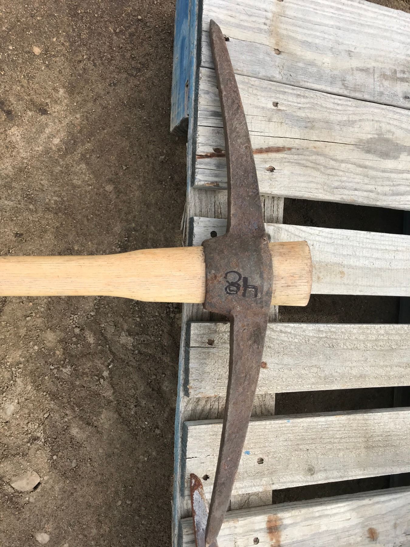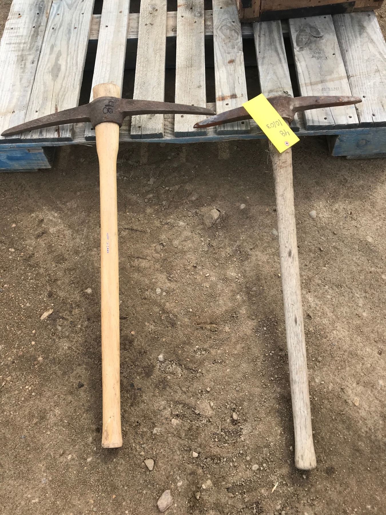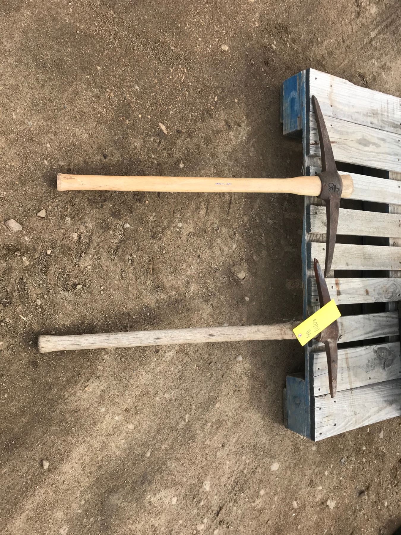 (2) PICK AXES (1) AXE HAS NEW OAK HANDLE