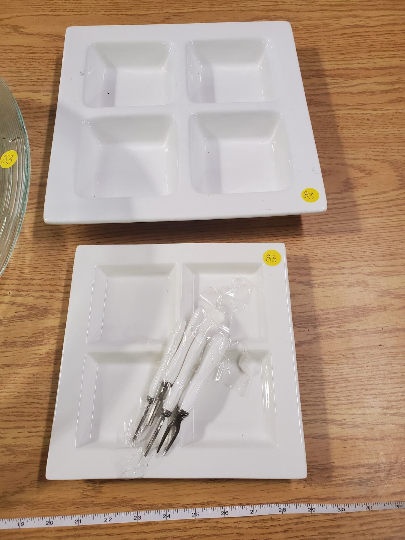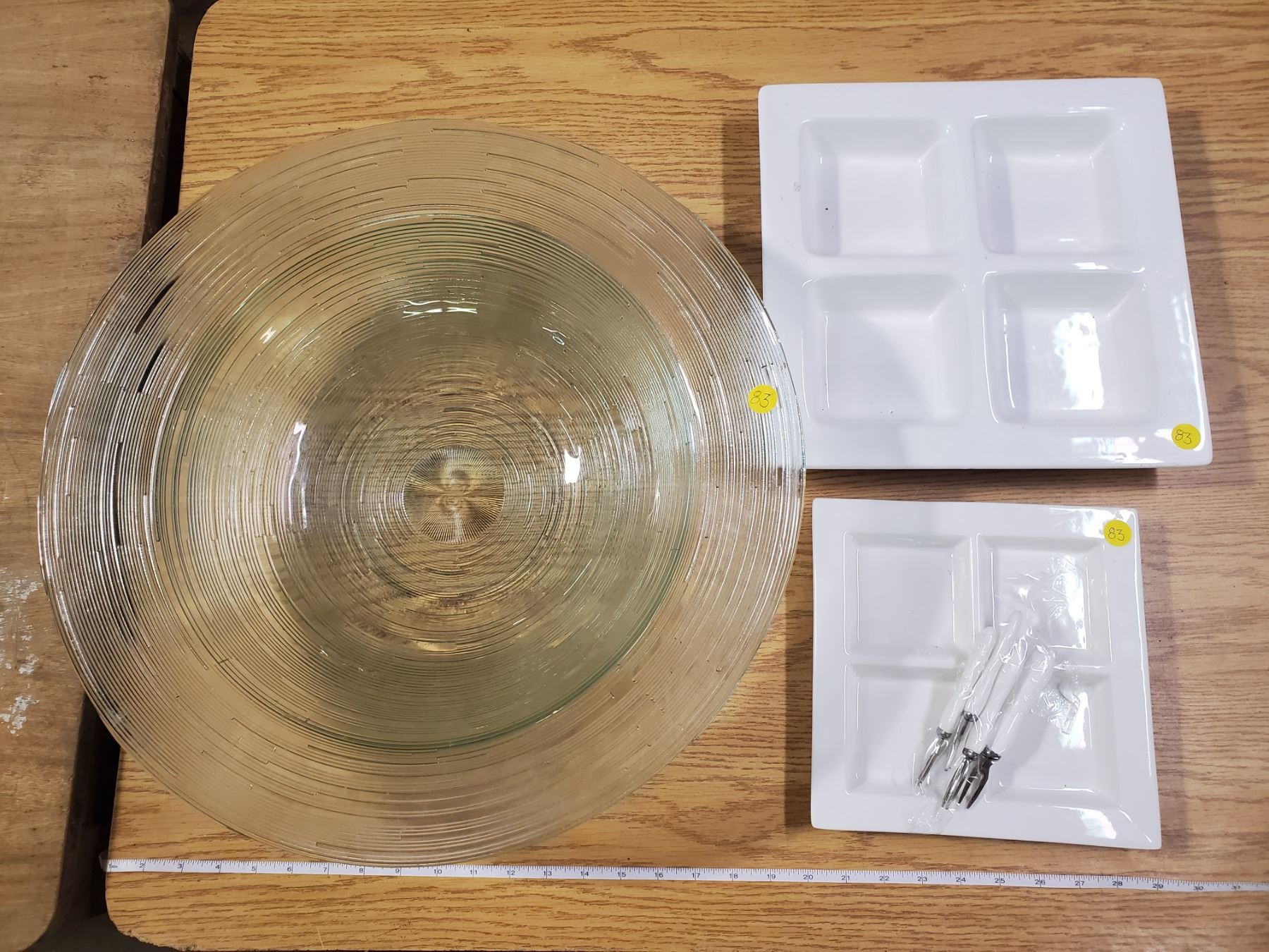 2 PICKLE SERVING TRAYS W/ FORKS & LARGE GLASS FRUIT BOWL