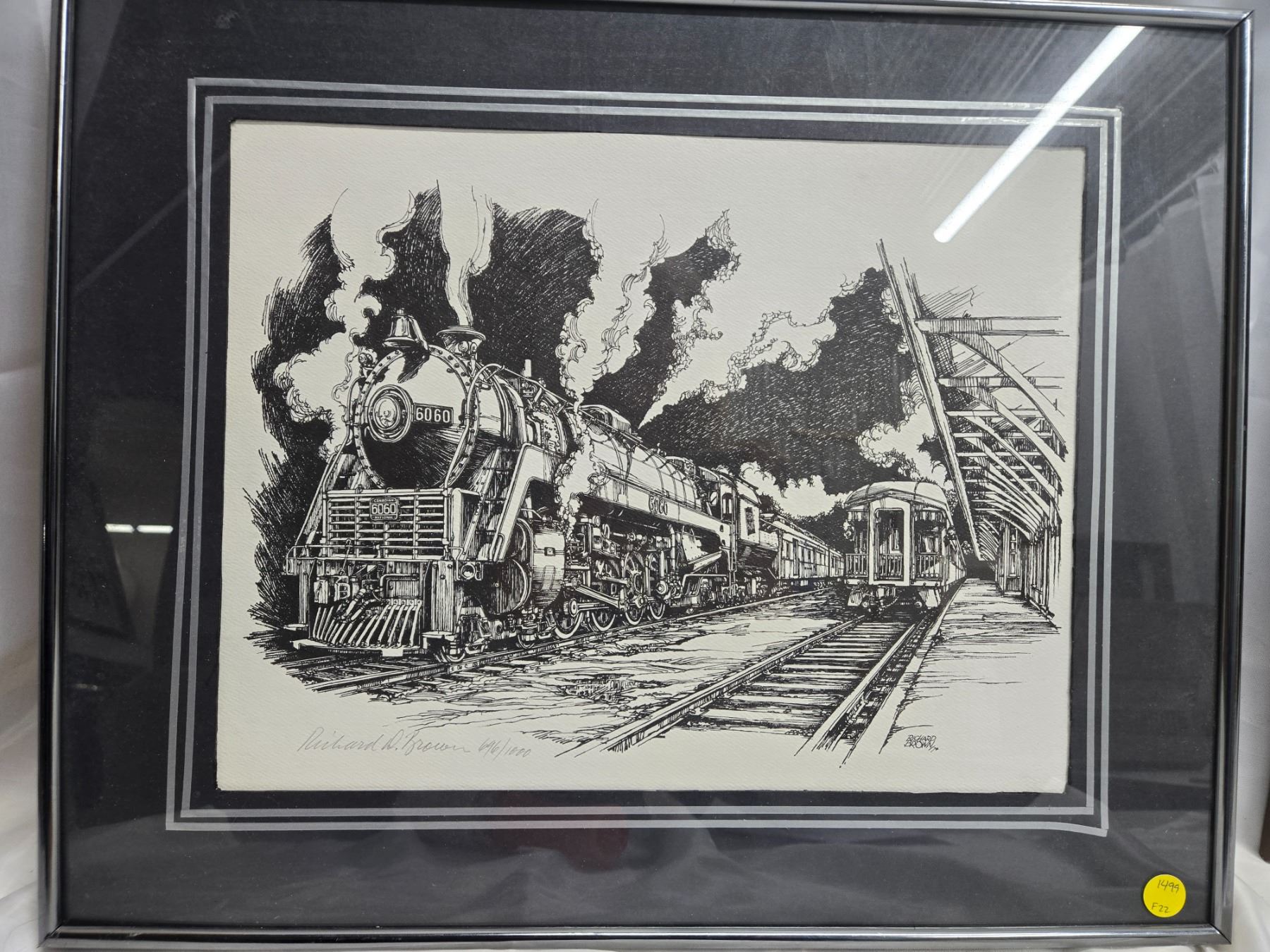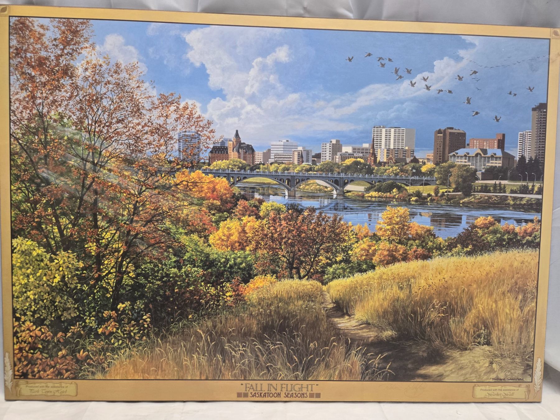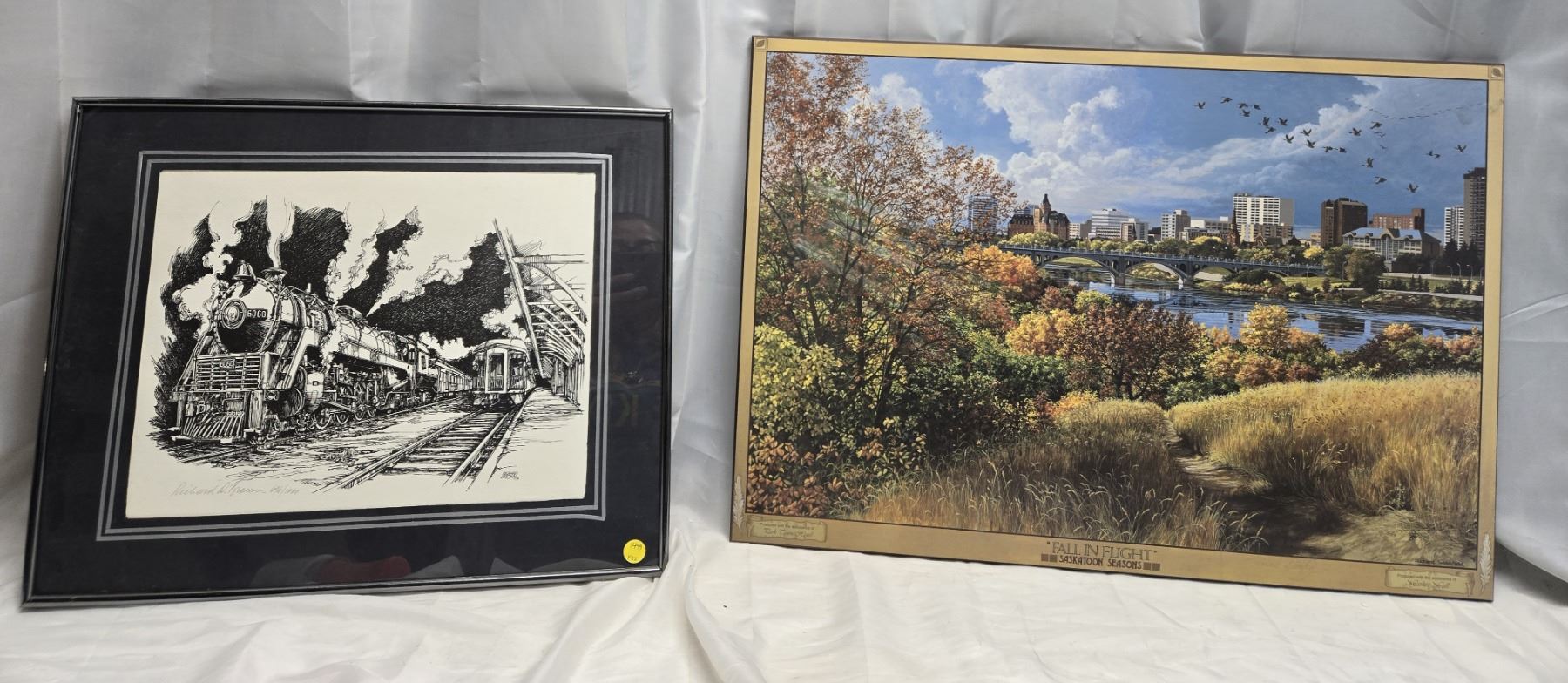 2 PICTURES. RICHARD BROWN 696-100 "TRAIN STATION 16X20/FALL IN FLIGHT, SASKATOON 26.5X18.5