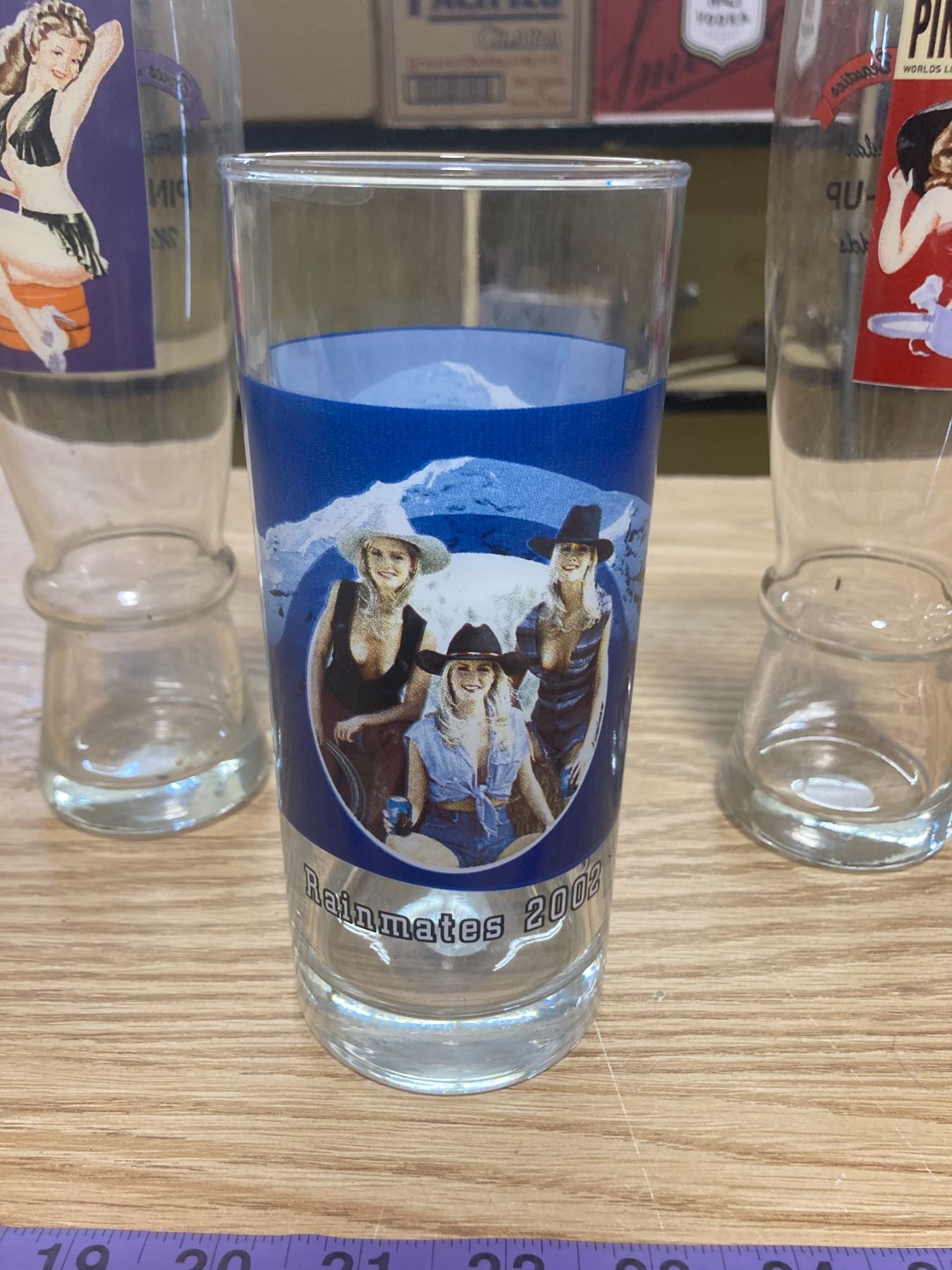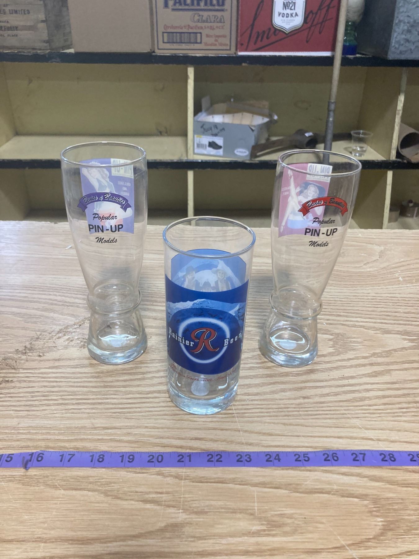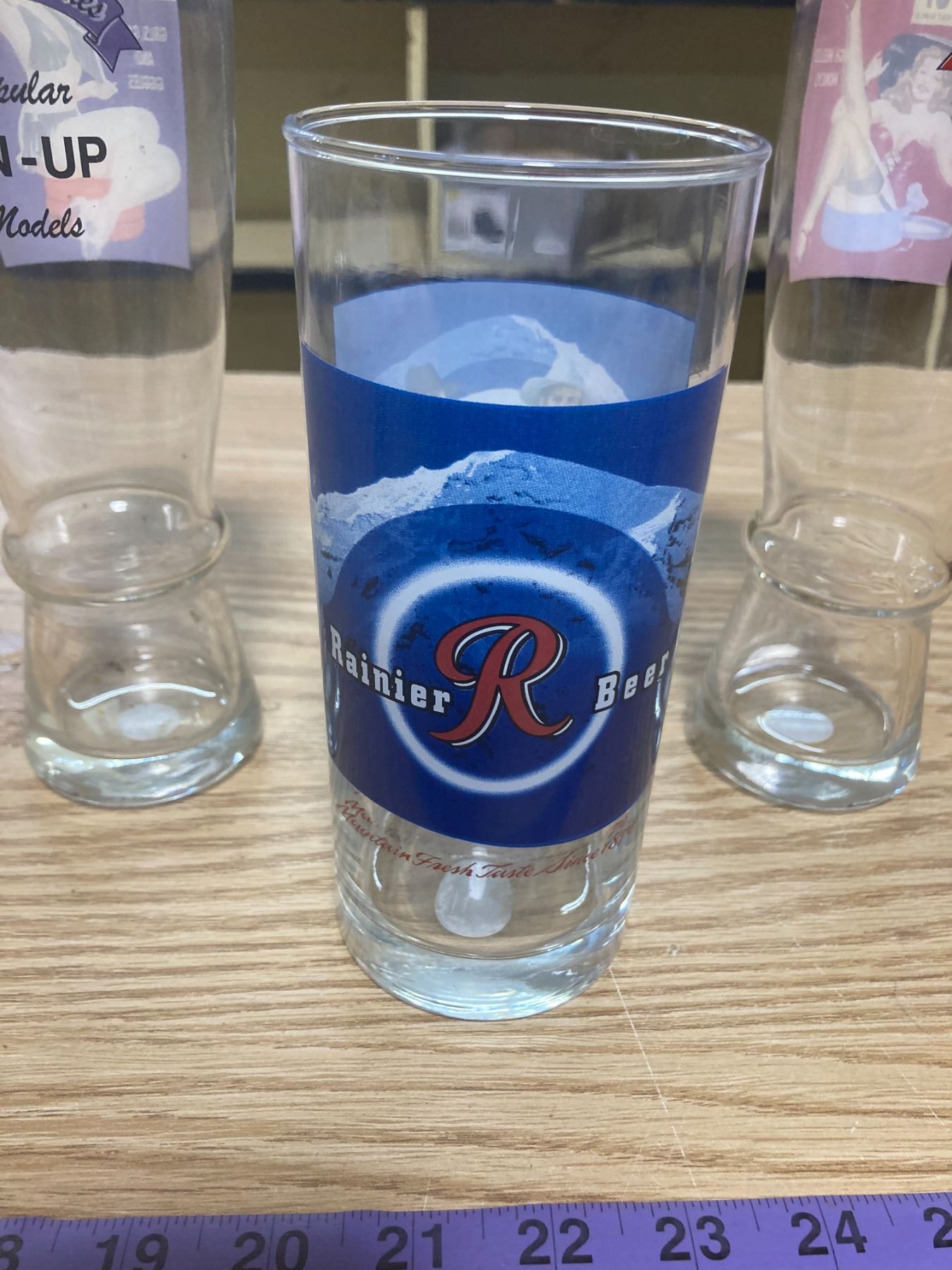 2 PIN-UP GLASSES + RAINIER R BEER GLASS