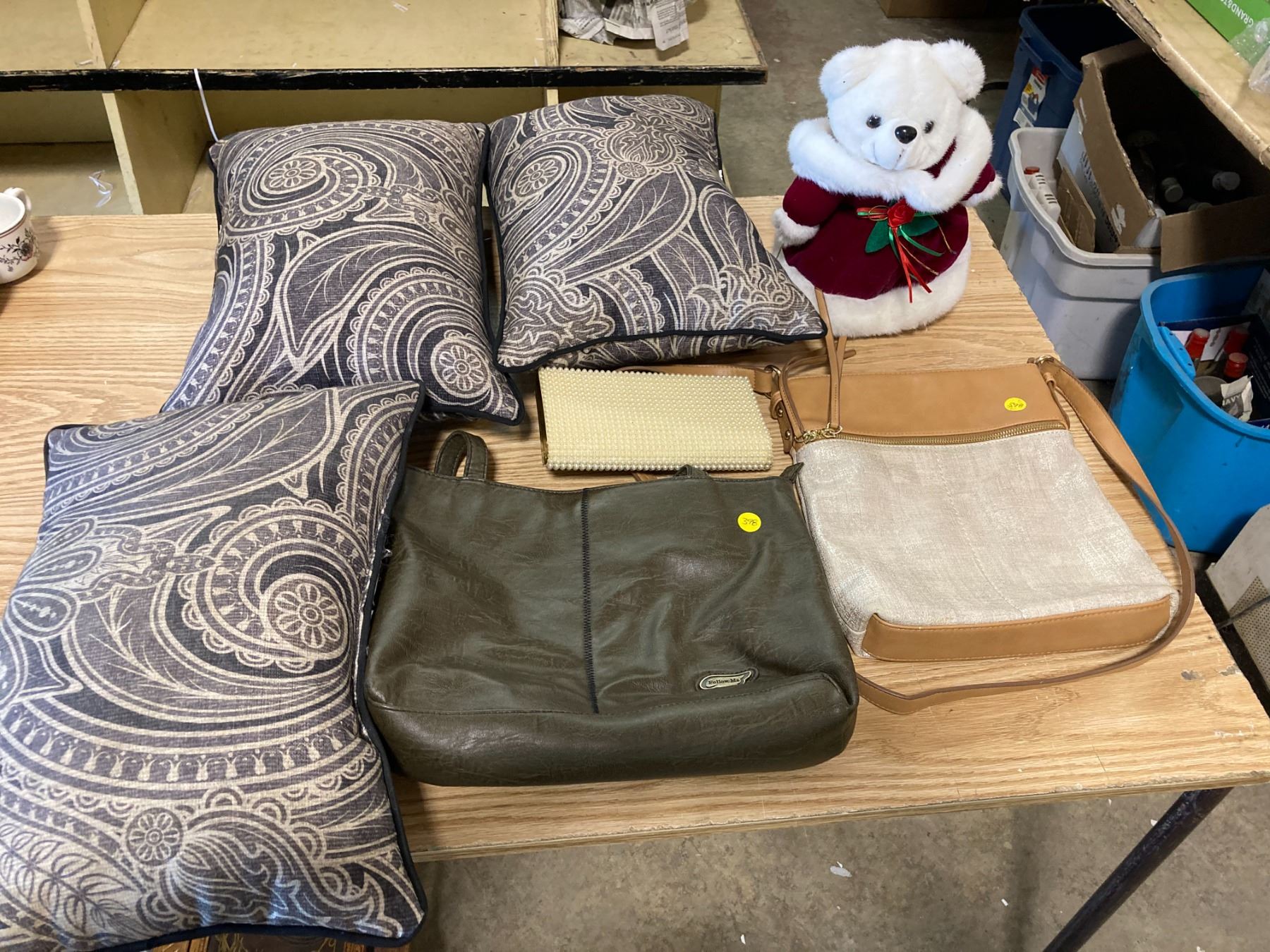 2 PURSES + WALLET + 3 CUSHIONS + CHRISTMAS TEDDY