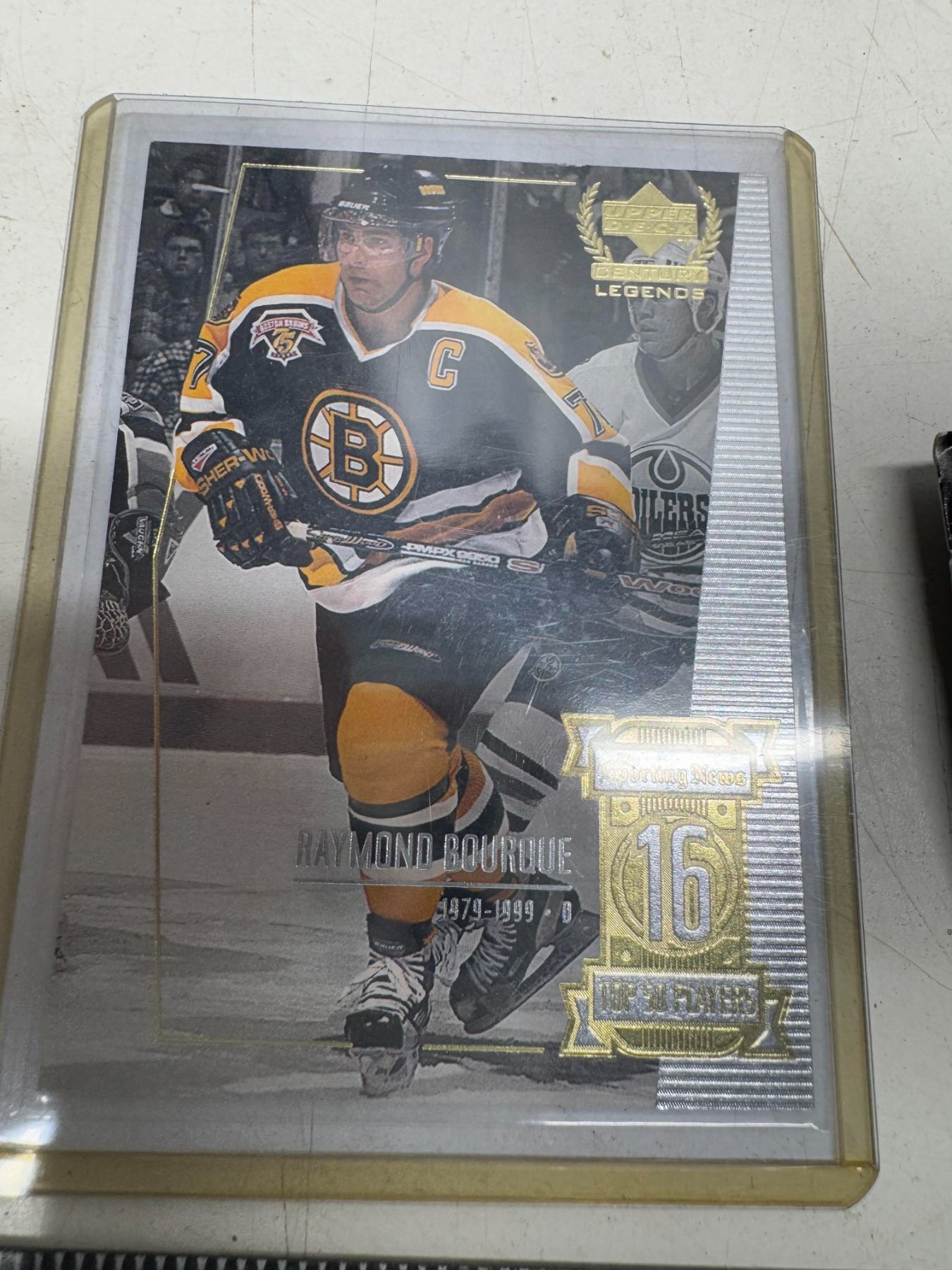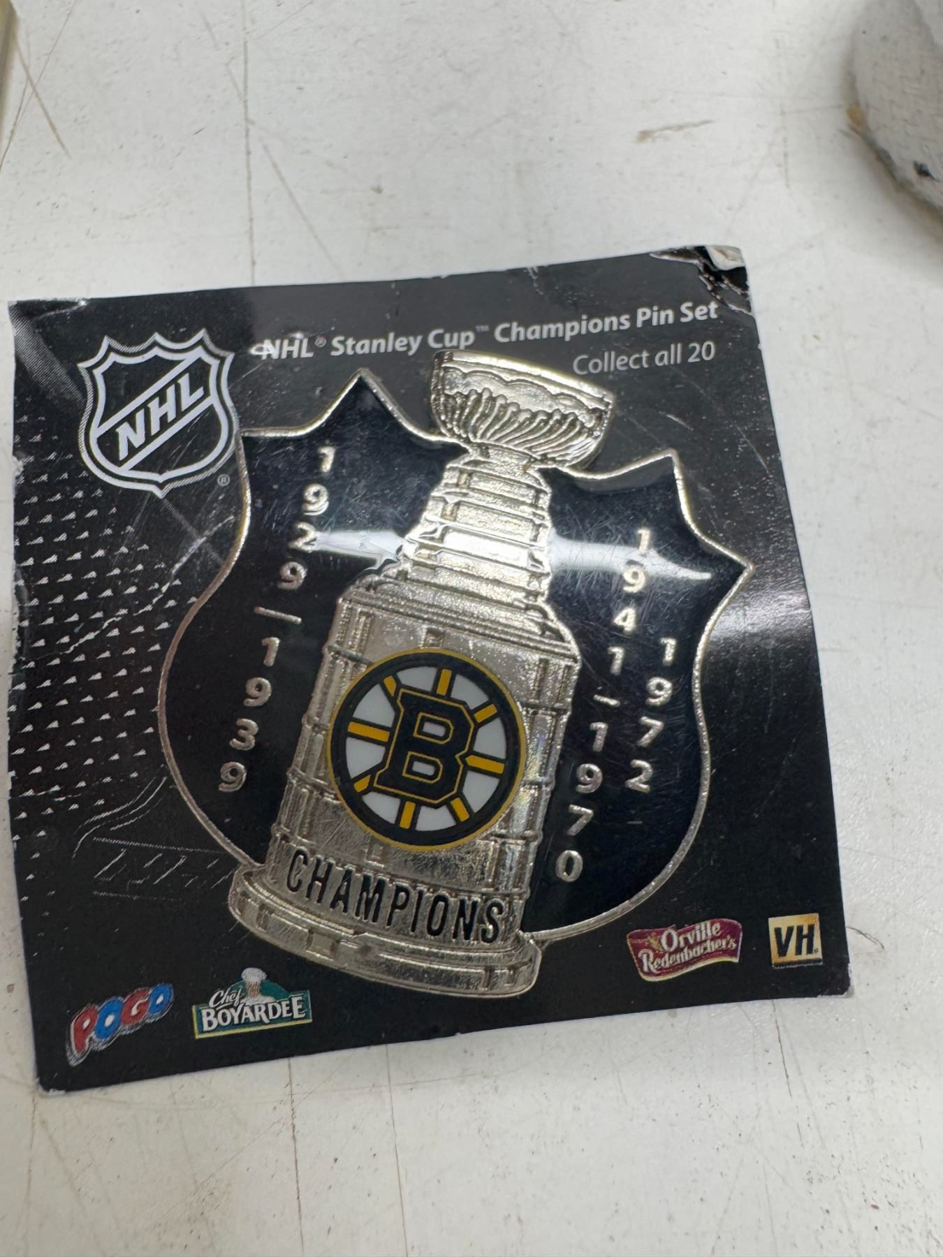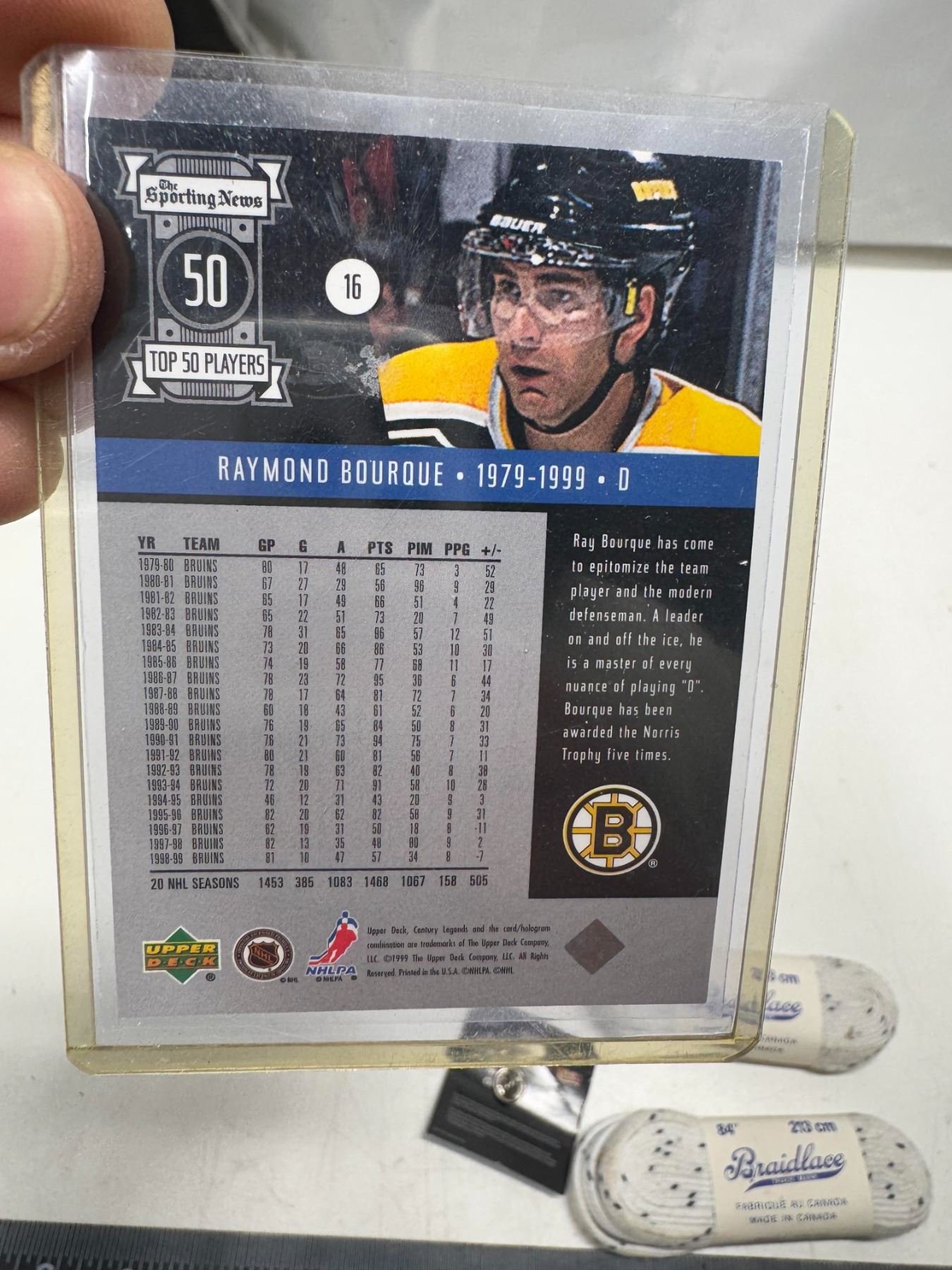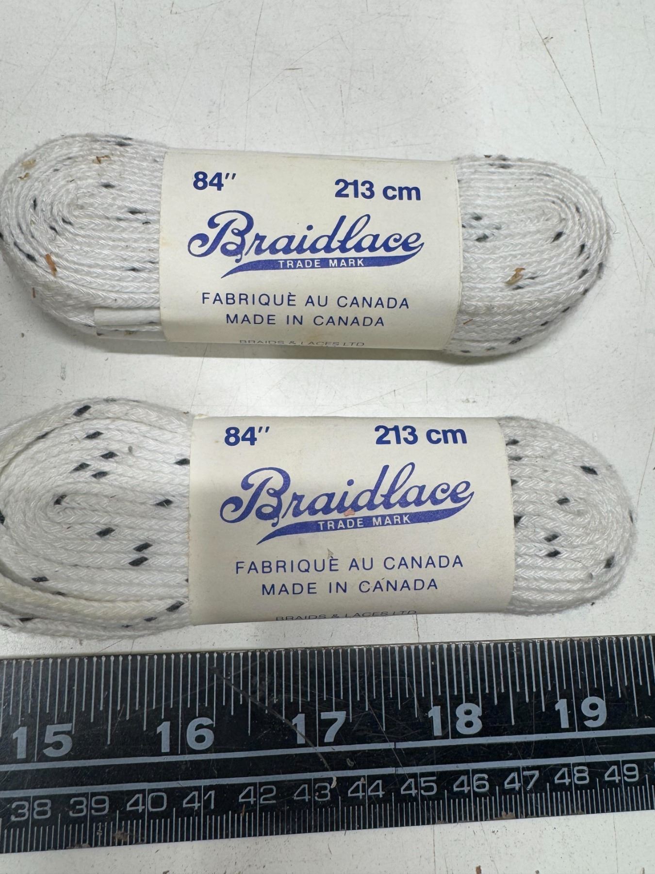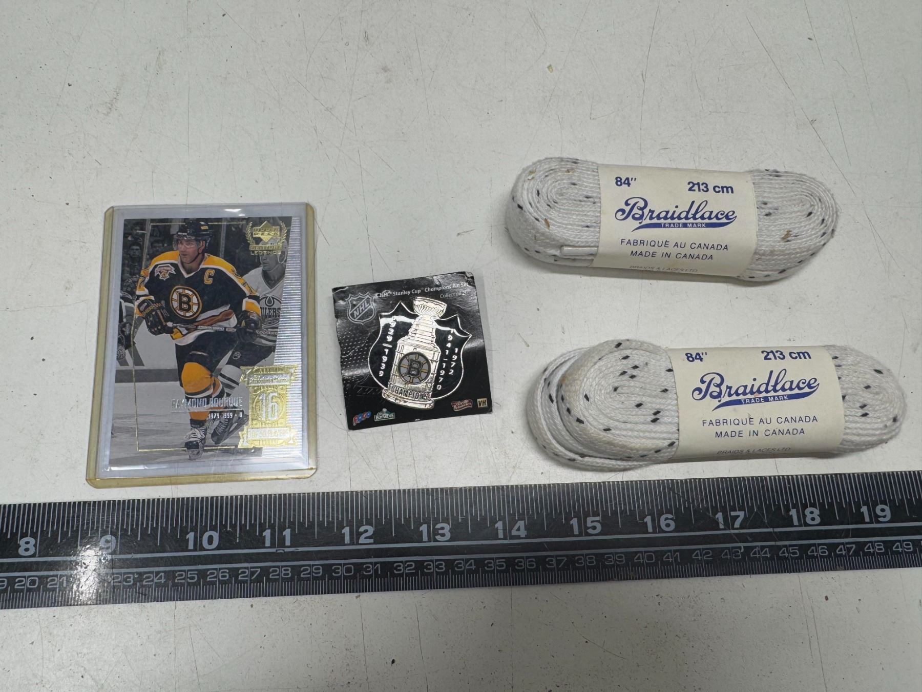 2 Pair Skate Lases, Lapen Pin (Boston) and Bourque Hockey Card.