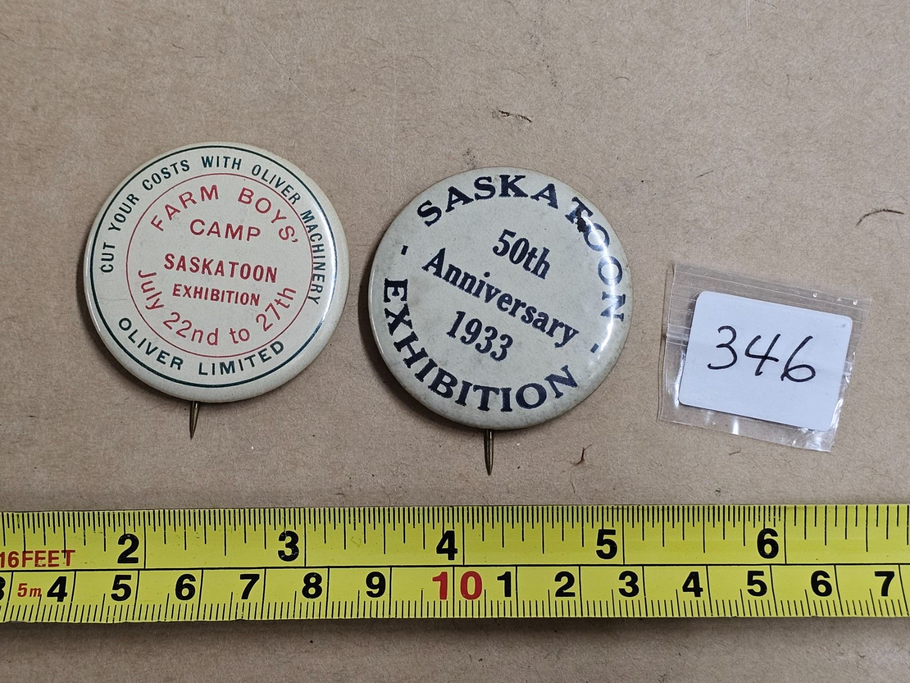 2 Pinbacks - Saskatoon 1933 Exhibition 50th Anniversary and 1933 Oliver Machinery