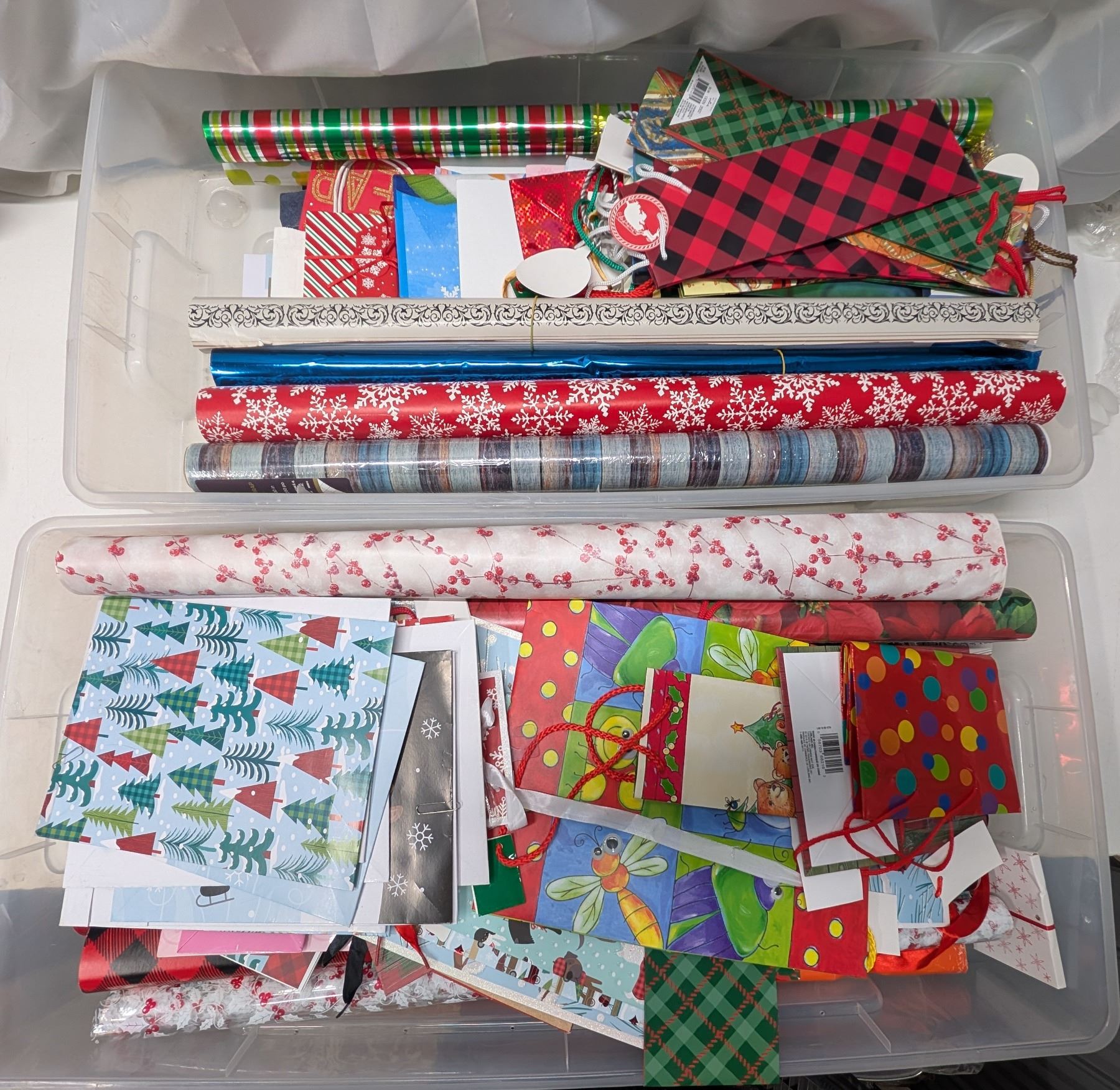 (2) Plastic Tubs Full of Misc. Christmas Gift wrapping and etc.