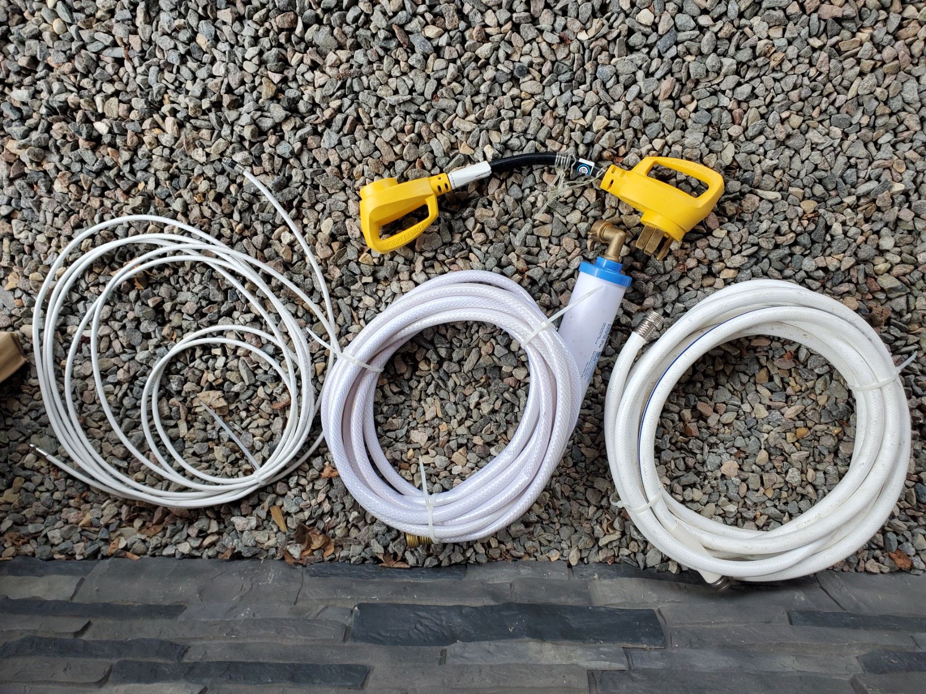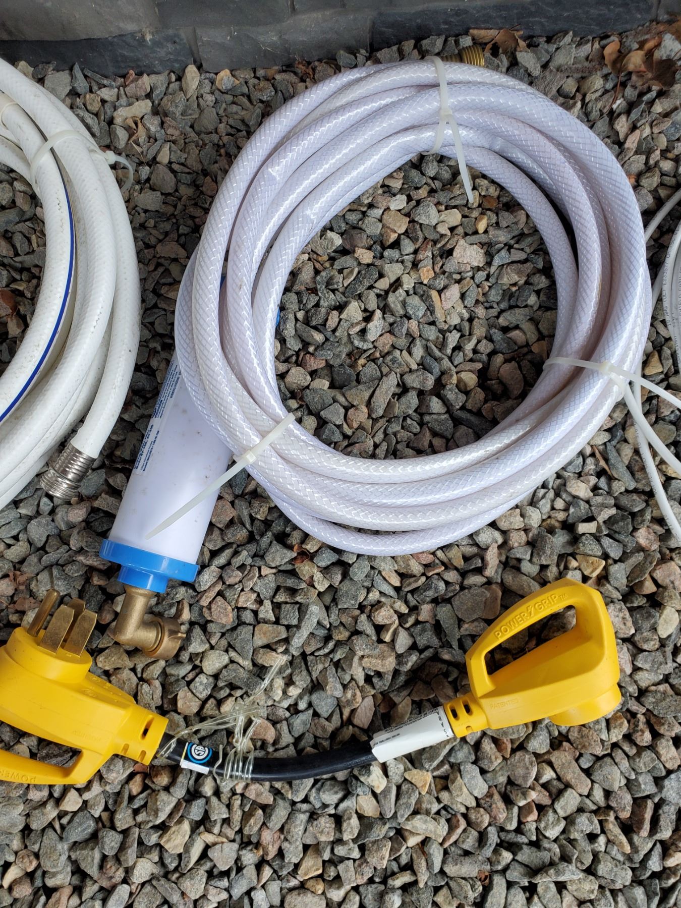 2 Potable Water Supply Hoses + Like New In-Line Filter + 50' Coaxial Cable + 30amp-50amp Electrical Adapter