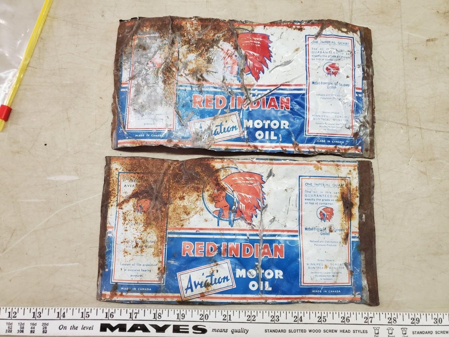 2 RED INDIAN FLATTENED OIL CANS