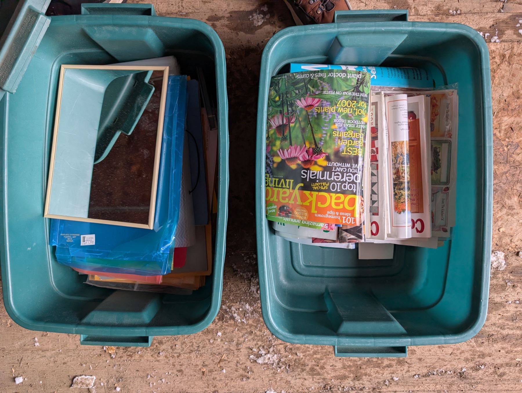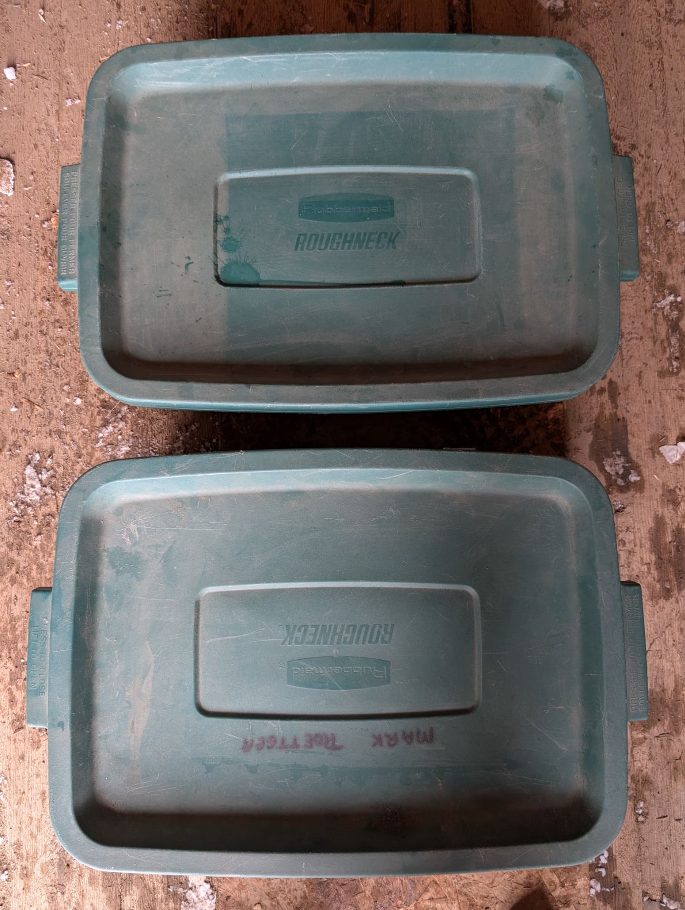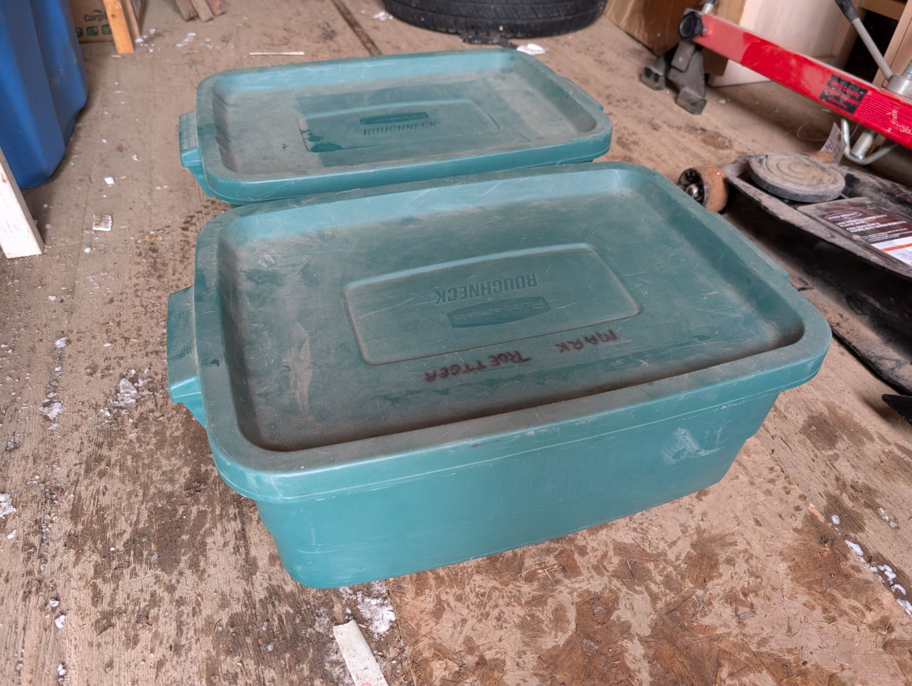 (2) Roughneck Rubbermaid Storage Tubs w/ Misc. (24"x9"x16")
