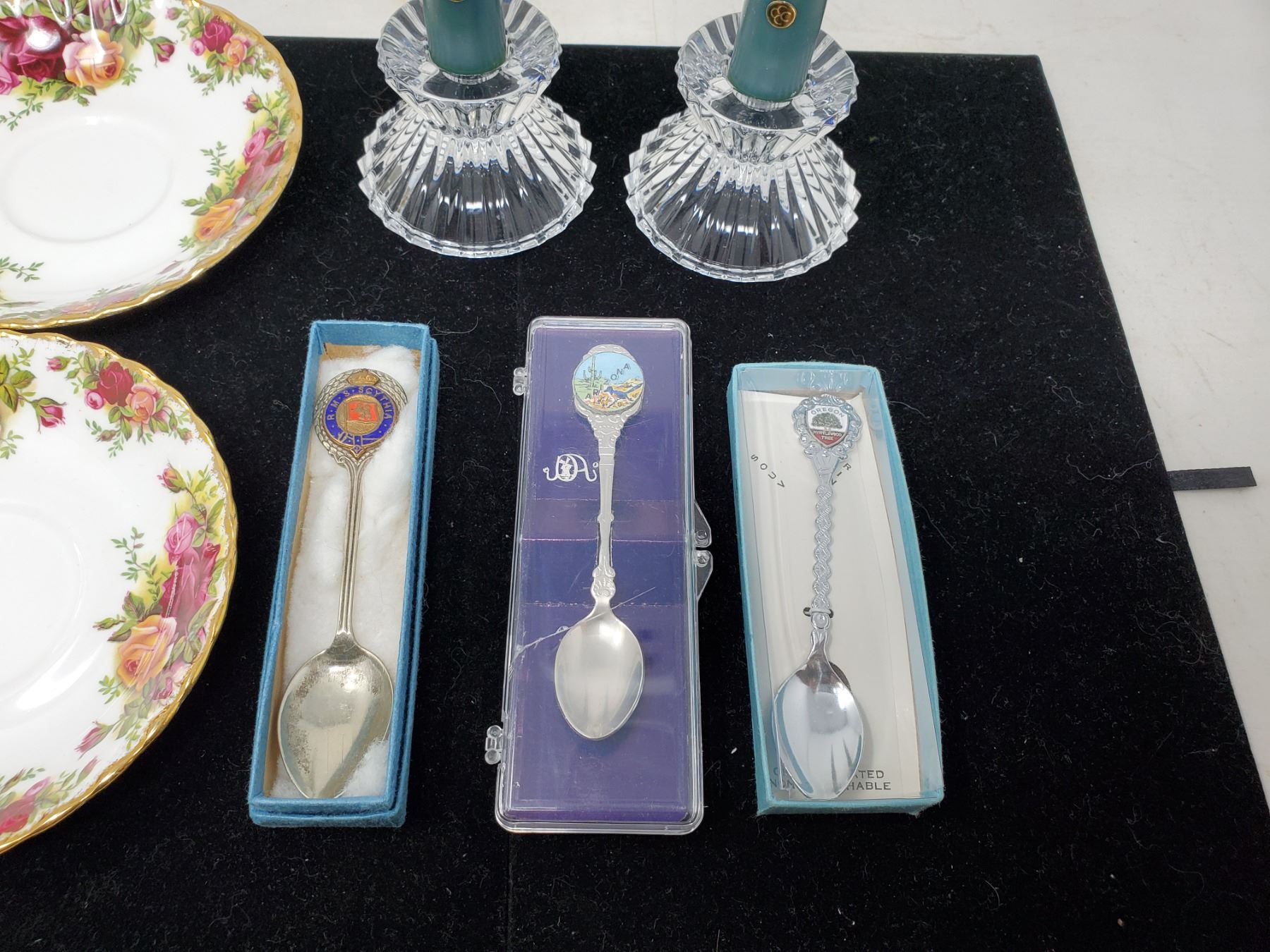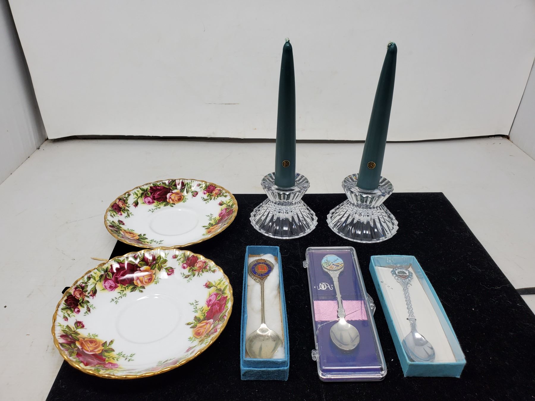 2 Royal Albert Old Country Roses Saucers, 3 Collector Spoons and Pair of Candlesticks