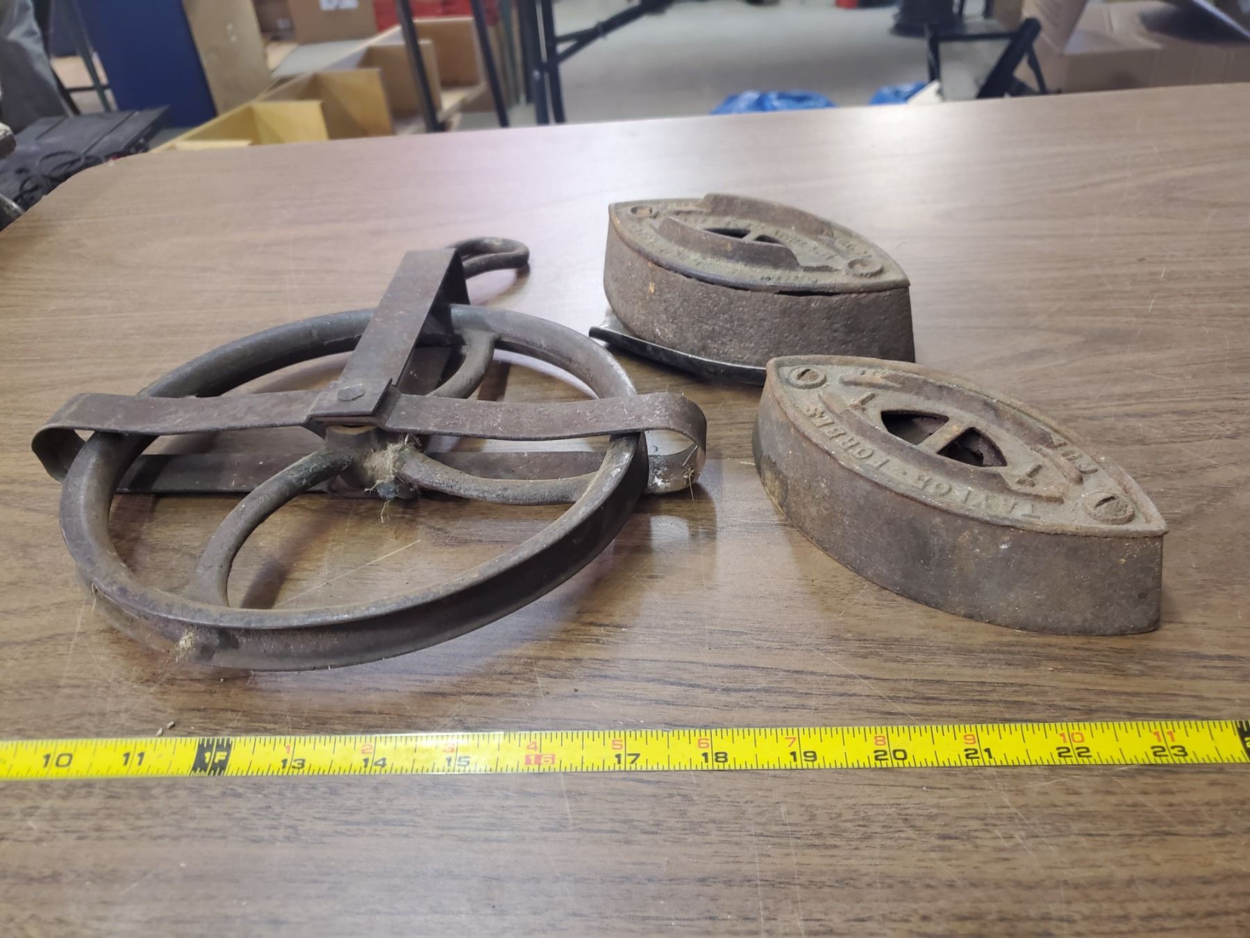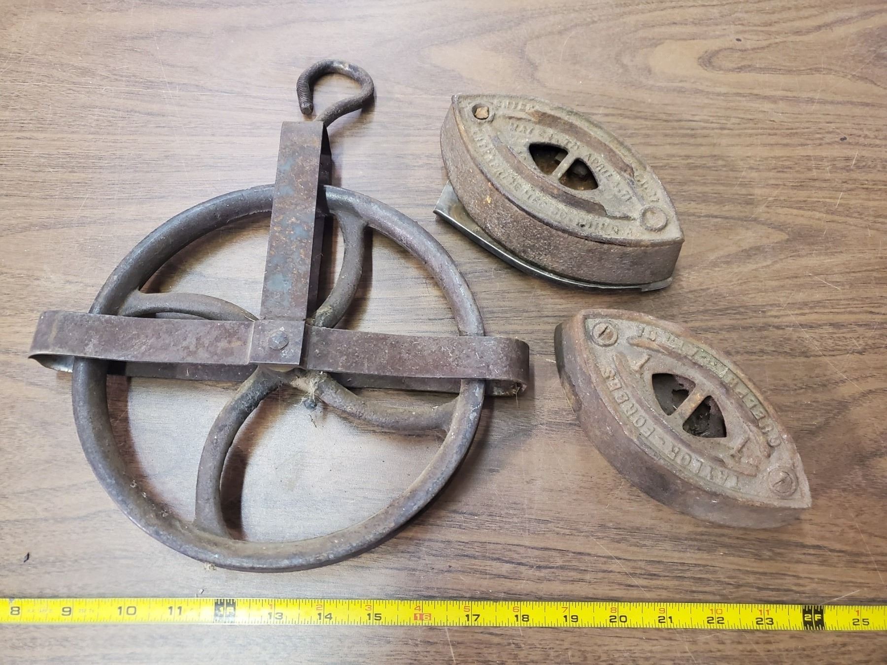 2 SAD IRONS, 1 TRIVET & OLD PULLEY