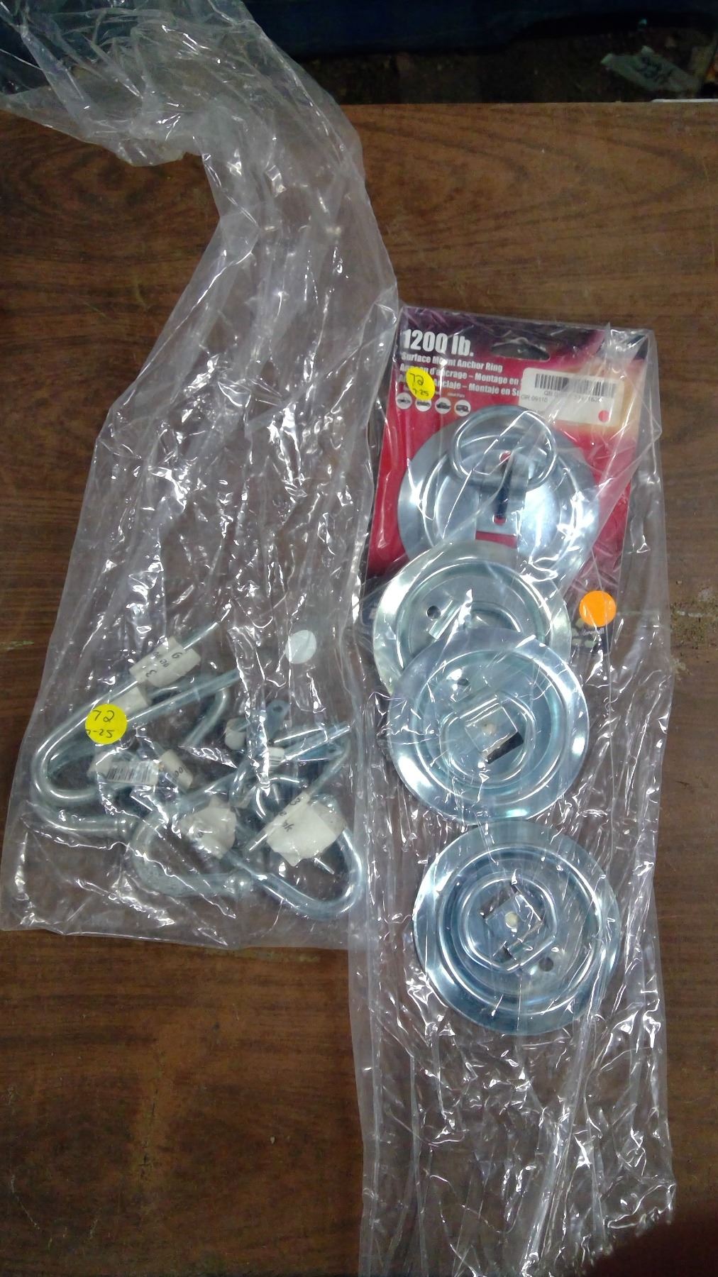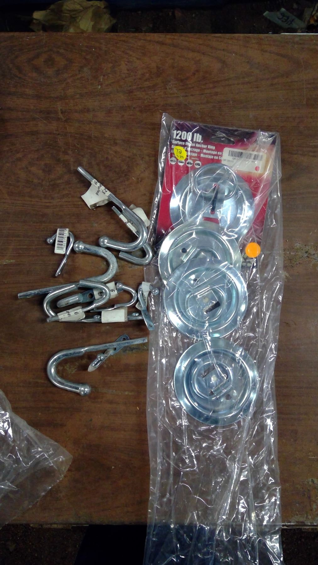 2 SURFACE MOUNT ANCHOR RINGS, LOT OF CAMPER ROPE HOOKS